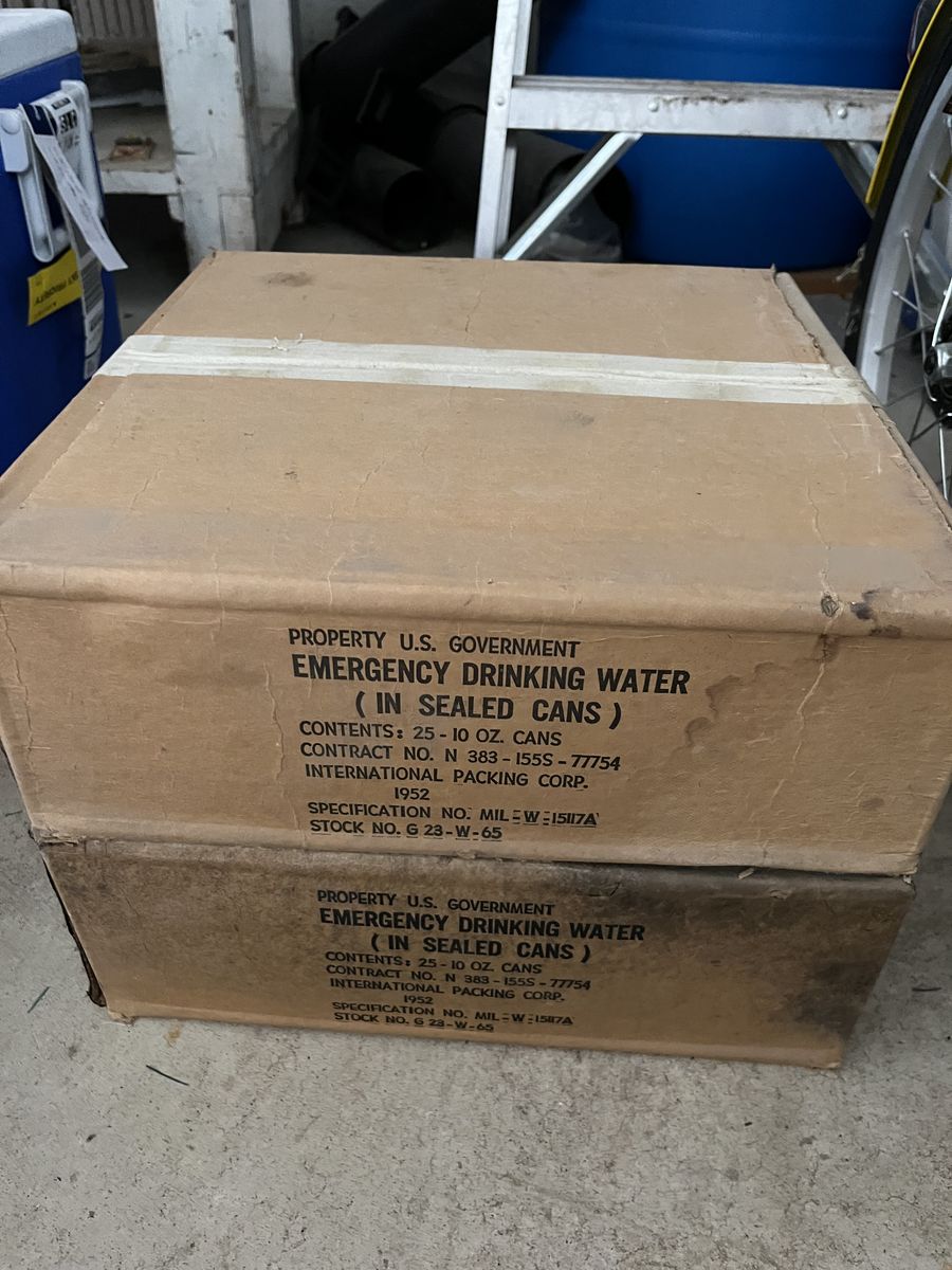 Two unopened 1952 Vintage Government Emergency Drinking Water for sale cans and boxes in great condition asking $100 a case also have a open case willing to sell individual cans.