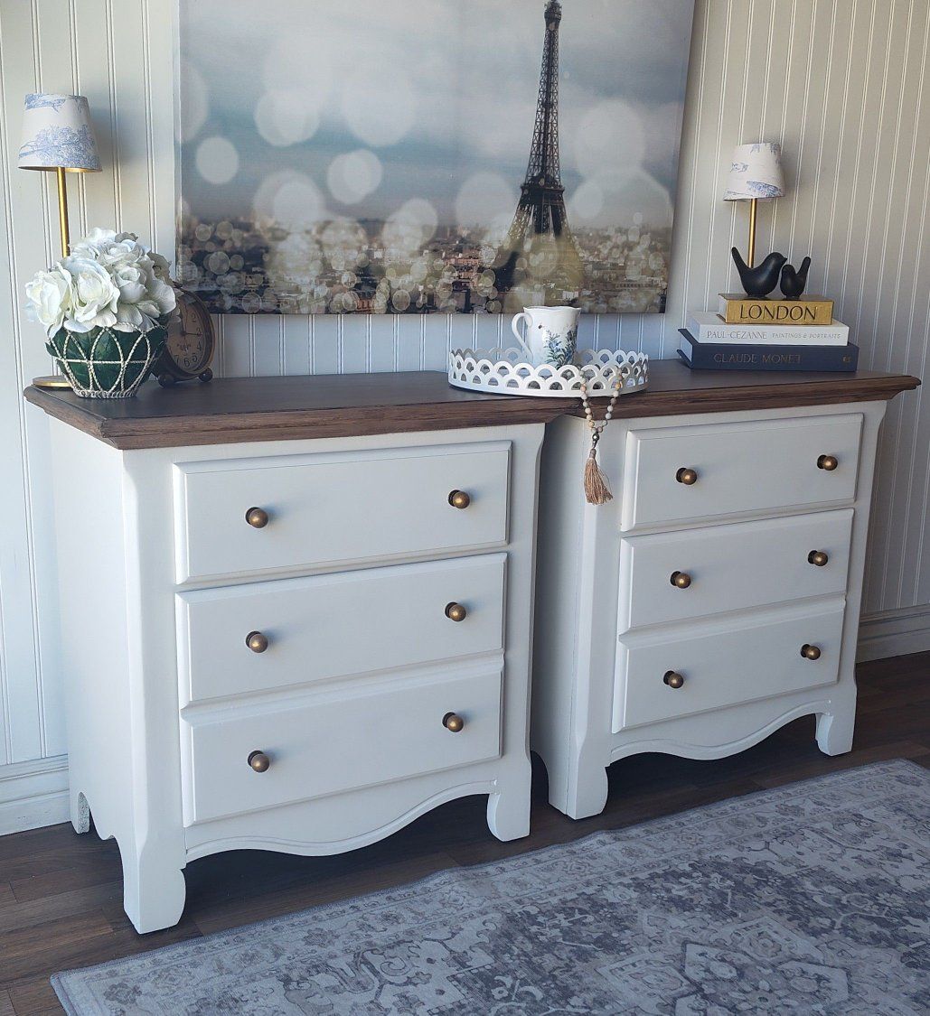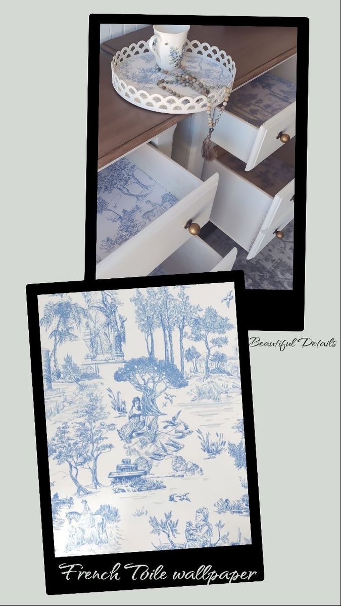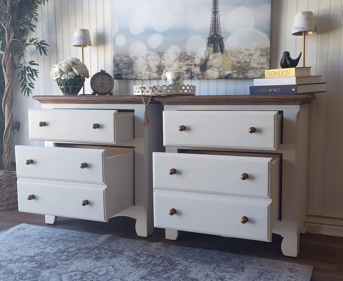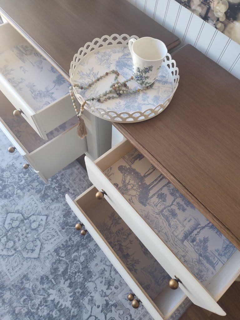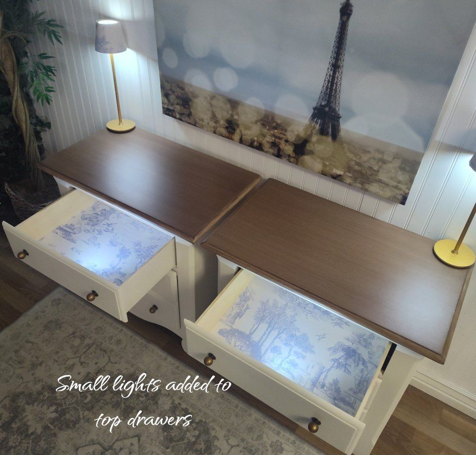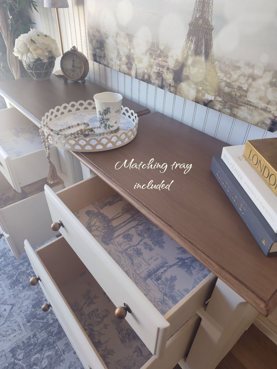 These feature: • Dovetail construction • 100% solid wood • Reinforced joints • Backs and Bottoms refinished as well • Bottom drawer is very deep, offering plenty of room for storage • All drawers operate smoothly on metal rails • Bumper pads added to drawers for soft closing • Wax sealed interiors • Professional grade enamel cabinet paint • French Toile wallpaper - sealed for long-term adhesion • Brushed-on (painted) cool walnut grain on the tops (no orange tones- Pottery Barn technique) • New antiqued-brass hardware • New felt feet/risers protect furniture • Padded/Foam wrapped for protection in transfer • Small on/off lights in top drawers in case of power outages or emergencies • Matching tray included