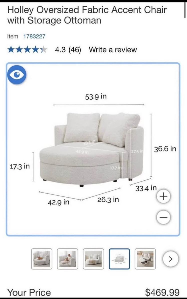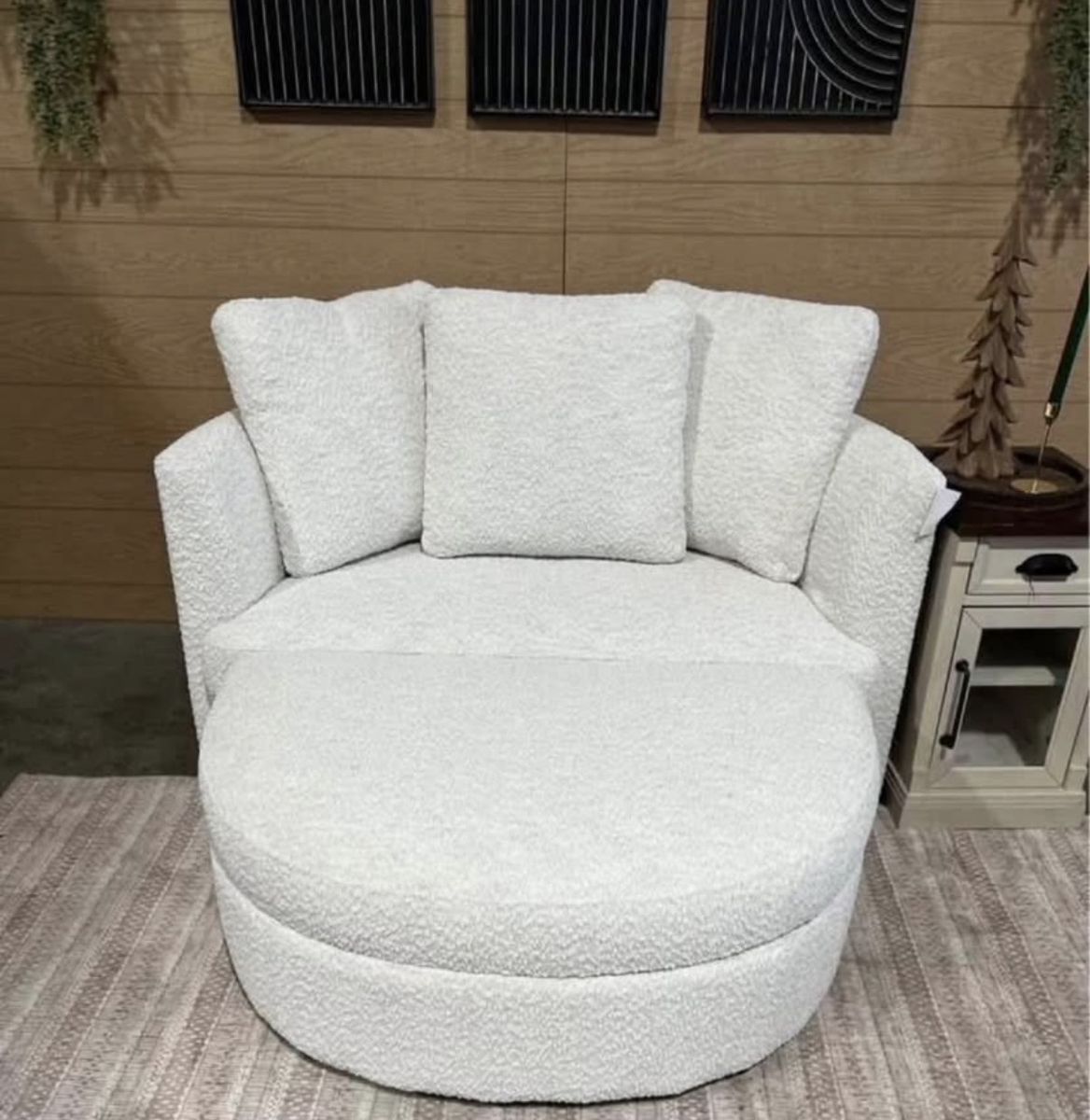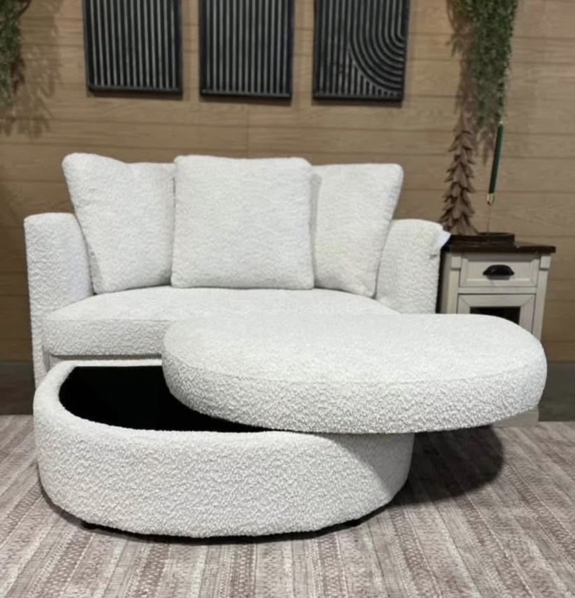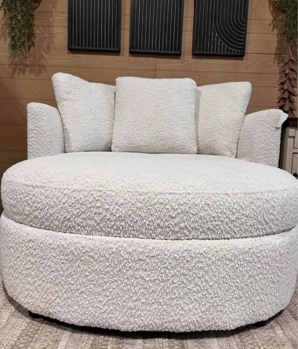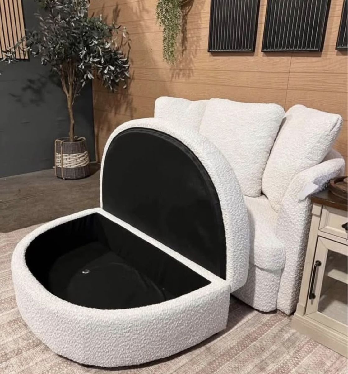 Holley Accent Chair with Storage Ottoman Refined Comfort in Every Detail Transform your living space with the sophisticated design of the Holley Accent Chair & Ottoman, adorned in our elegant light cream boucle fabric. Perfect for two, this spacious chair invites you to unwind and indulge in its comfortable shape. The ottoman includes a removable top that reveals a convenient storage compartment, ideal for keeping blankets, books, or magazines within easy reach. Backed by three loose pillows that can be adjusted for optimal comfort, the Holley chair & ottoman