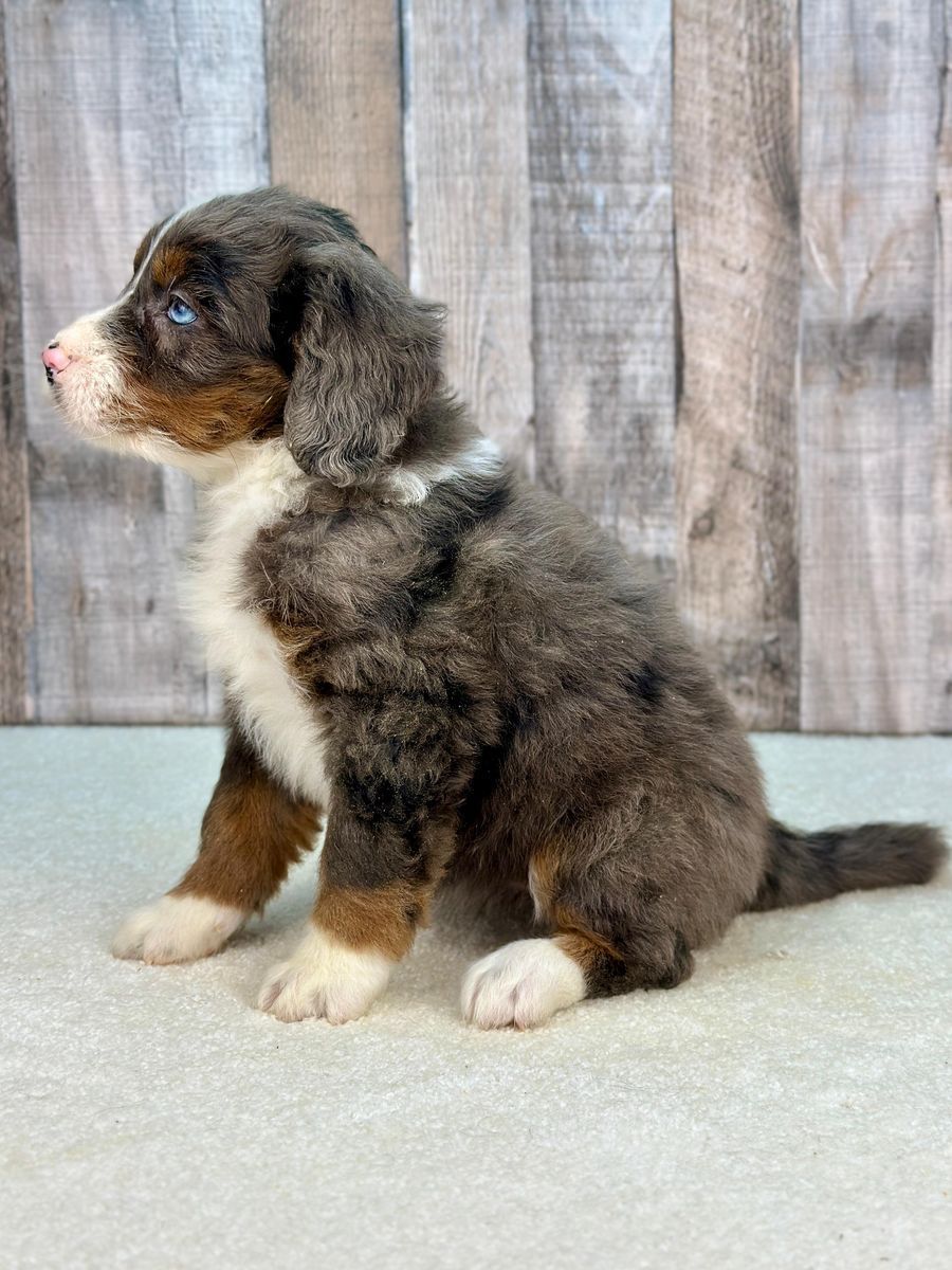 ZelleVania is a gorgeous Mini Bernedoodle with a unique merle coat and a gentle, affectionate personality. She is well-socialized and raised in a family setting, making her a perfect addition to a caring home.