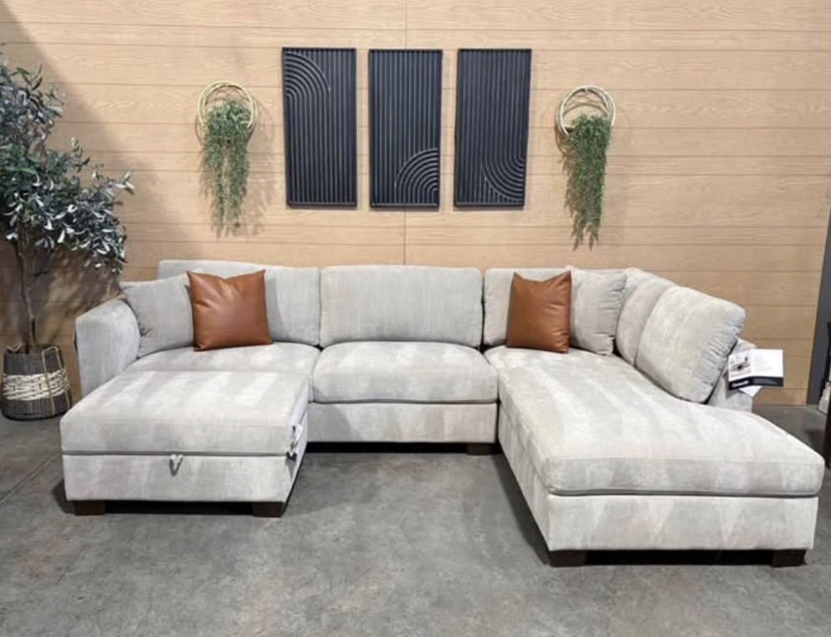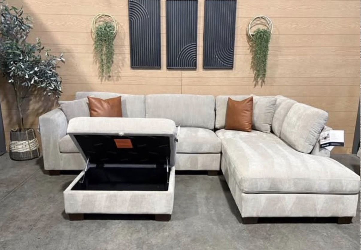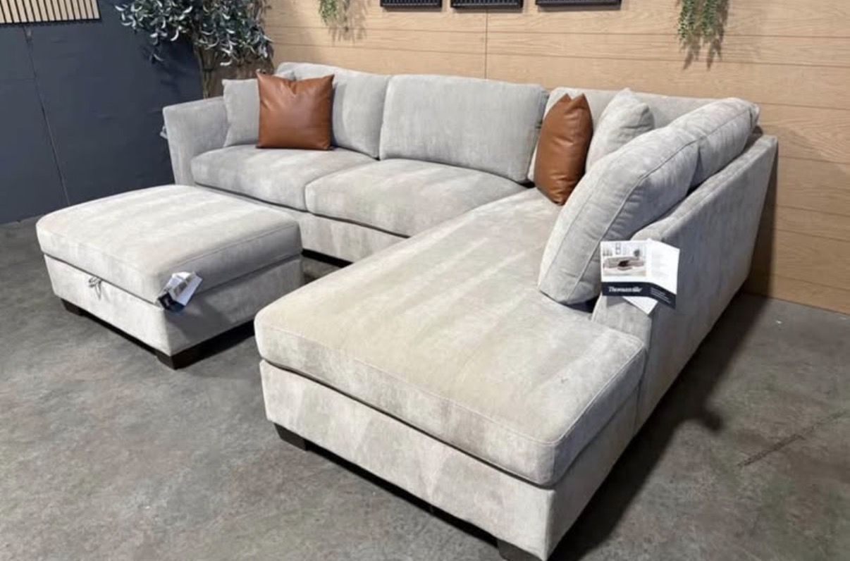 WHY YOU WILL LOVE THIS SECTIONAL... Transform your living room with the Thomasville Walsen Sectional Chaise with Storage Ottoman. Luxurious, soft polyester fabric and firm seat cushions offer the perfect blend of comfort and support. The modern track arm and solid wood tapered legs add a touch of elegance, while the lounging chaise and storage ottoman provide unmatched versatility. With two stylish accent pillows and practical attached cushions, this sectional is designed for both beauty and functionality. Enjoy ultimate relaxation and chic style with Thomasville.