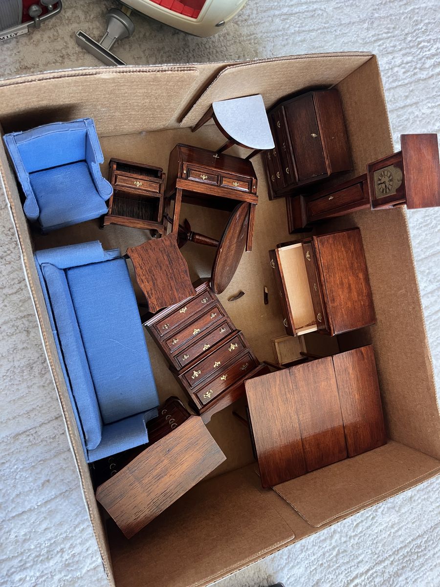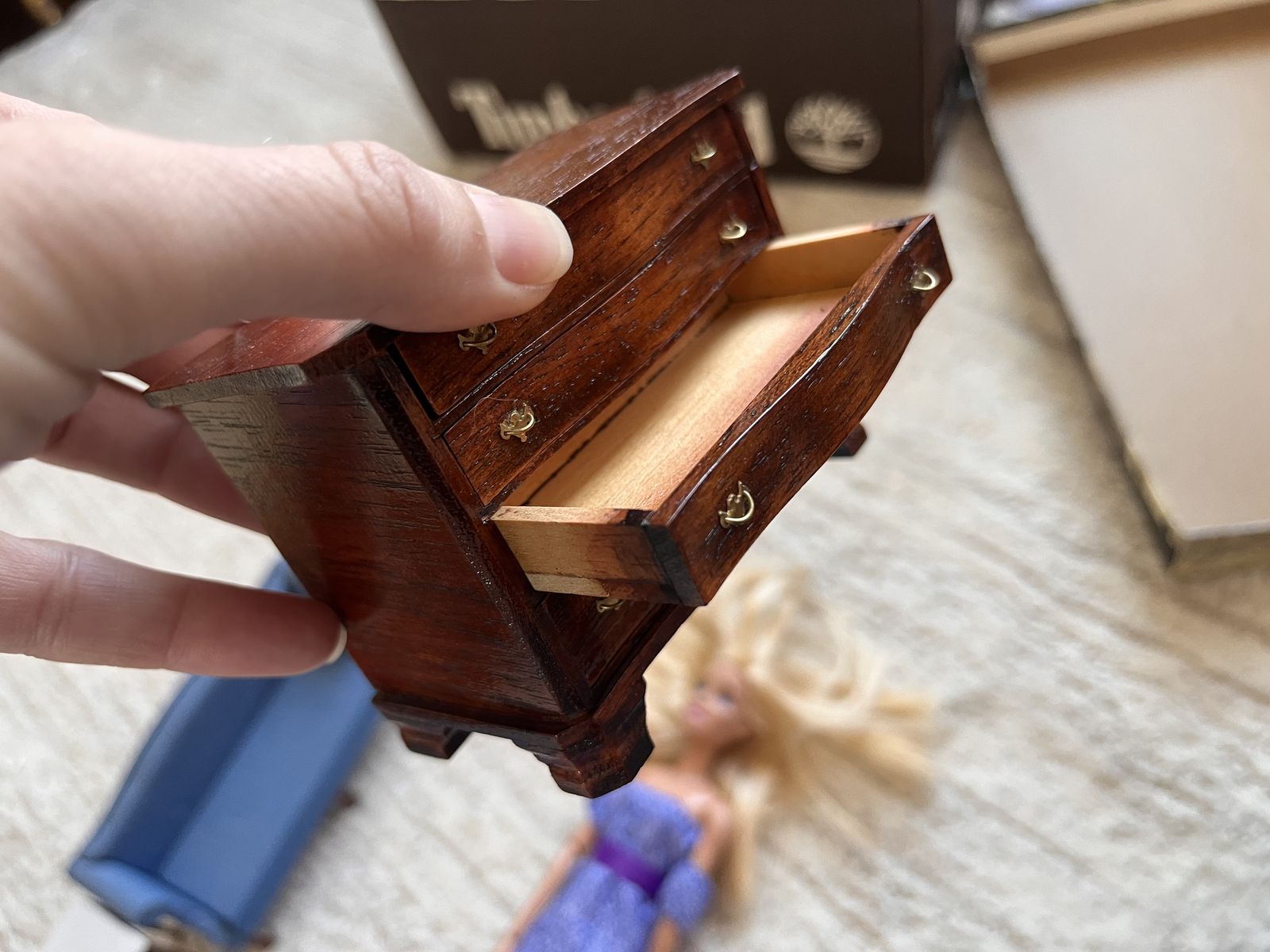 I also have a box with several pieces of real wood doll furniture that is the perfect size for Calico Critters (Barbie in picture is just for size reference). The furniture is solid wood with real hardware, working drawers, hinges, etc, and very fragile - probably best for an older or very gentle child. $25 OBO
