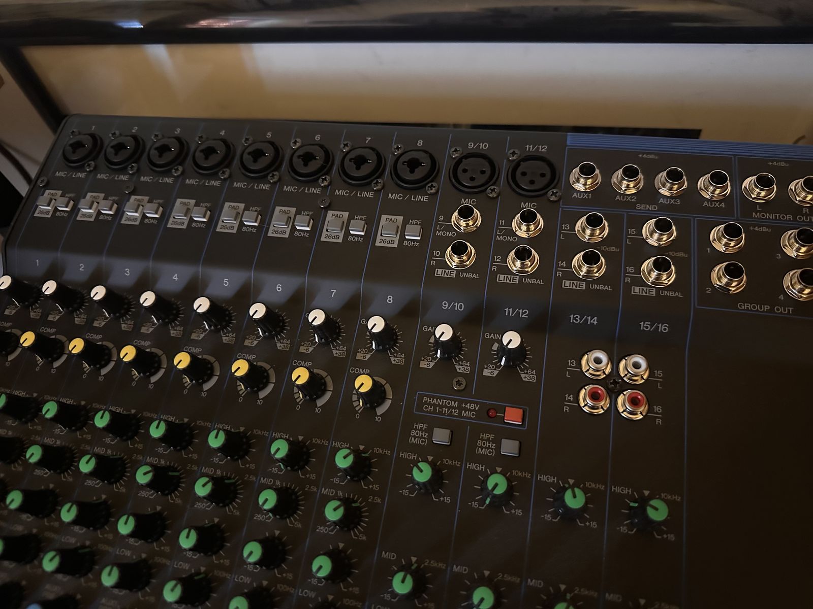 Features: 12 Mic/Line Inputs with optional Phantom Power 2 pairs of Stereo Line inputs Super Clean D-Pre Preamps 4x4 Aux Sends and Group Outs Built in per-channel Compression