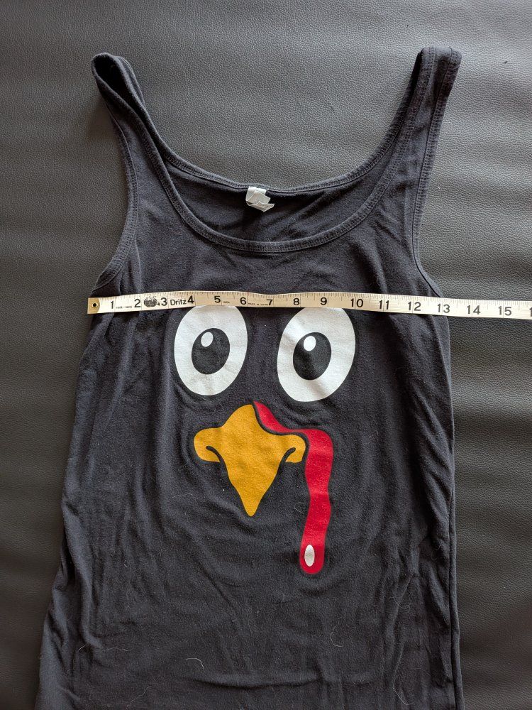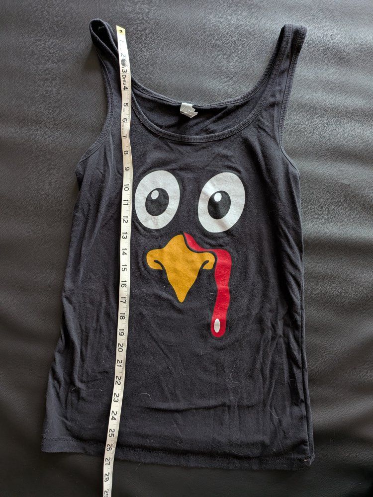 VenmoComfy black tank top. Has a big turkey face graphic, super cute for fall or Thanksgiving. Brand is Next Level Apparel, size XL. Measures approx 28 inches long and 11 inches flat across chest.