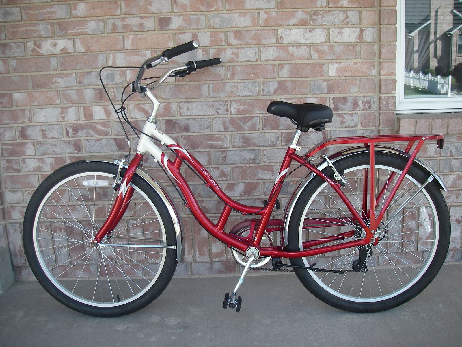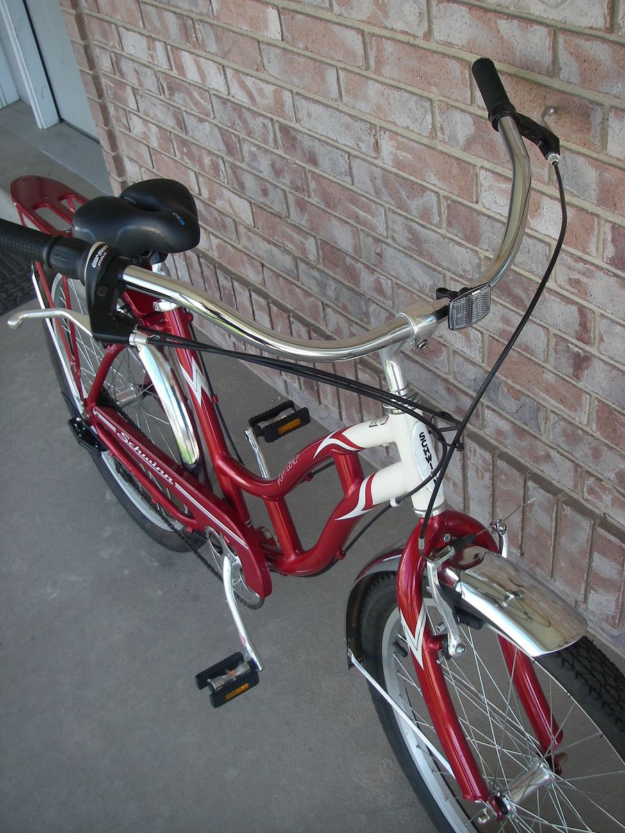 Womens / Girls 26" (wheel size) ALUMINUM frame (Med-Lrg 18"), Schwinn POINT BEACH Retro Style Beach Cruiser Bike, 7-Speed, V-Brakes, w/ Fenders, Red.