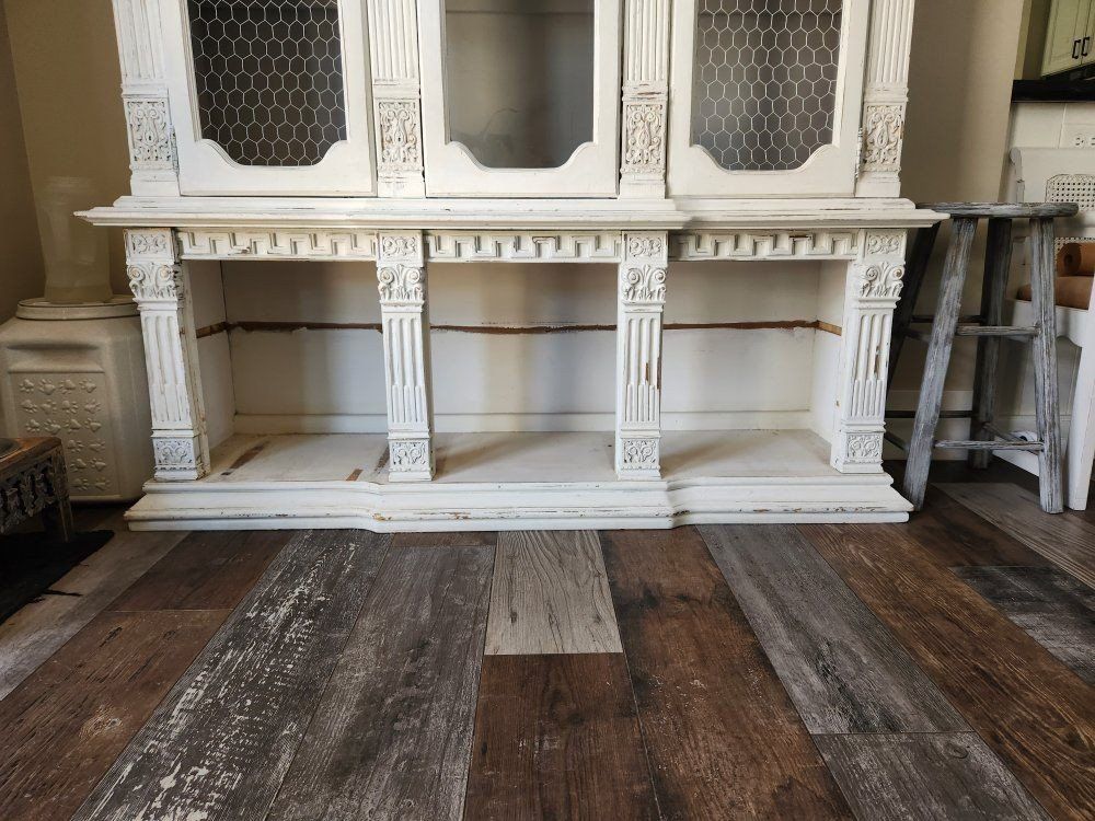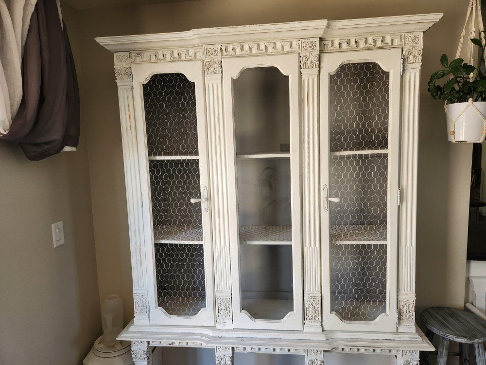 This piece was bought refinished. Has a lot of details. Is solid wood and in good condition. The doors were removed from the bottom. I had baskets in the bottom, but I'm keeping the baskets. Top and bottom are 2 separate pieces. Buyer must be able to move and load the furniture themselves.
