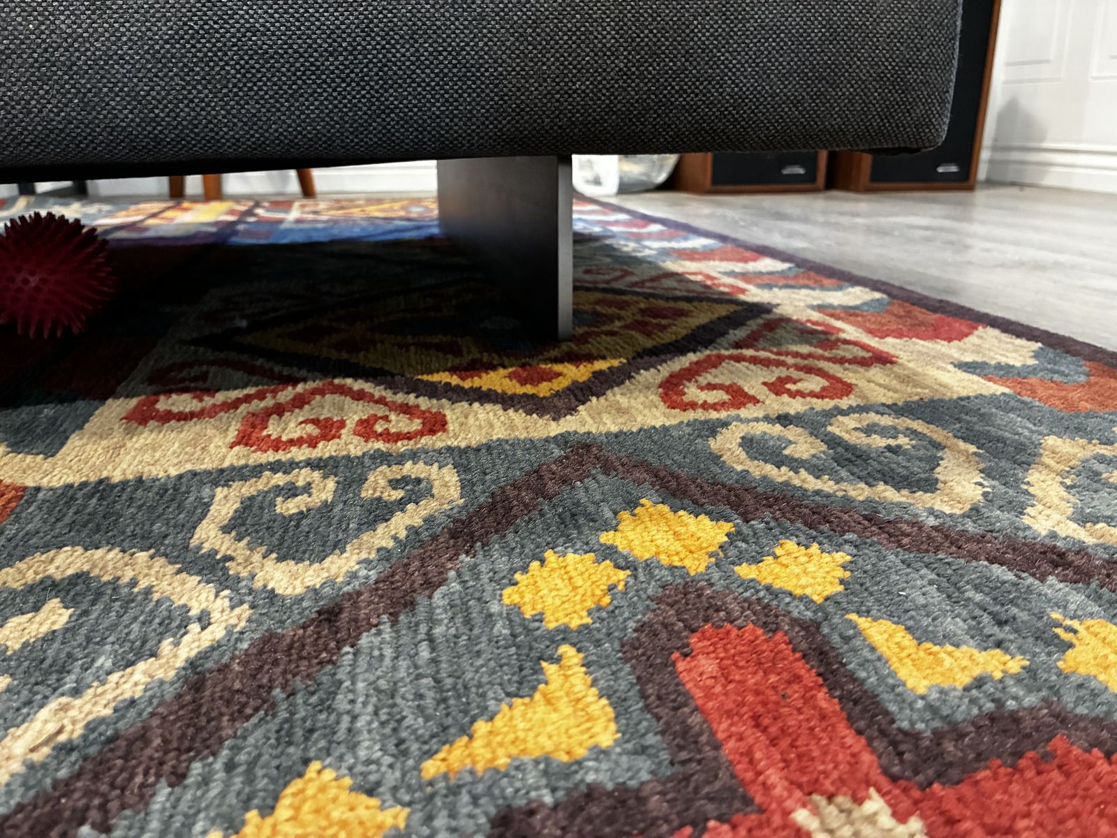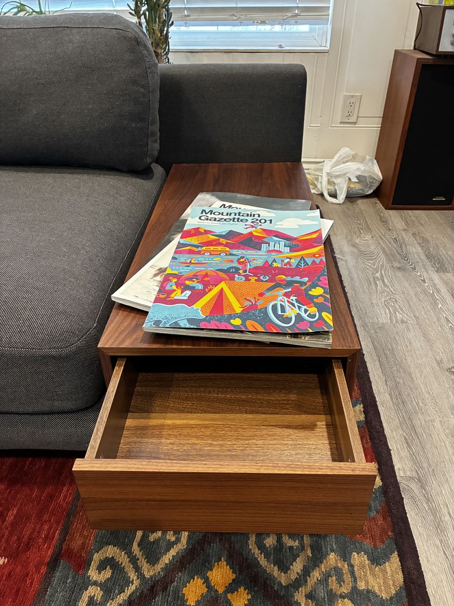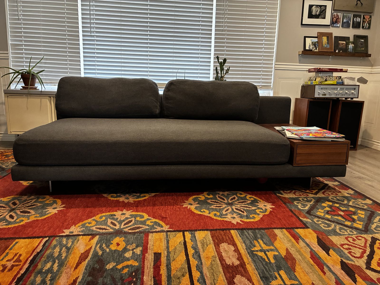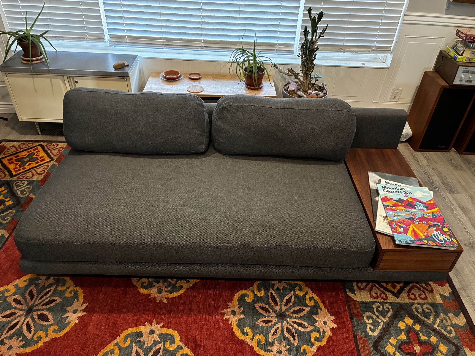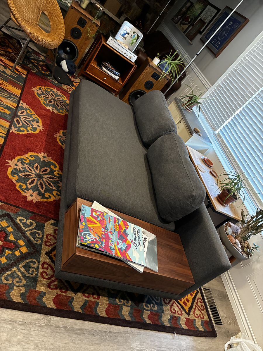 Walnut storage box can go on either end. Fabric is a medium gray/blue. Feather filled back pillows. Stainless steel feet. Can double as a small bed (it’s really deep).