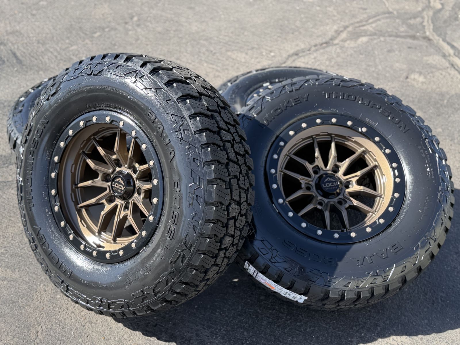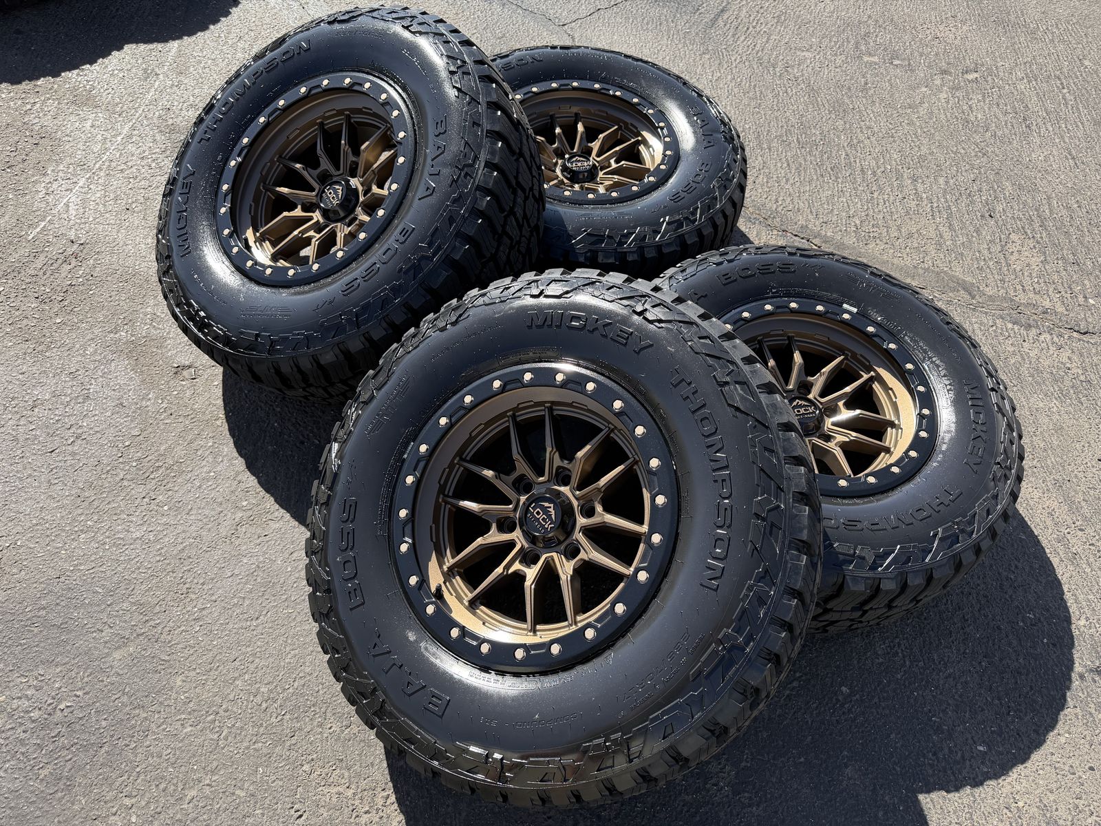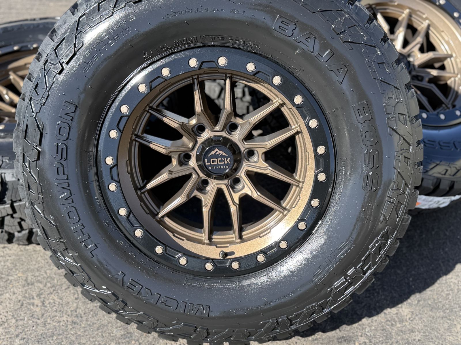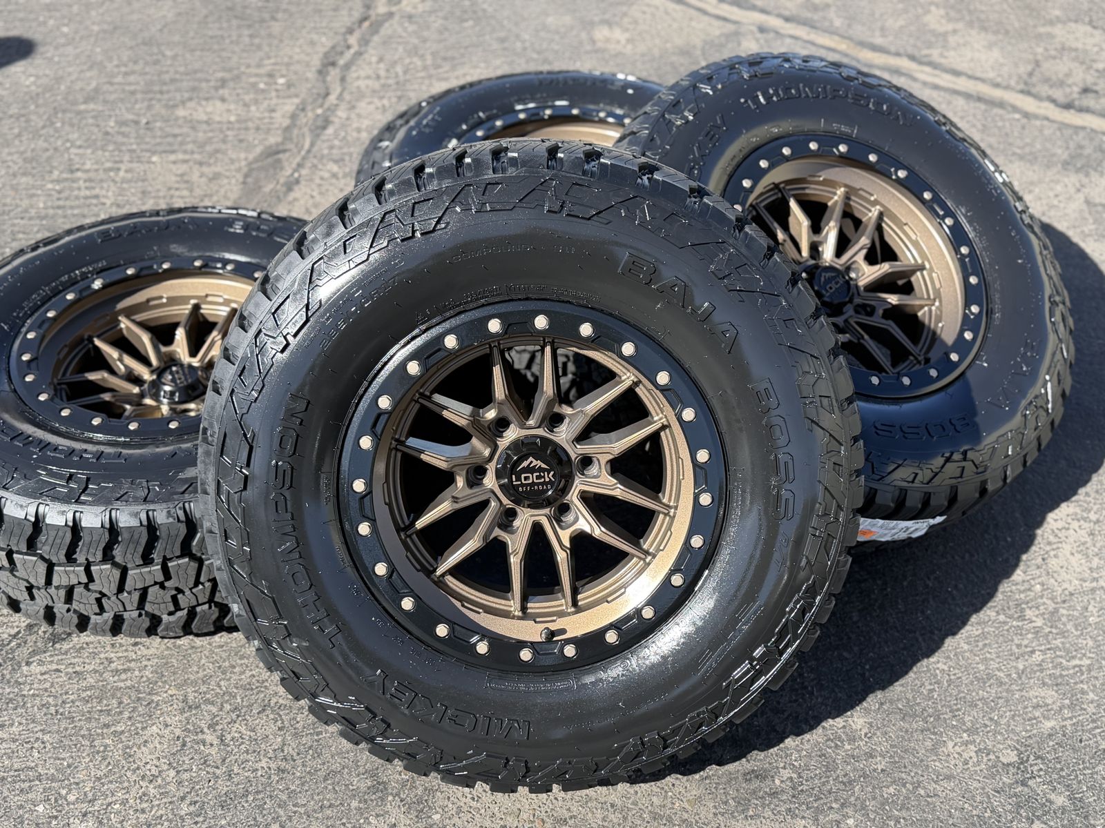 ApplePayBrand new package! 285/70r17 Mickey Thompson Baja Boss AT tires mounted on Bronze Lock Off-Road Krawler wheels. 17x9 +1et offset. 6x5.5 bolt pattern (6x139.7). These fit Chevrolet Silverado 1500 GMC Sierra yukon tahoe Nissan Titan and Toyota Tacoma and Ford Ranger. Huge savings over retail! Call or txt 435-760-1194