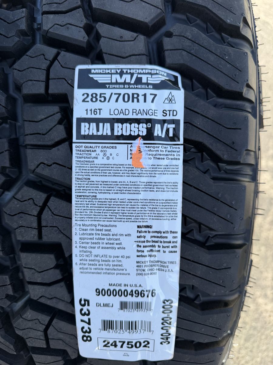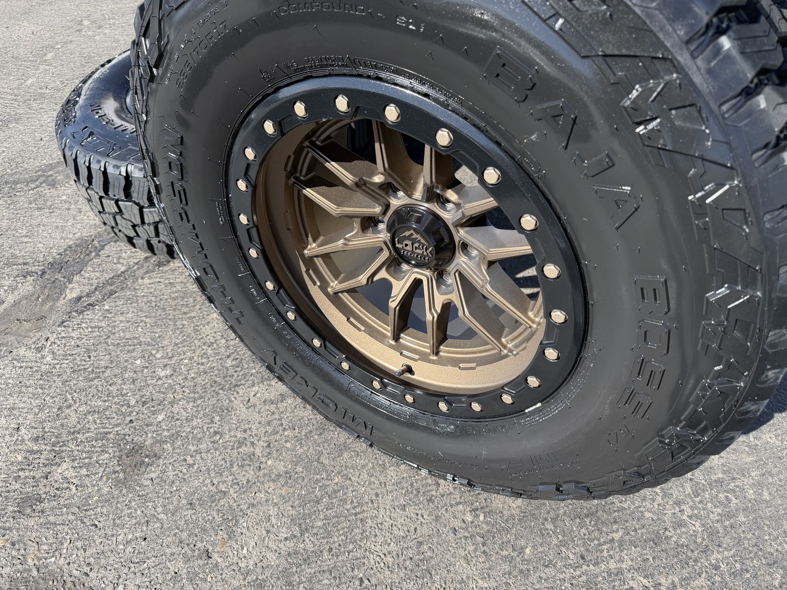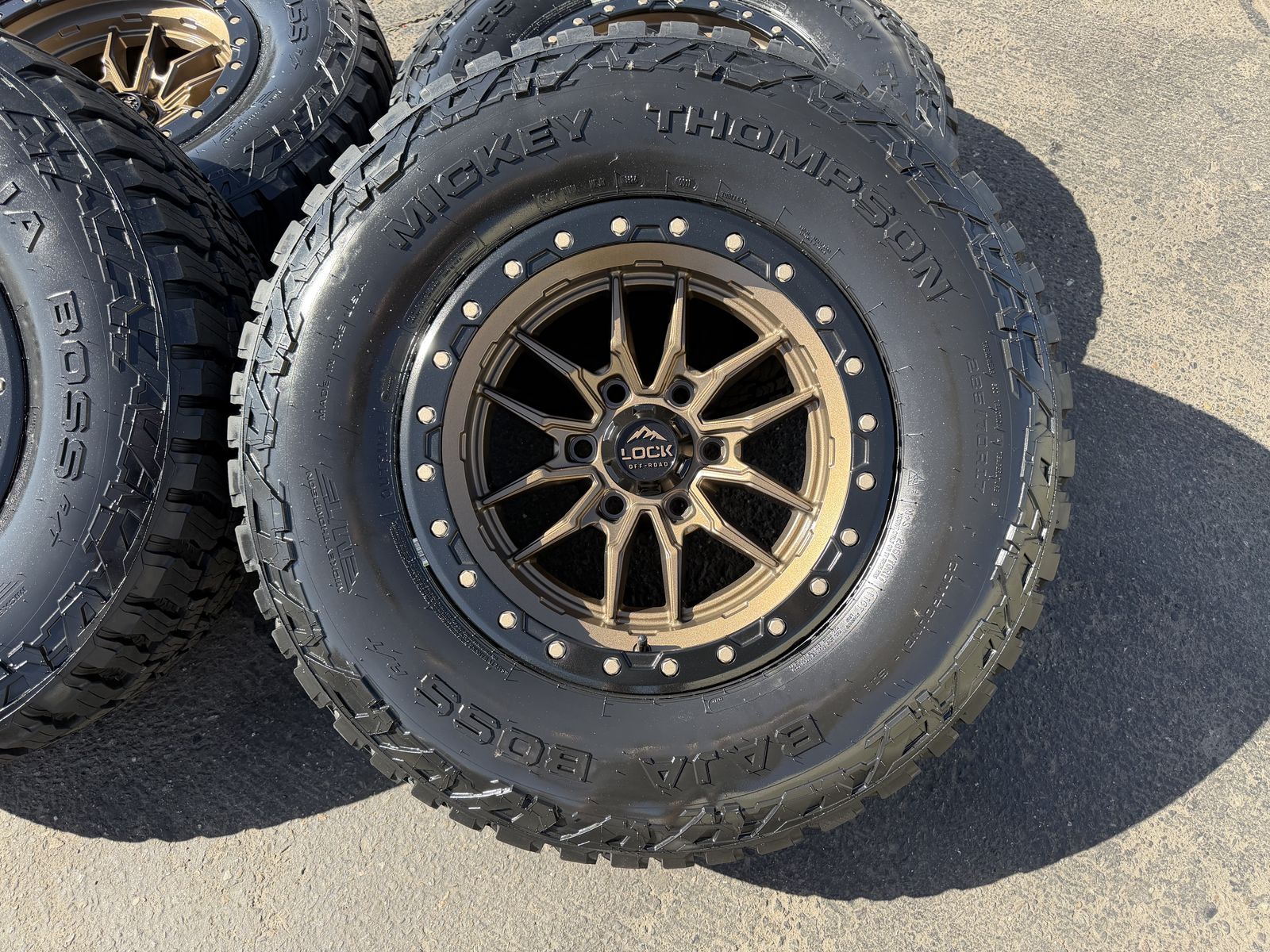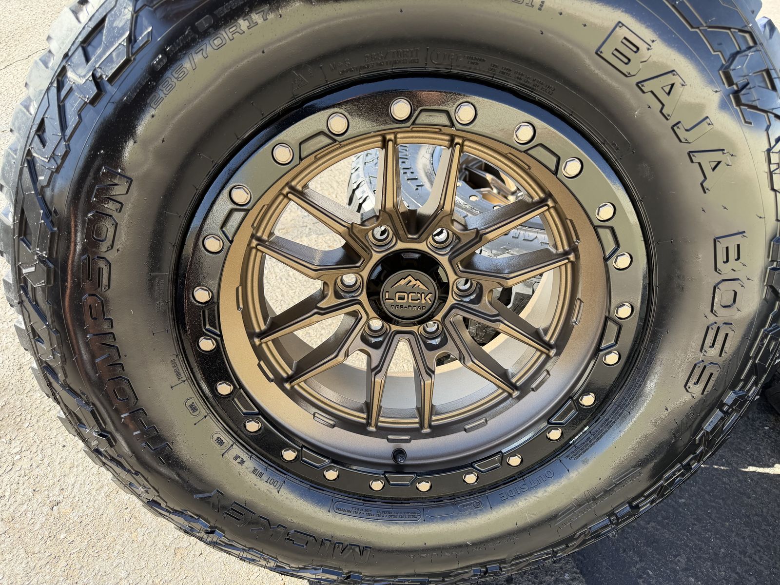 ApplePayBrand new package! 285/70r17 Mickey Thompson Baja Boss AT tires mounted on Bronze Lock Off-Road Krawler wheels. 17x9 +1et offset. 6x5.5 bolt pattern (6x139.7). These fit Chevrolet Silverado 1500 GMC Sierra yukon tahoe Nissan Titan and Toyota Tacoma and Ford Ranger. Huge savings over retail! Call or txt 435-760-1194