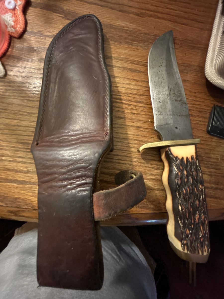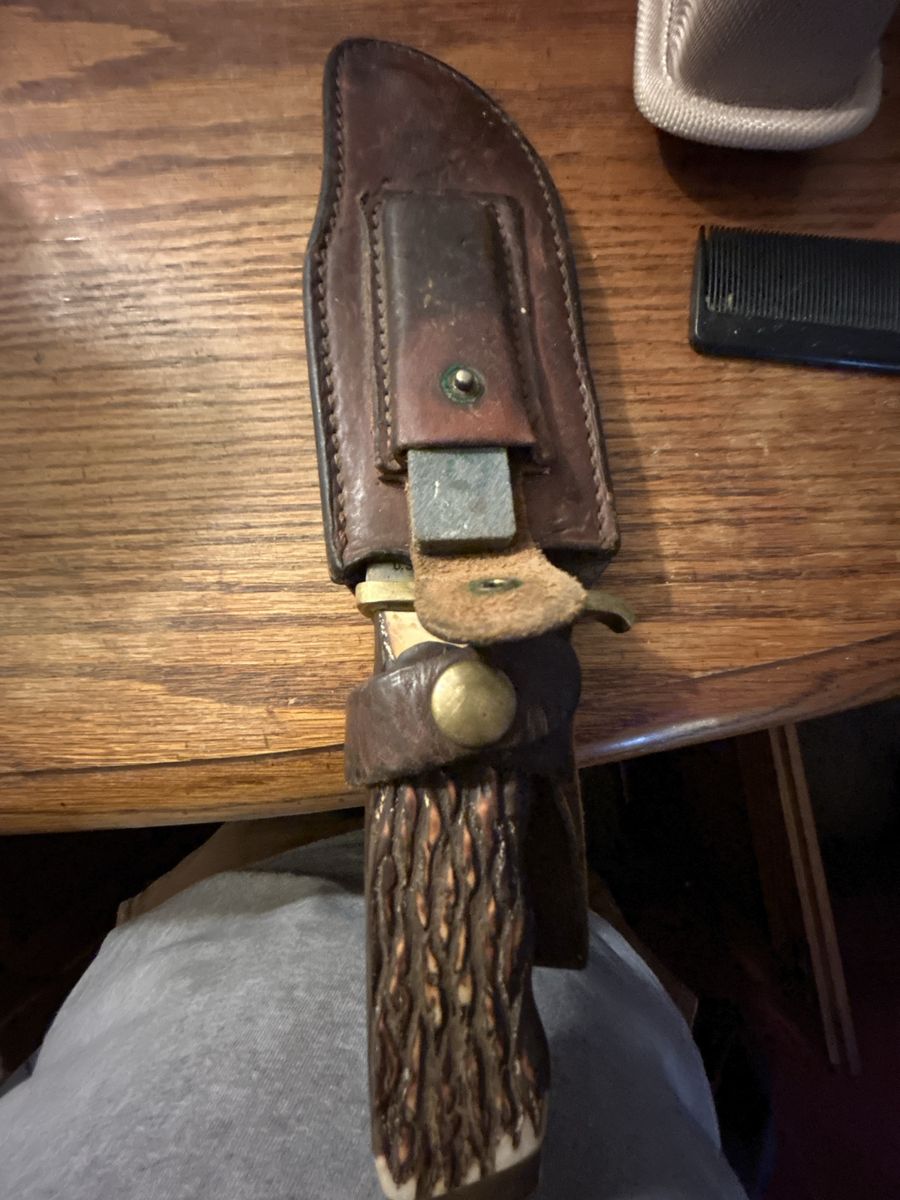The blade is 5 ½" long, early knives being 1095HC high carbon steel, and later ones being rust resistant high carbon steel (same as Schrade+), sabre ground clip point, nearly 1 ½" wide and thick of spine making a very sturdy knife. None of the pre-1974 knives have the Schrade+ stamp, and I have not seen later ones with it.