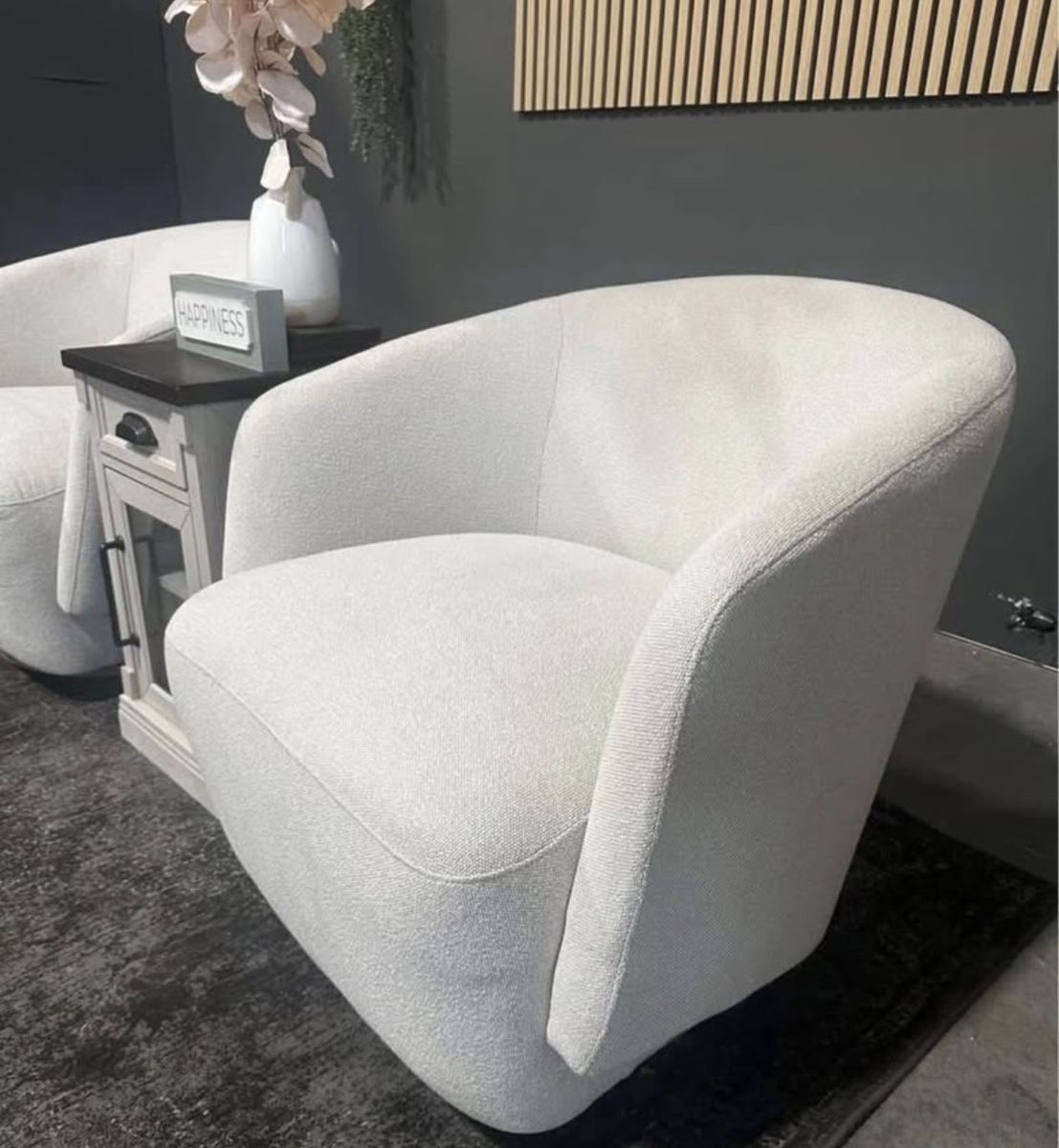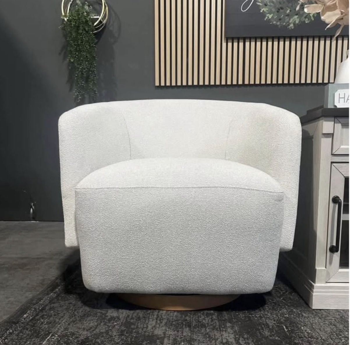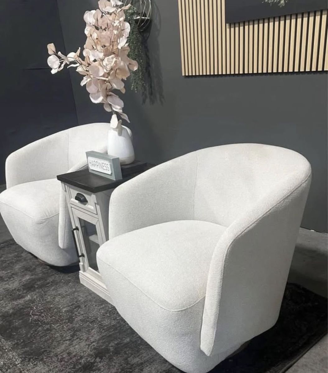 Conveniently enjoy the freedom to face any direction with the effortless 360-degree swivel feature. The gently cascading edge promotes relaxation and reduces pressure, creating a stylish and supportive seating experience. The stunning wood swivel base accent chair is sturdy and adds a touch of elegance and functionality. The distinctive arm design not only adds flair but also ensures a delightful and relaxing seating experience. An elegantly sturdy barrel design that not only offers superior back support but also adds a touch of style to your space. Sumptuously textured boucle that creates a soft, cozy, and inviting texture. Color is cream.