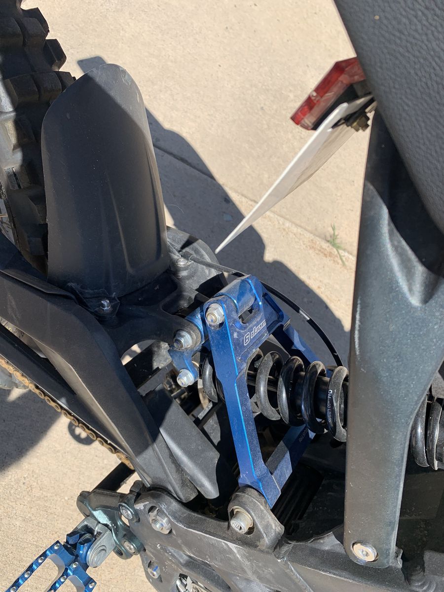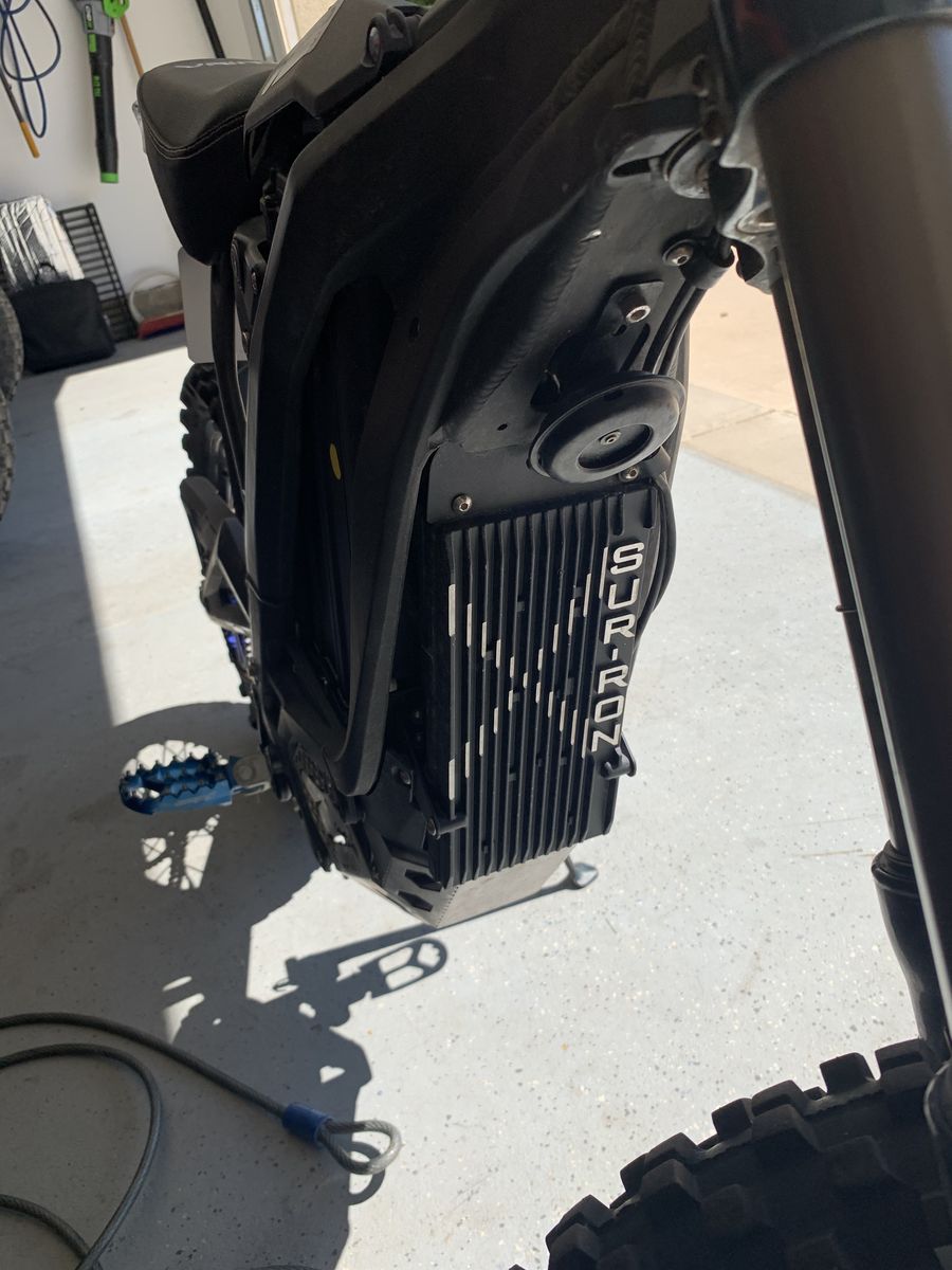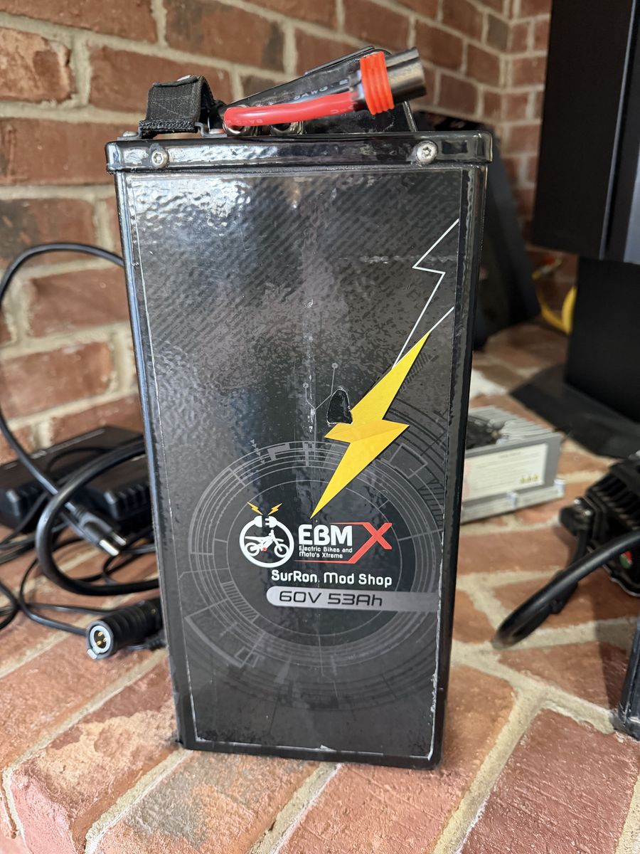 2020 Surron Lite Bee X. 259 very gentle miles on it. The three weak points of the Light Bee are the front forks, rear shock and shock linkage, I had them replaced with a plush Fox Float 40 front fork, a Marzocchi rear shock and heavy duty linkage. The rest of the components were installed for added comfort and performance. Front and rear knobby dirt bike tires mounted on Charged Cycle Works 19"/16" rims. 54 tooth rear sprocket for added power. Bark Busters for safety. Raised handle bars with direct mount bar stem. Luna Stainless Steel skid plate. grippy footpegs. Luna cushy seat with extended rear fender. NEW, Large EBMX 60v/53AH with zero hours on it cost $2500. Extends range by 34% over stock battery.
