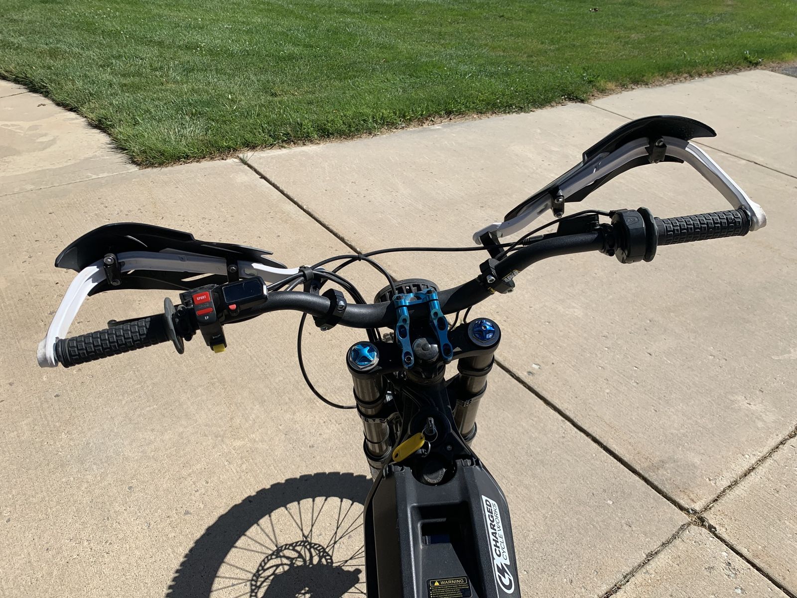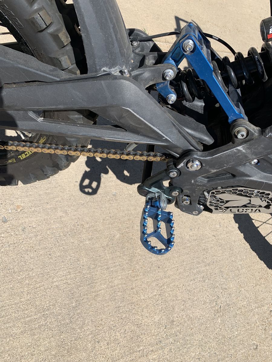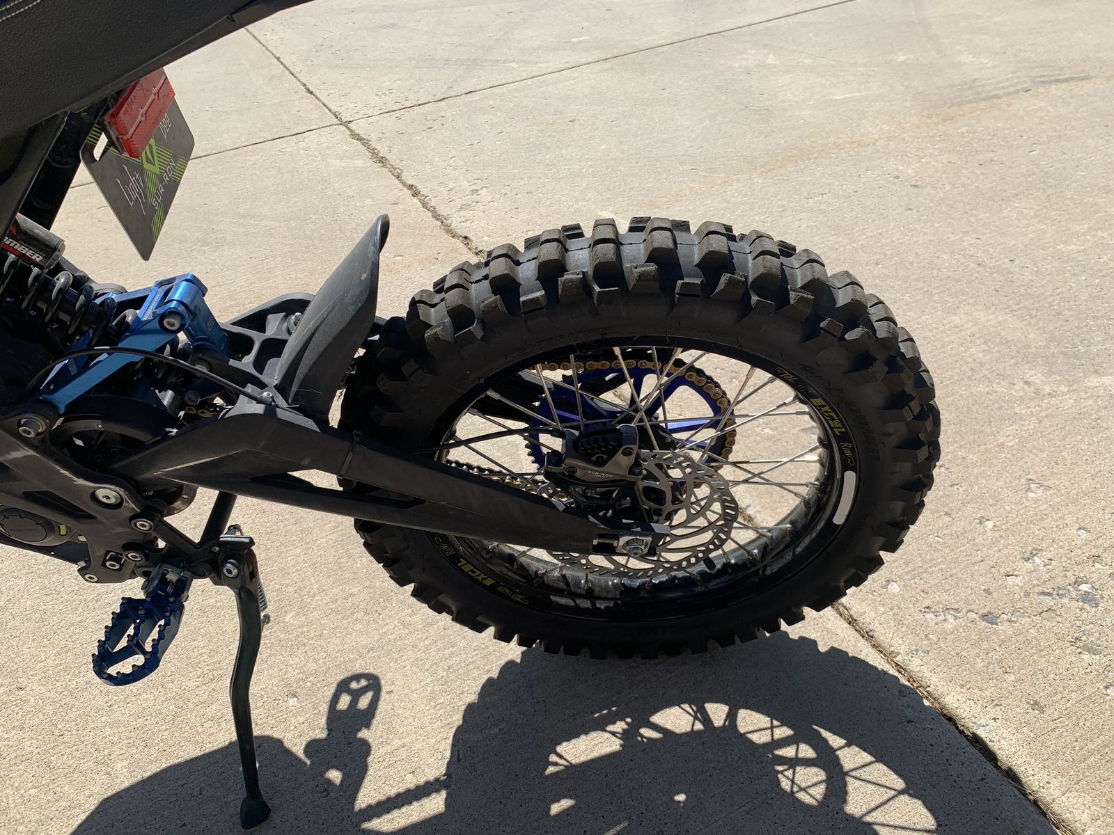 2020 Surron Lite Bee X. 259 very gentle miles on it. The three weak points of the Light Bee are the front forks, rear shock and shock linkage, I had them replaced with a plush Fox Float 40 front fork, a Marzocchi rear shock and heavy duty linkage. The rest of the components were installed for added comfort and performance. Front and rear knobby dirt bike tires mounted on Charged Cycle Works 19"/16" rims. 54 tooth rear sprocket for added power. Bark Busters for safety. Raised handle bars with direct mount bar stem. Luna Stainless Steel skid plate. grippy footpegs. Luna cushy seat with extended rear fender. NEW, Large EBMX 60v/53AH with zero hours on it cost $2500. Extends range by 34% over stock battery.