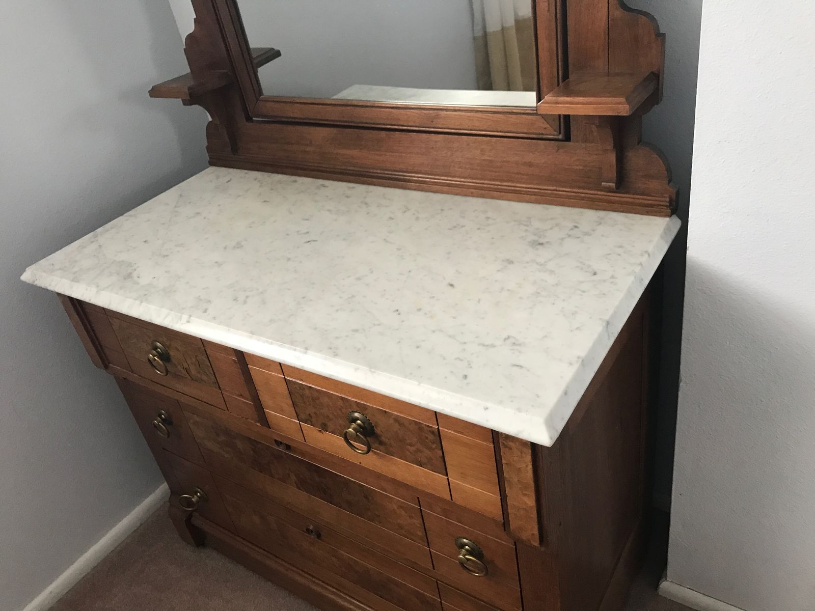 5 drawer Antique Dresser with Mirror and Marble Top $220. OBO The dimensions are 40" wide, 20" Deep, and 6.5' high