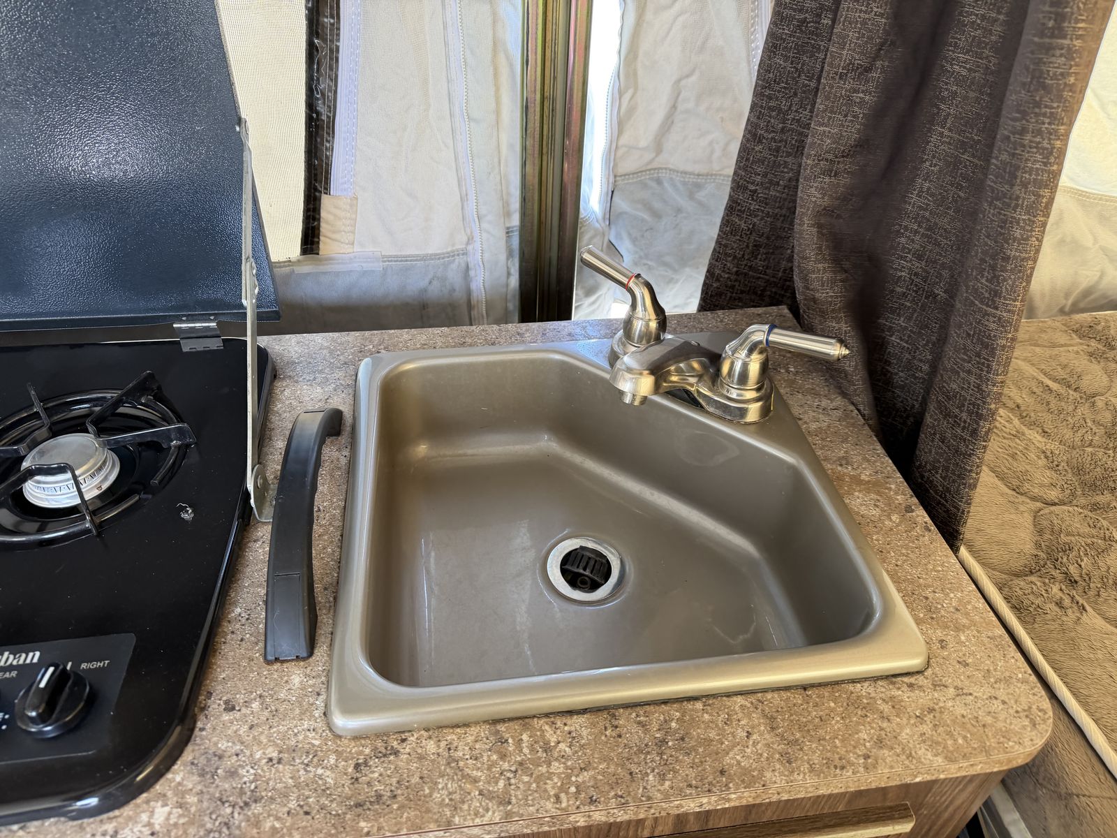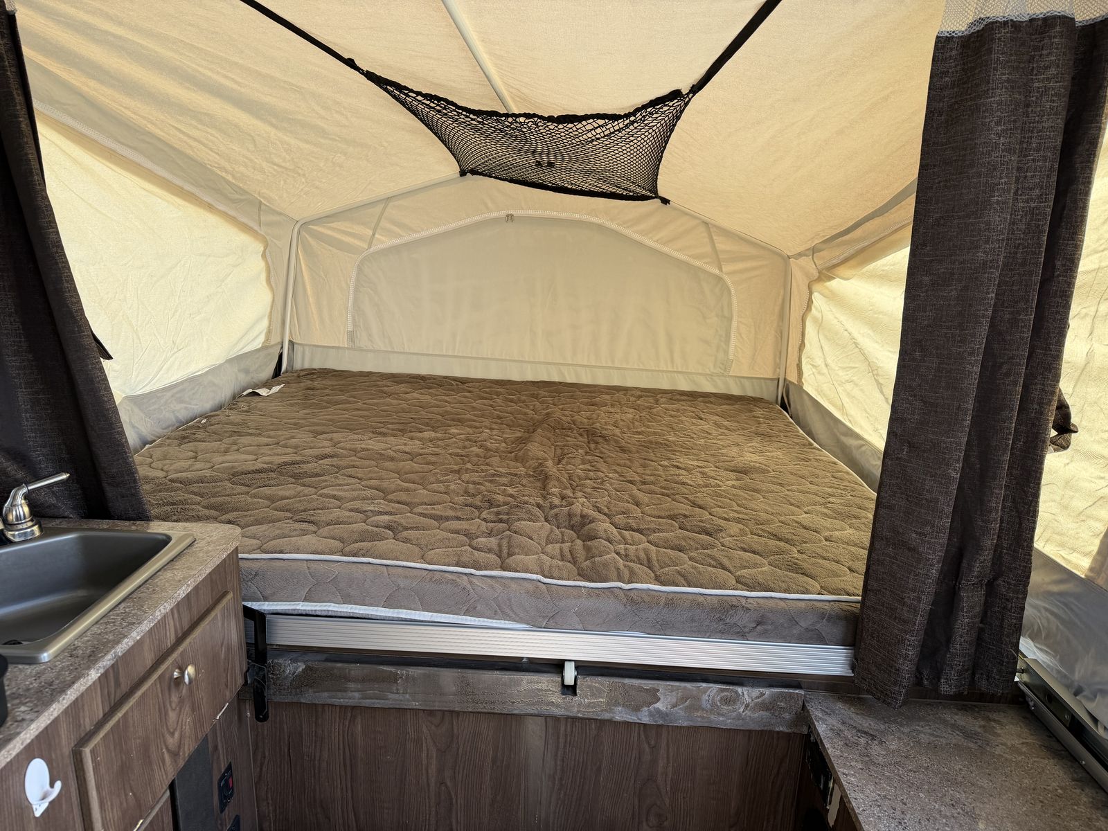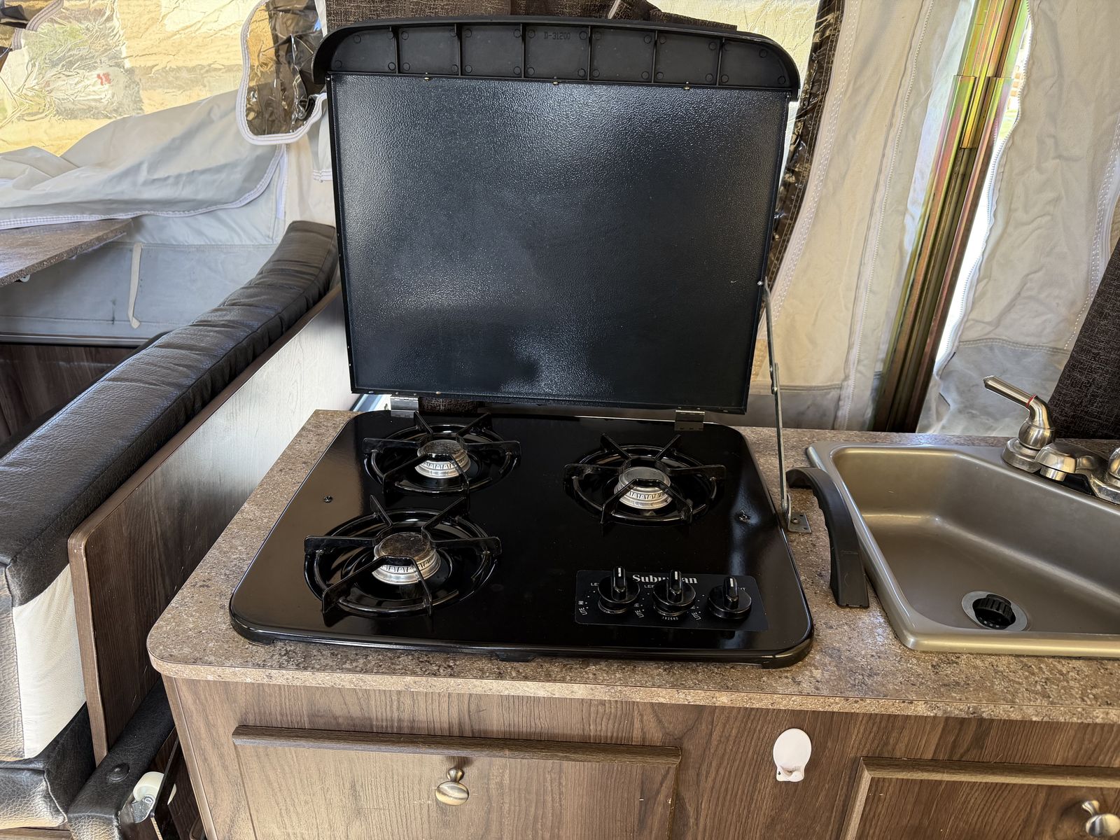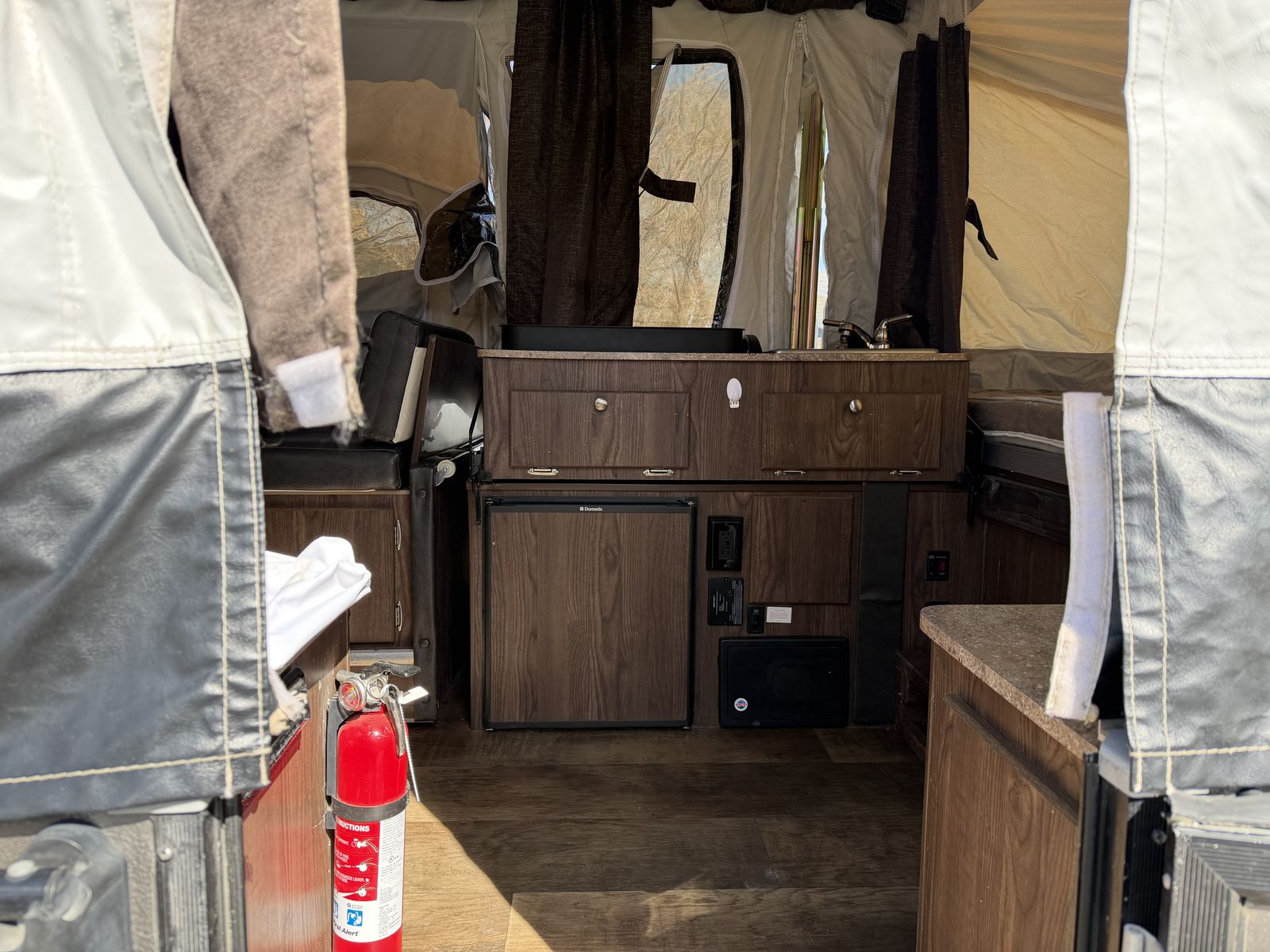 Purchased new in 2017. Everything in good working condition Minor cosmetic wear. Toilet cartridge with handheld shower, 3 burner gas stove, small frig-electric or gas, sink, gas water heater, gas furnace, heated mattress on tent beds, side slide out dinette converts to 3rd bed, outdoor shower, water/sewer hookups, sat tv hookup, 26 gal fresh water tank, nice amt of storage for pop up. Hauls 1ATV or bikes/gear. Great rugged tires and clearance for backcountry boondocking! easy to tow, can tow w/suv. We have loved this camper for backcountry camping, just need an easier set up in our 60's.