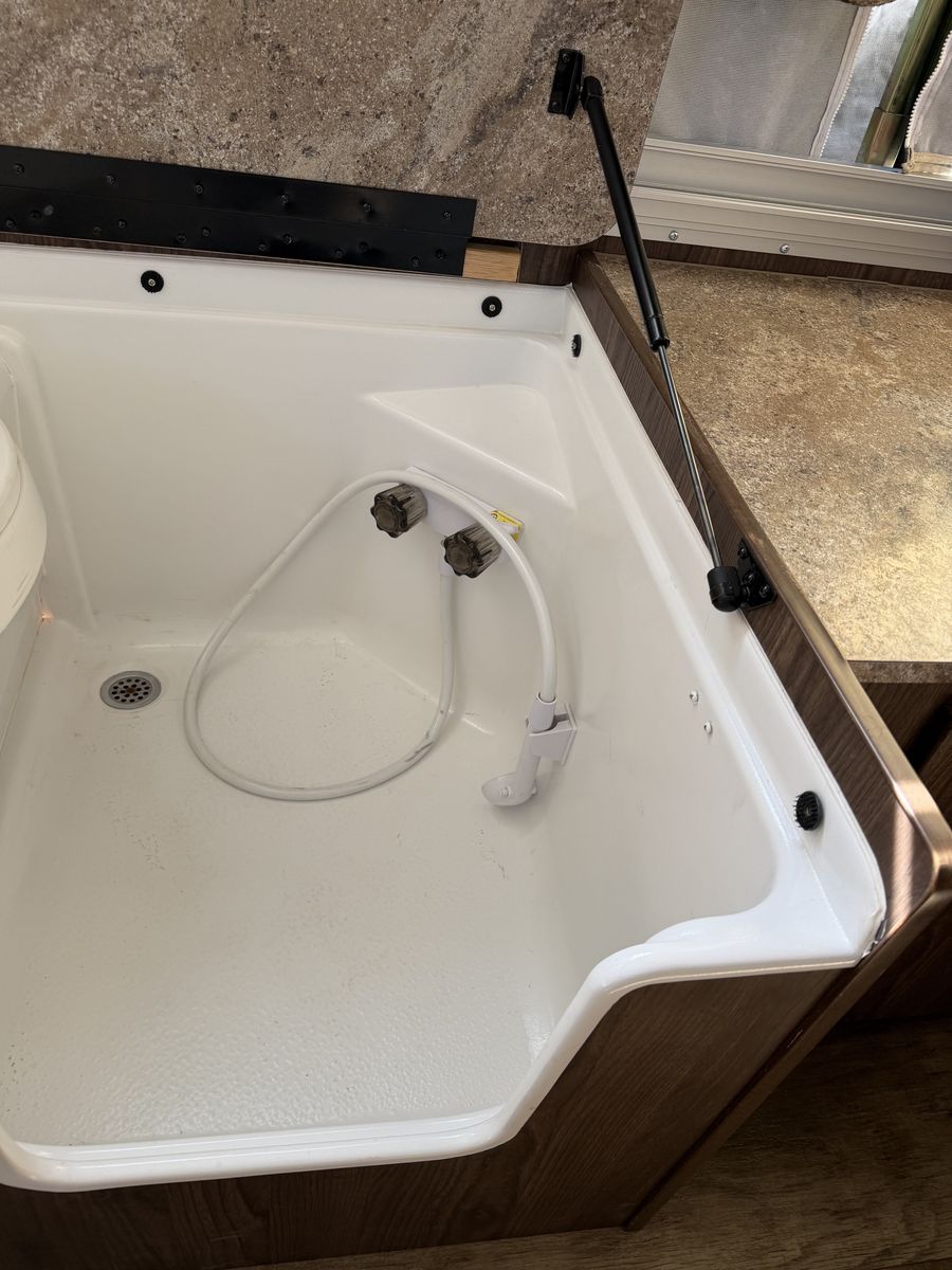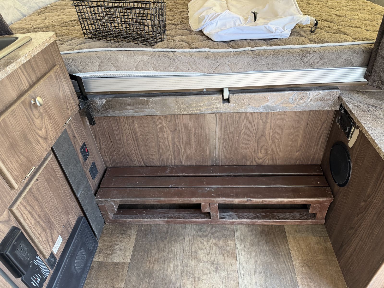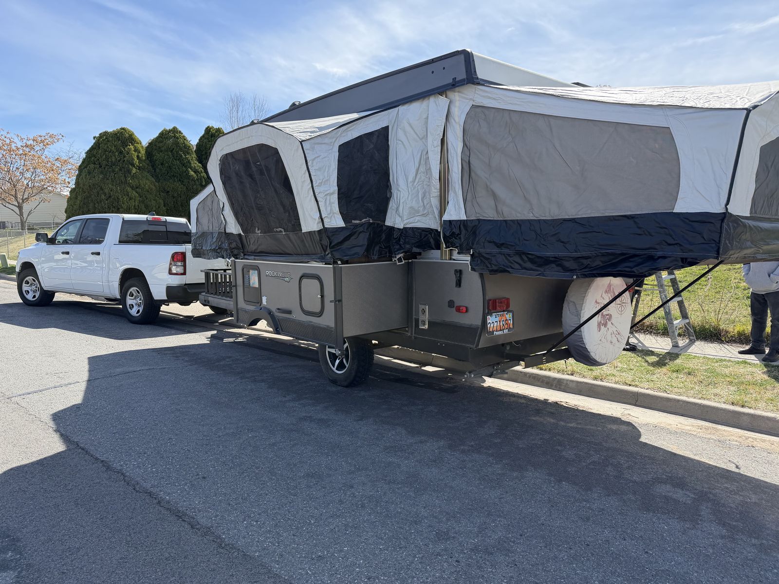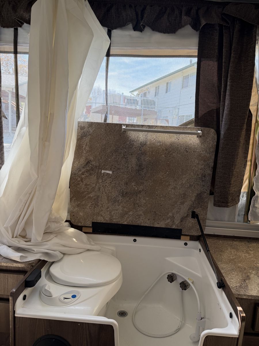 Purchased new in 2017. Everything in good working condition Minor cosmetic wear. Toilet cartridge with handheld shower, 3 burner gas stove, small frig-electric or gas, sink, gas water heater, gas furnace, heated mattress on tent beds, side slide out dinette converts to 3rd bed, outdoor shower, water/sewer hookups, sat tv hookup, 26 gal fresh water tank, nice amt of storage for pop up. Hauls 1ATV or bikes/gear. Great rugged tires and clearance for backcountry boondocking! easy to tow, can tow w/suv. We have loved this camper for backcountry camping, just need an easier set up in our 60's.