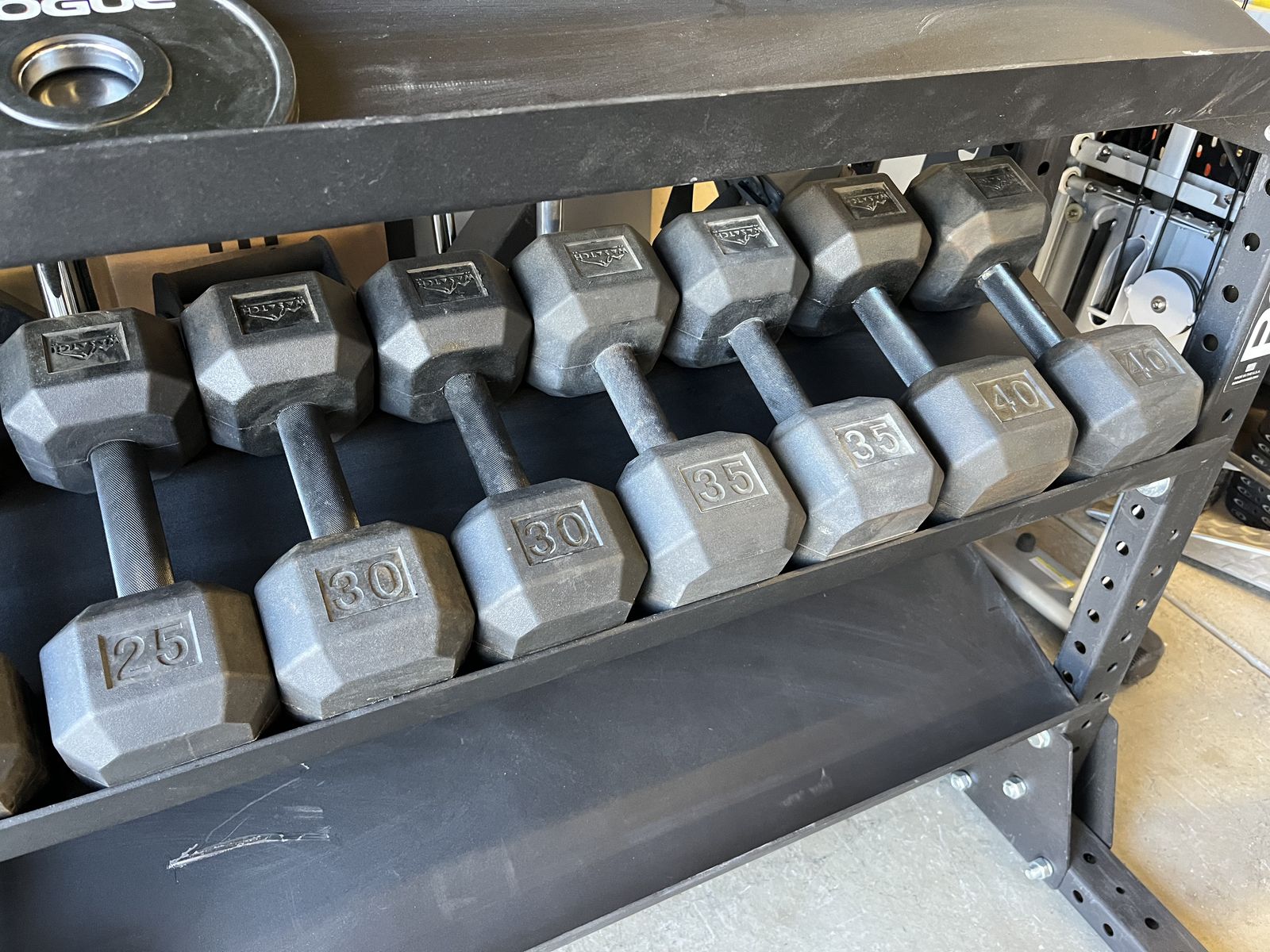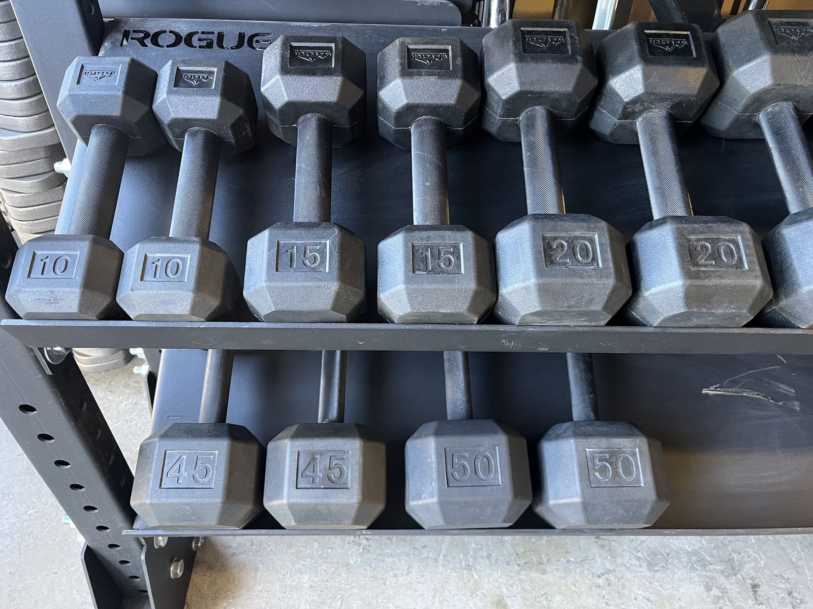 Commercial quality rubber coated dumbbell set in new condition. The set is from 10 to 50 in 5 pound increments. Selling the set altogether for $700 firm and will not separate. (RACK NOT INCLUDED!)