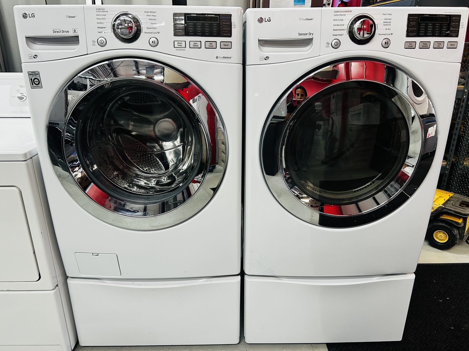 Lg Steam washer true balance anti vibration system stainless steel drum heavy duty tub clean bulky large allergiene steam fresh care cotton normal hand wash speed wash prewash rinse plus spin extra rinse water plus delay wash etc.. Lg Steam Electric Dryer sensor dry stainless steel drum heavy duty cotton normal steam fresh speed dry air dry anti bacterial wrinkle care time dry etc..Can be stacked. Work great, no issues. Clean. 45 day warranty, delivery/install available.