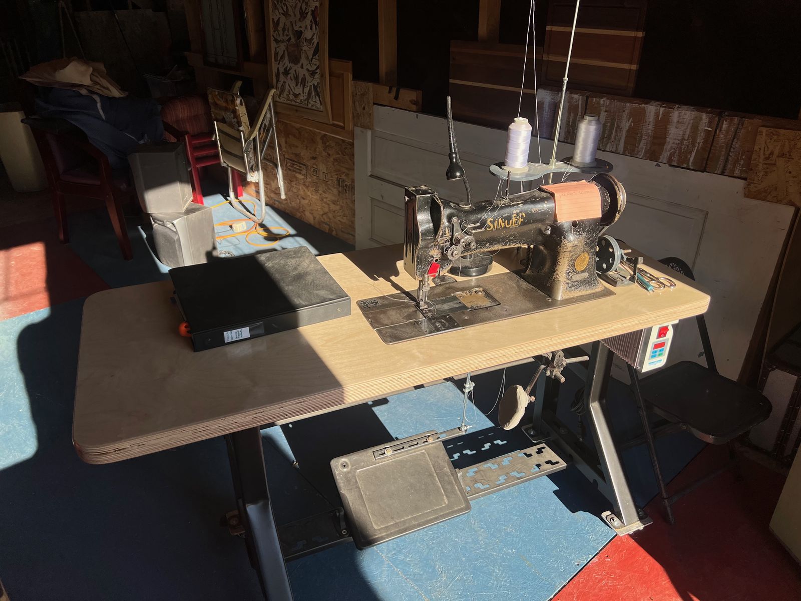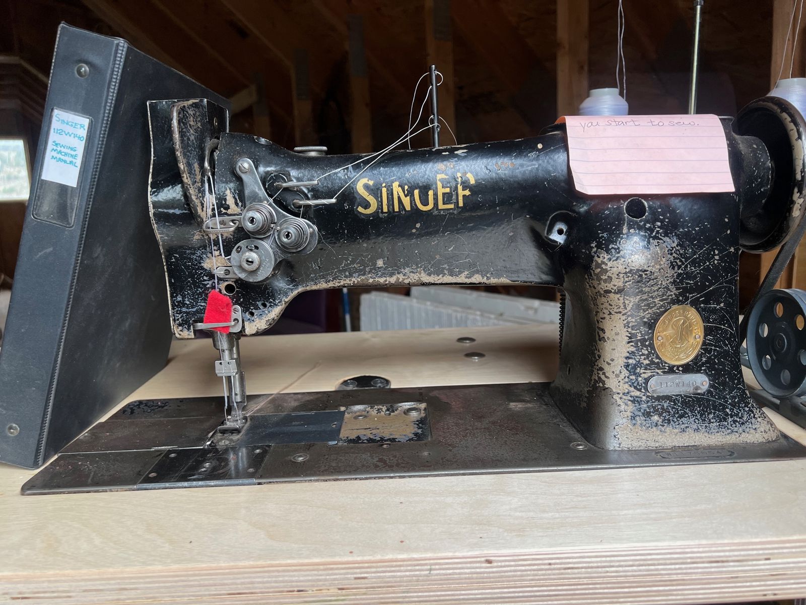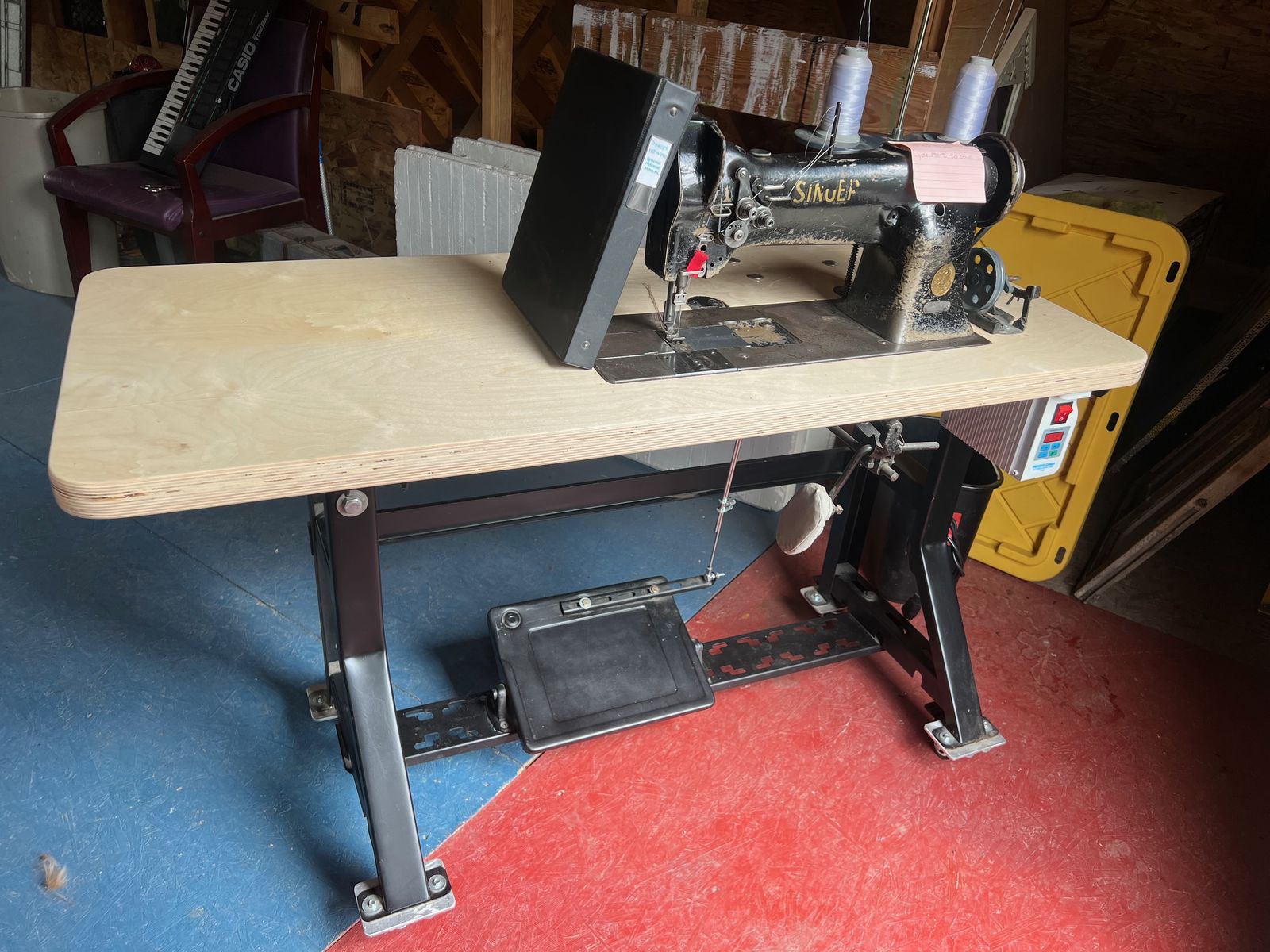 Singer Model 112W140 Double Needle Sewing Machine in good condition. This sewing machine has a new work table, new viable speed drive motor, and was recently checked out and tuned by Daynes In Salt Lake City.