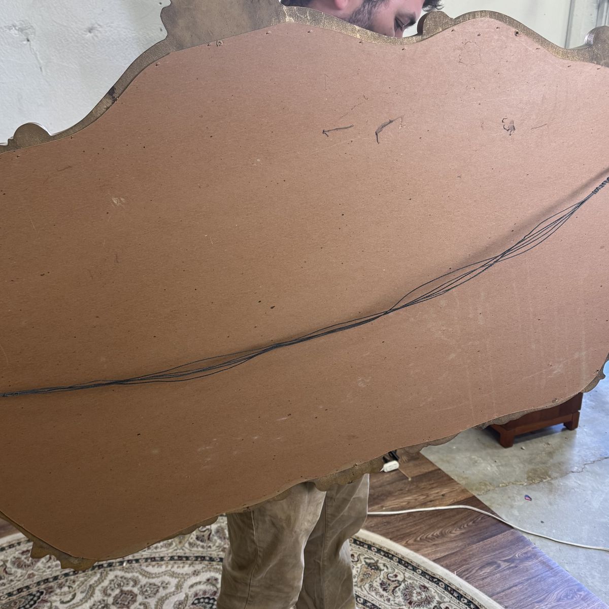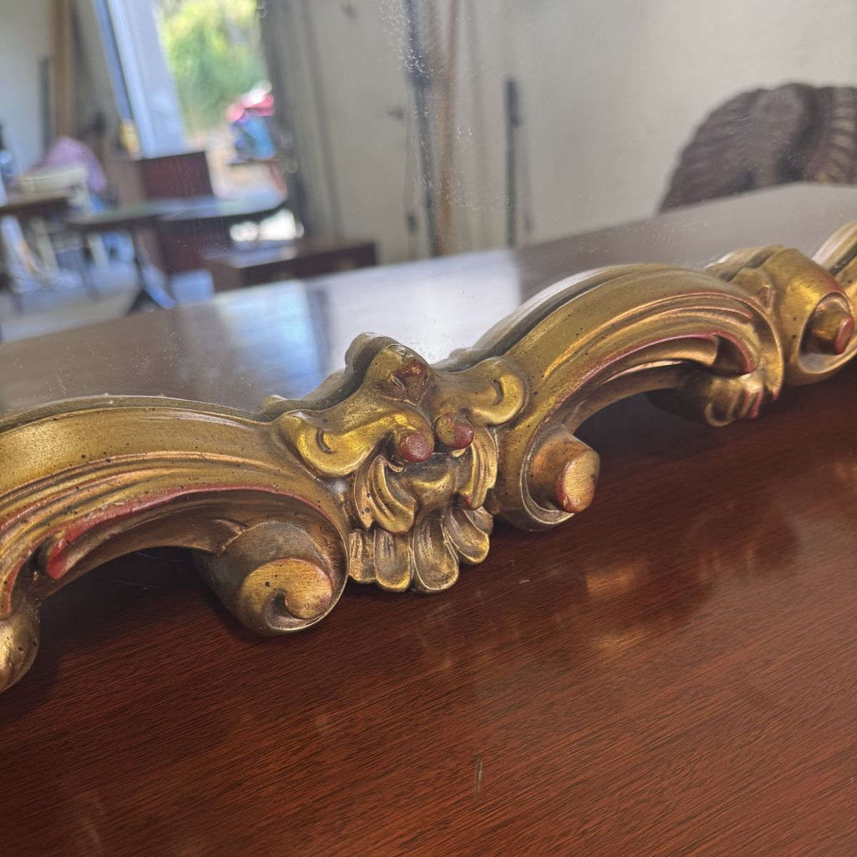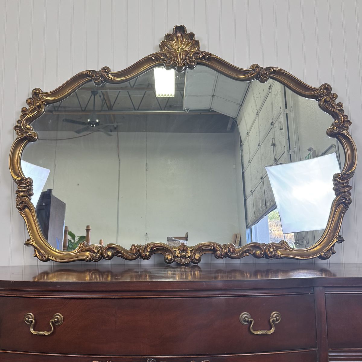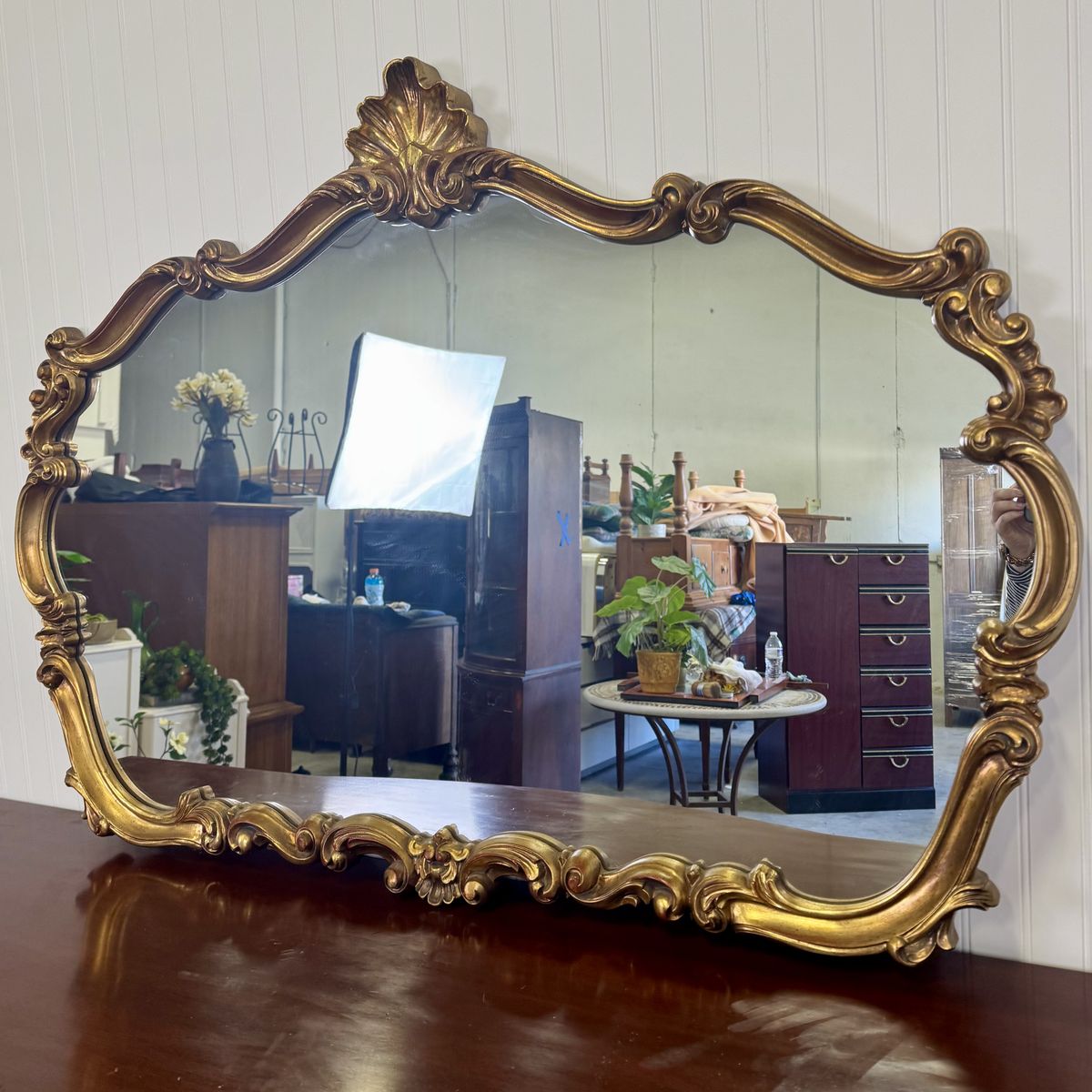 VenmoBeautiful ornate gold mirror with a classic Rococo-inspired silhouette and richly detailed carved frame. The scale and shape make it perfect as a statement piece on a dresser, vanity, or entry console.