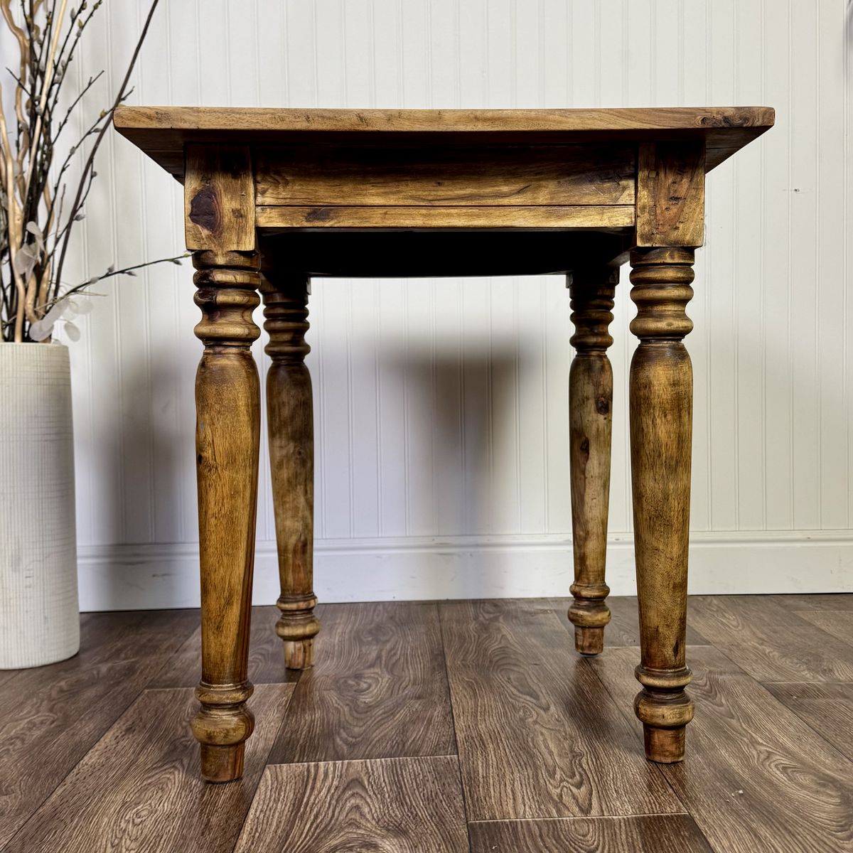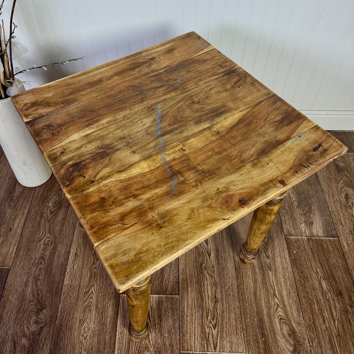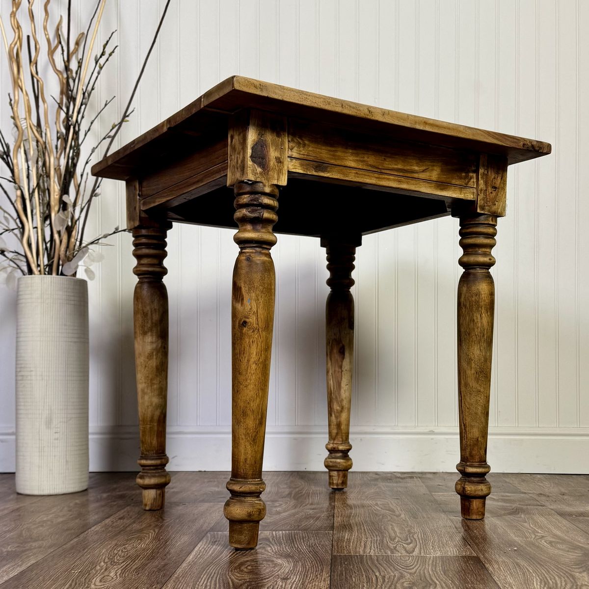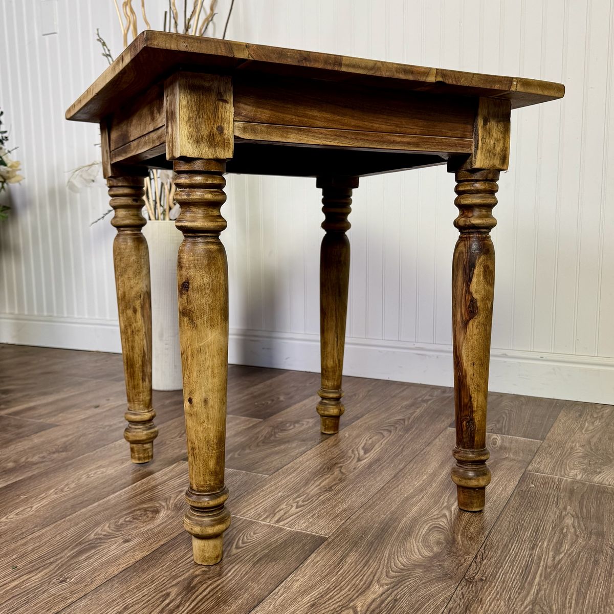 VenmoRustic hardwood accent table featuring turned legs and beautifully variegated wood grain. Likely made of solid tropical hardwood such as mango or acacia. Great vintage condition with only minor signs of wear.