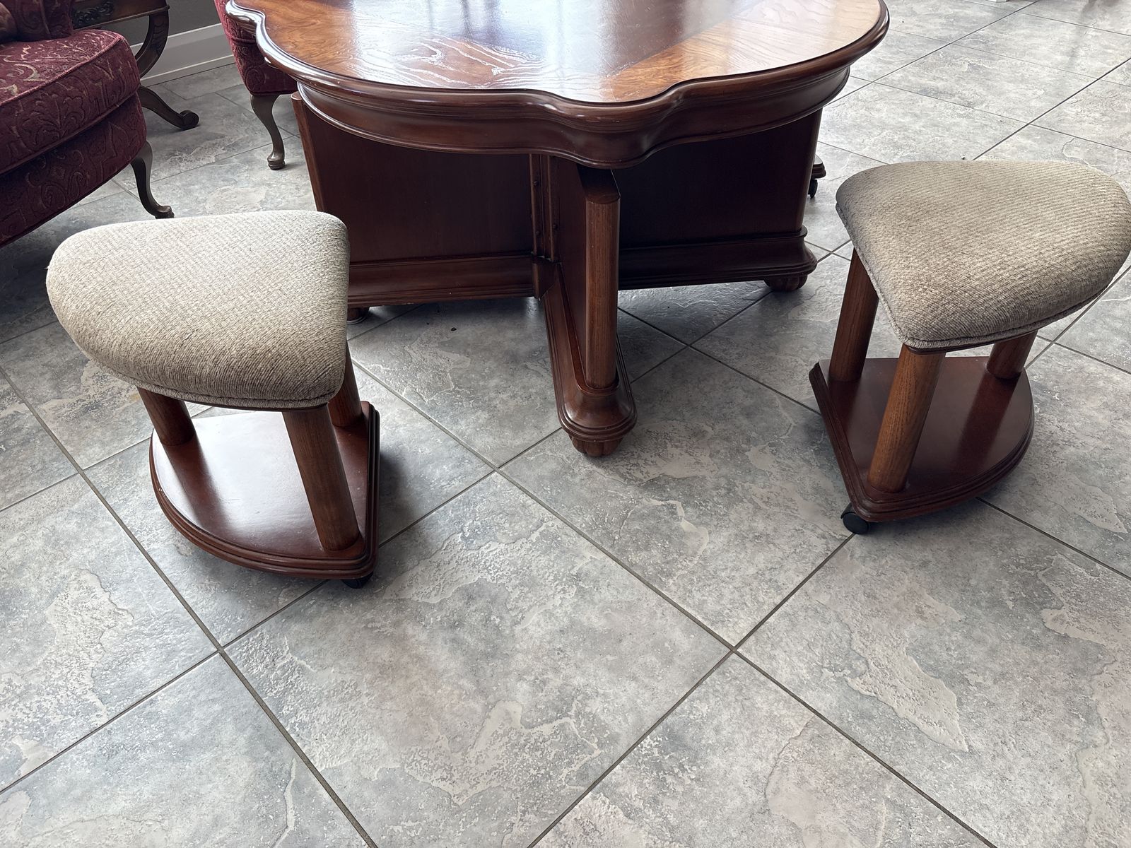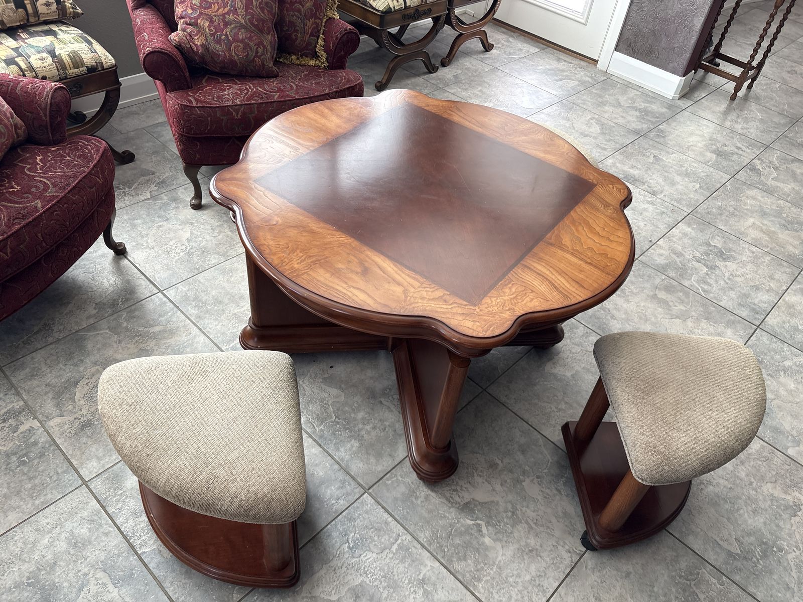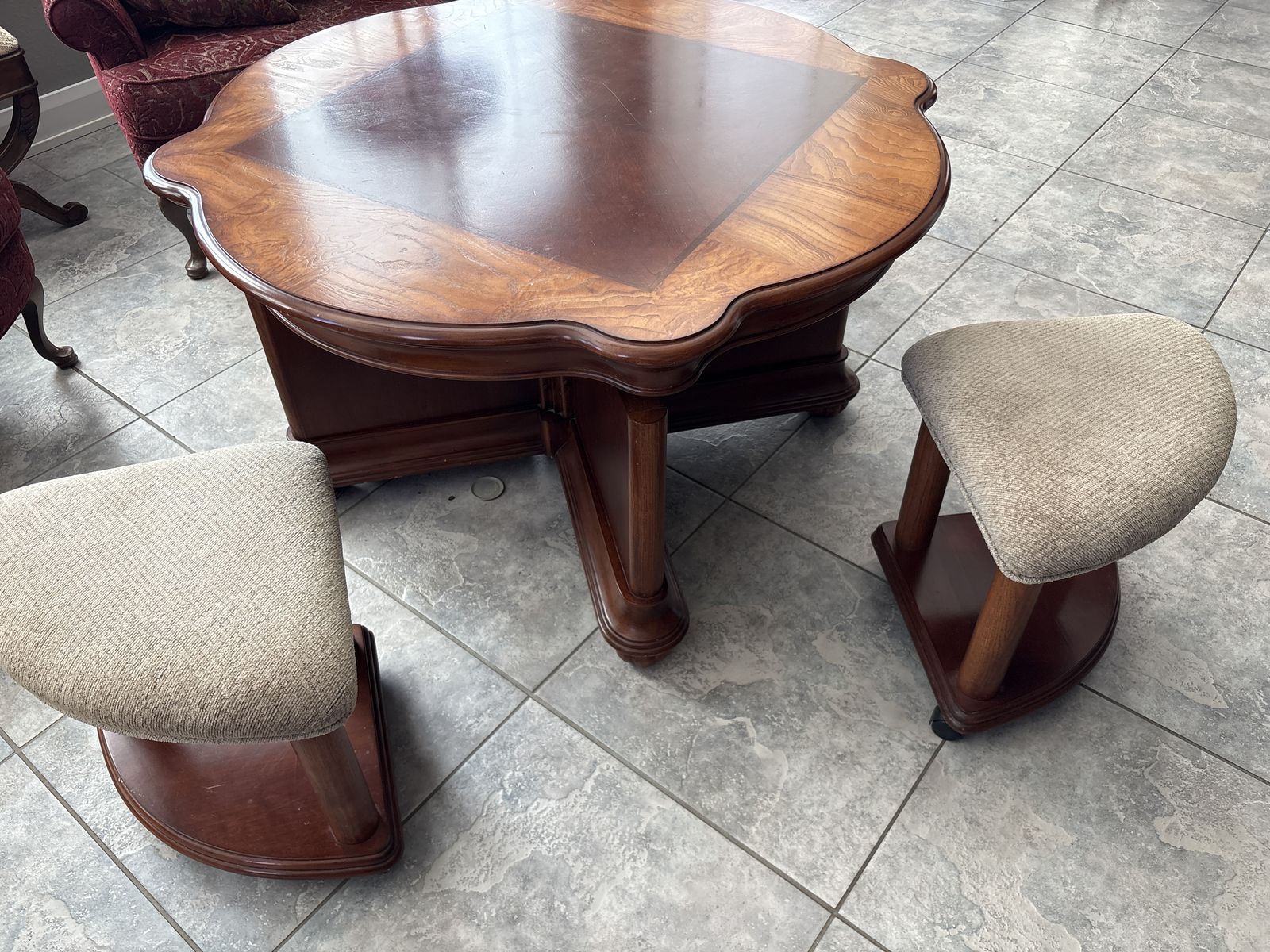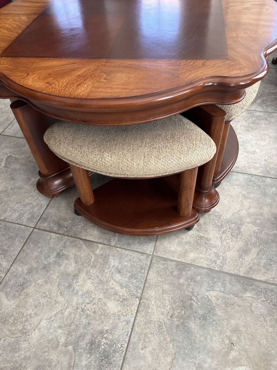 Beautiful Wood Coffee/Gaming Table with stools. This is a beautiful piece see photos for measurements