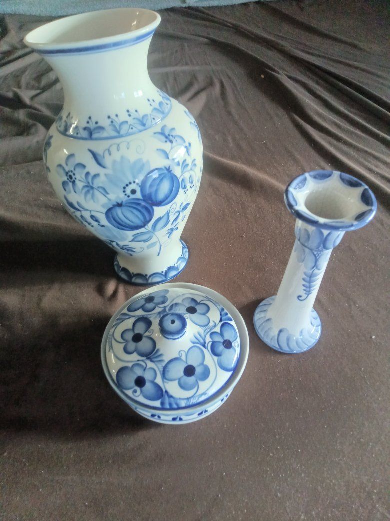 Blue and white vintage collectible vase set all or older but not of the same brands! The big vase I did research and it is made between 1986 and 1990 and it was Russian made and they fetch a good bit more than one I'm asking for all of these! $10