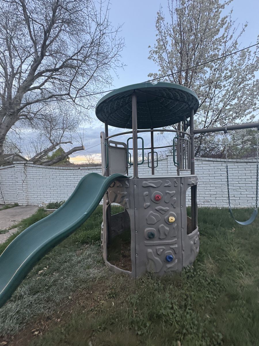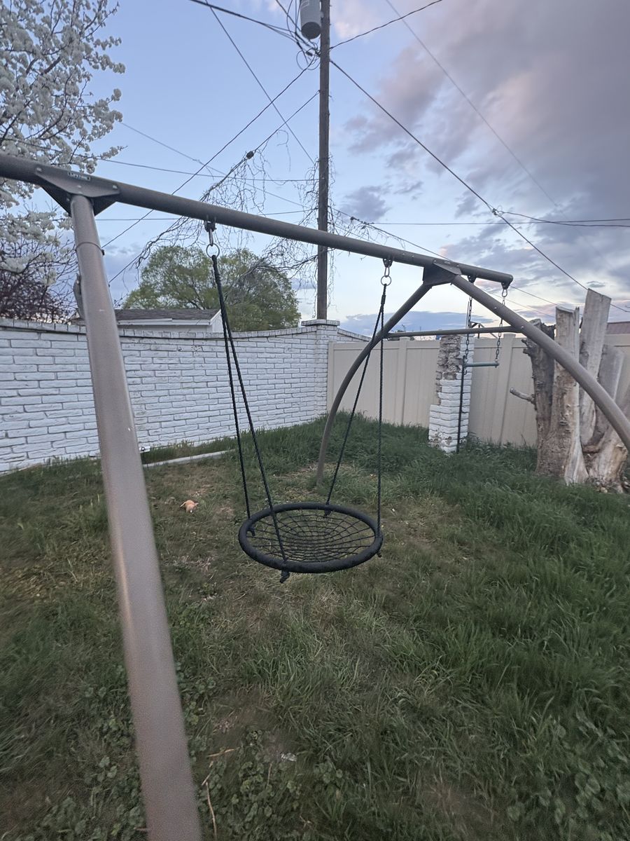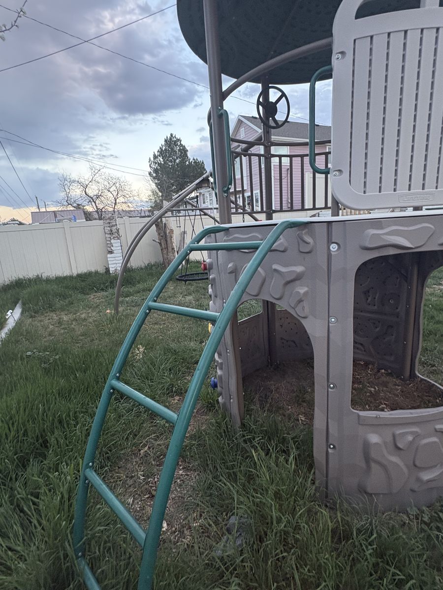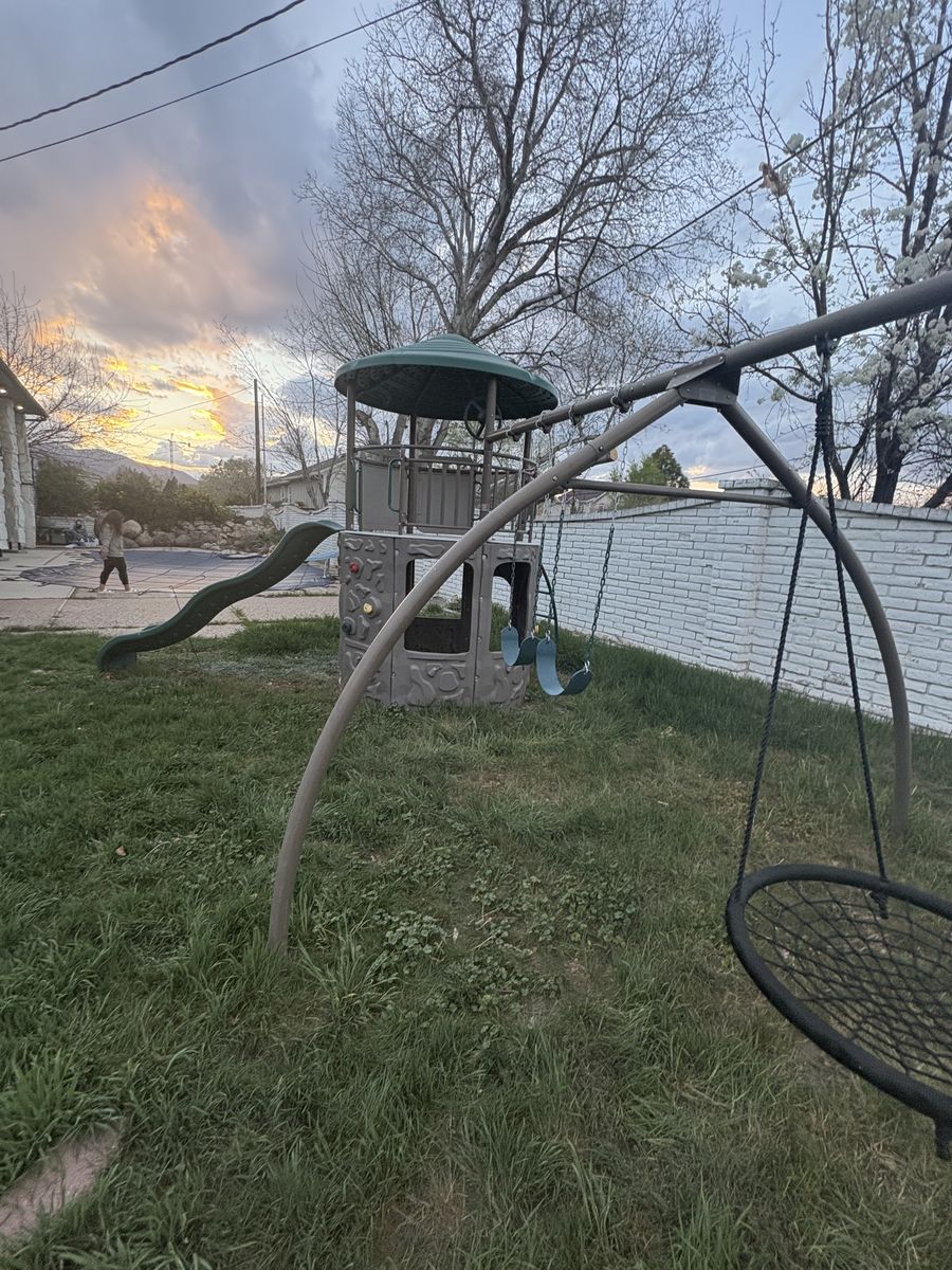 High-quality Lifetime brand backyard playset ready for a new home! Known for durability and long-lasting materials, this set includes a raised clubhouse with roof, slide, climbing wall, two belt swings, and a large saucer (nest) swing—perfect for kids of all ages.