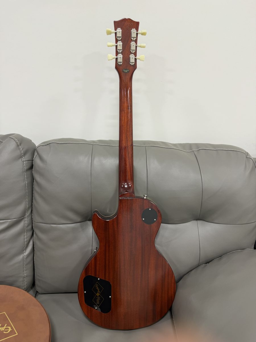 VenmoCrafted in partnership with Gibson Custom, it features a carved maple cap with a striking AAA flamed maple veneer over a solid mahogany body for incredible resonance and warmth. The one-piece mahogany neck with long tenon construction and the fast-playing 1960 SlimTaper™ profile offers enhanced sustain and a sleek, comfortable feel. Premium electronics include a pair of USA Gibson Custombucker humbuckers with Alnico 3 magnets, CTS® pots, Luxe Bumblebee capacitors, and a Switchcraft® toggle, delivering a rich, articulate vintage voice. Beautifully finished and paired with nickel hardware, cream binding, and a rosewood fretboard with mother-of-pearl trapezoid inlays, this guitar is as elegant as it is powerful. It ships in a brown Epiphone hardshell case with pink plush lining and “Inspired by Gibson Custom” graphics.