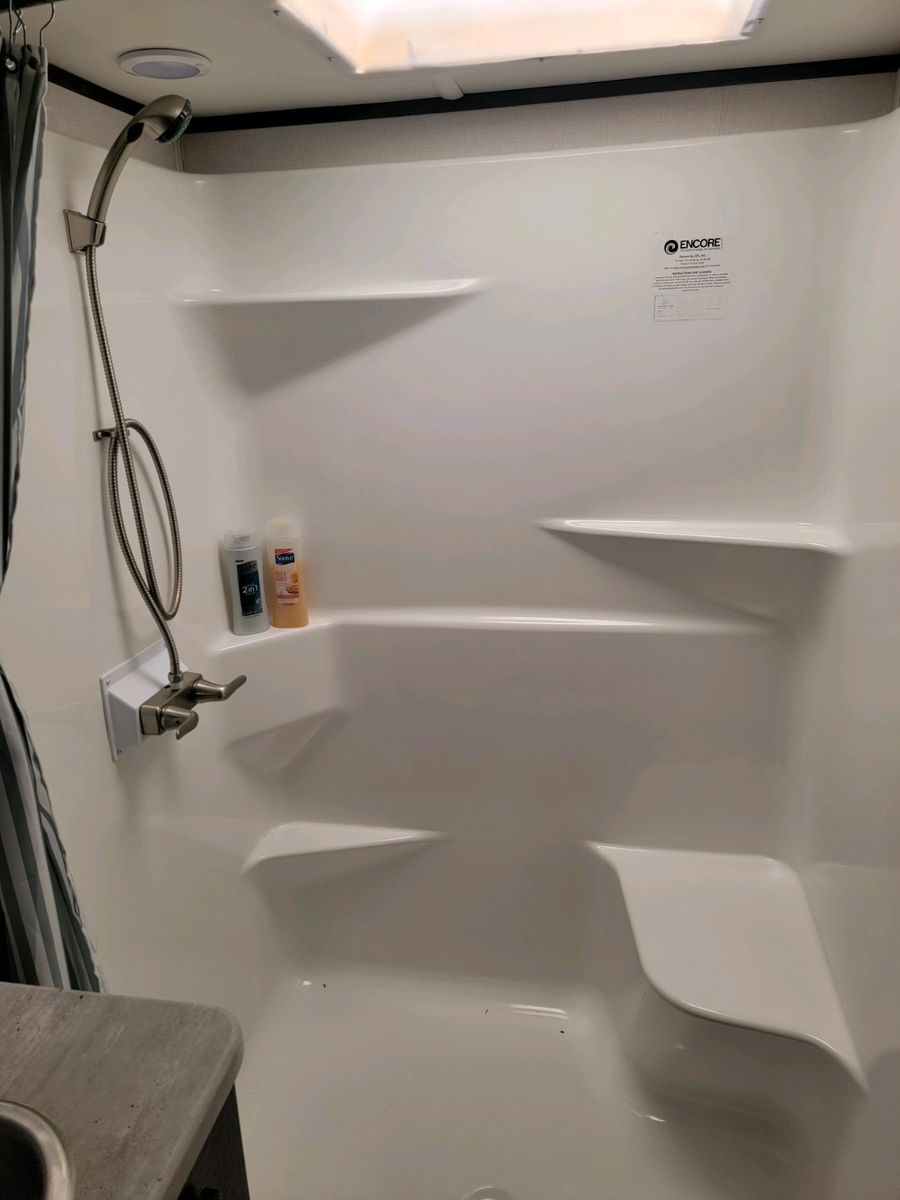 New upgraded 14 ply tires. Outdoor led lights up on awning and below steps, in front and behind trailer.