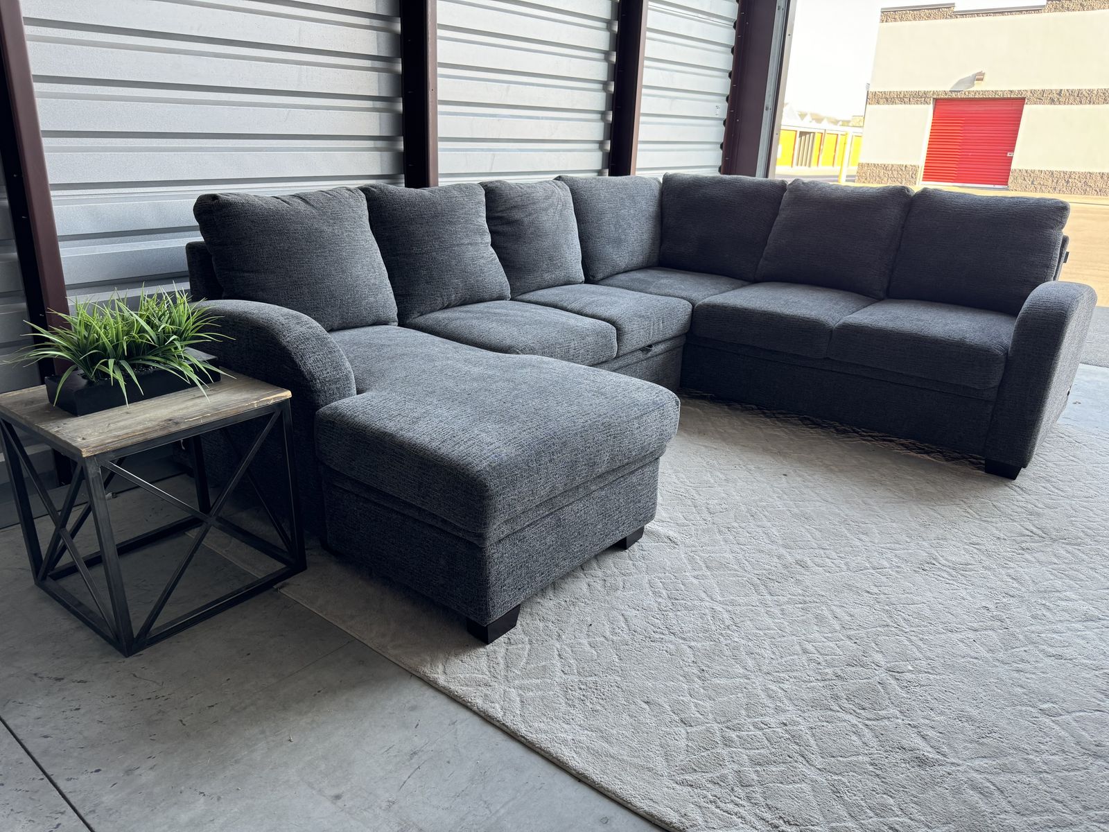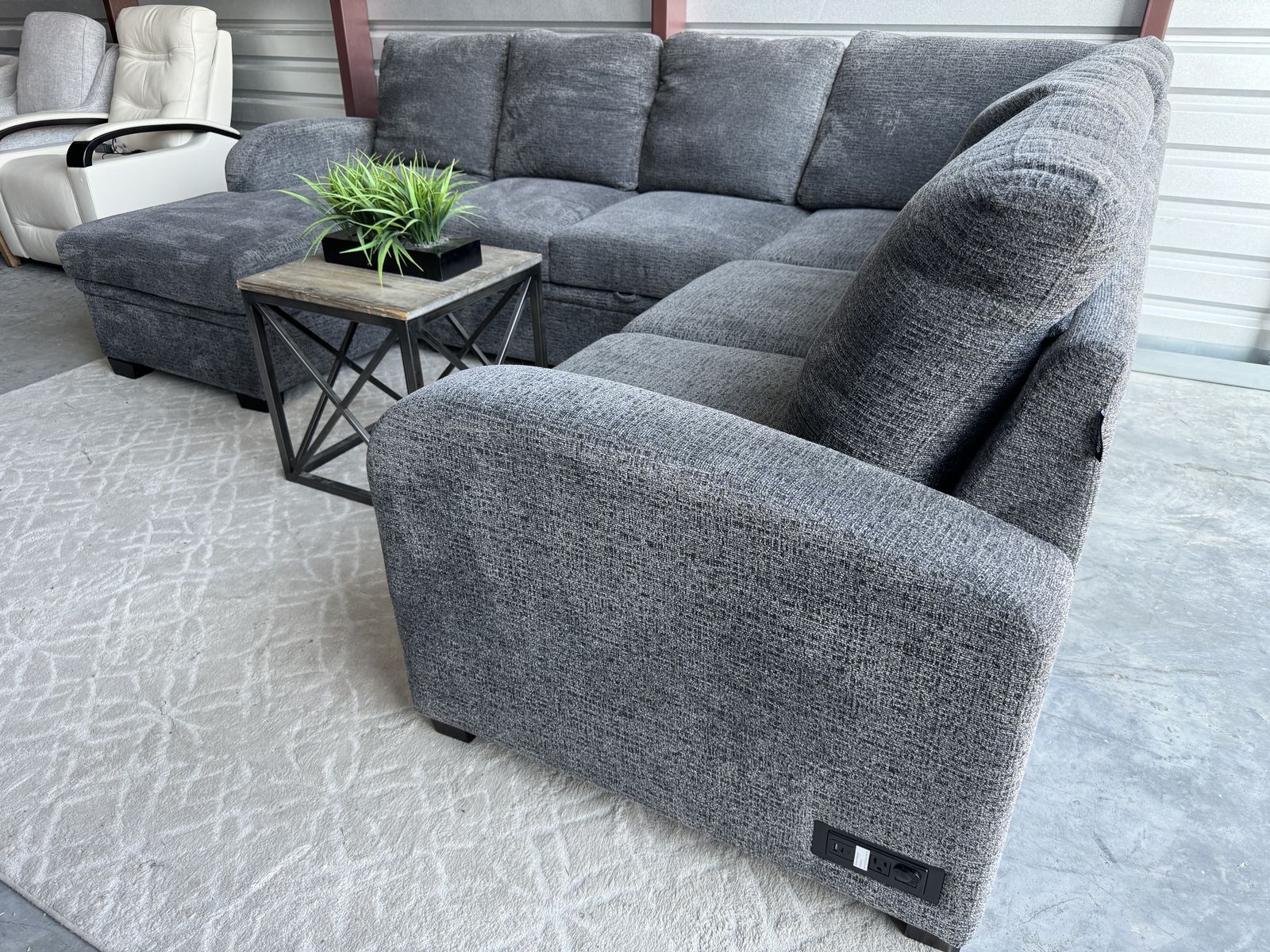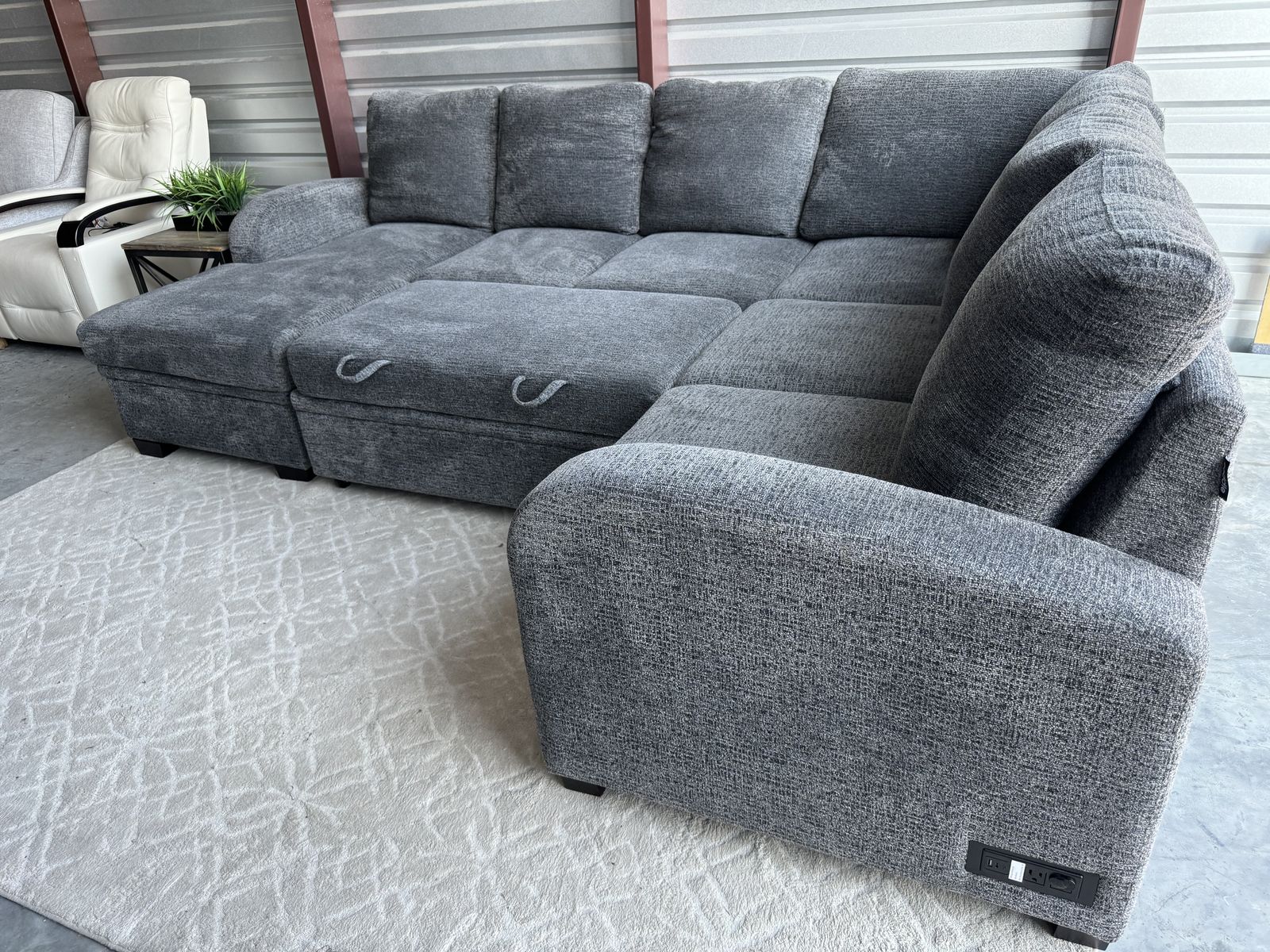 Features: Pullout Feature Converts Sectional into a 96” W x 46” D Pullout Bed Chaise with Storage Compartment 4 Power Outlets, 2 USB-A Ports & 2 USB-C Ports Removable Back Cushions Pocket Coil Seat Cushion