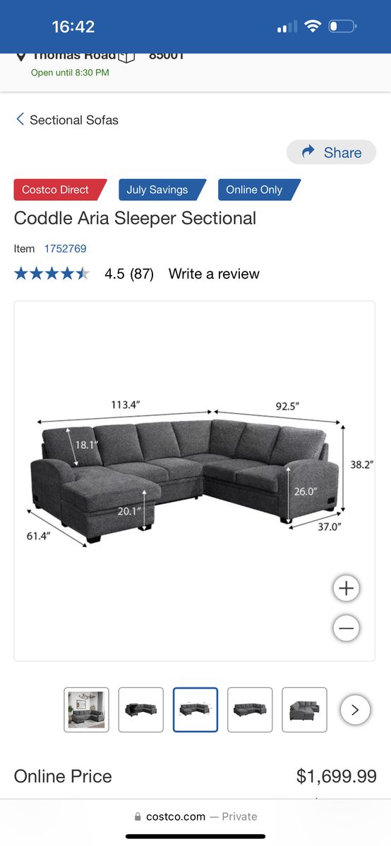 I am selling a Gray Costco Coddle Aria Sleeper Sectional Sofa Couch in good condition!
