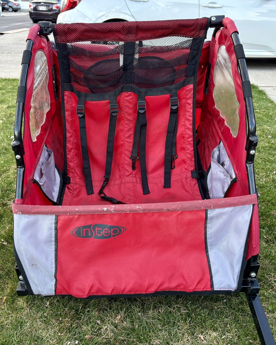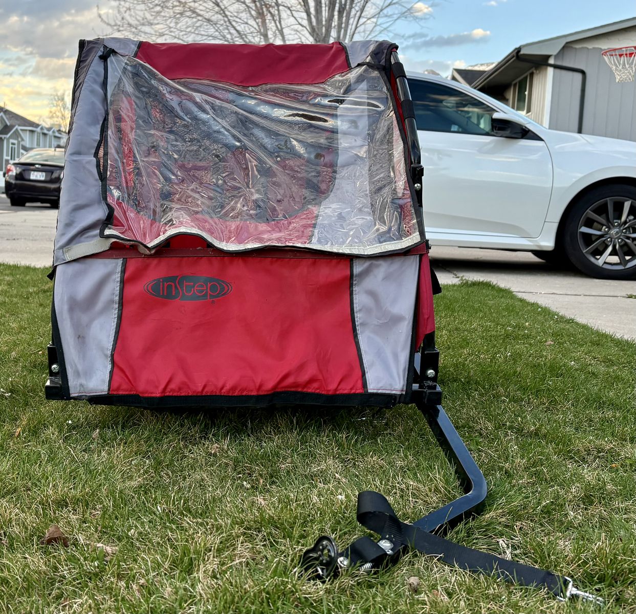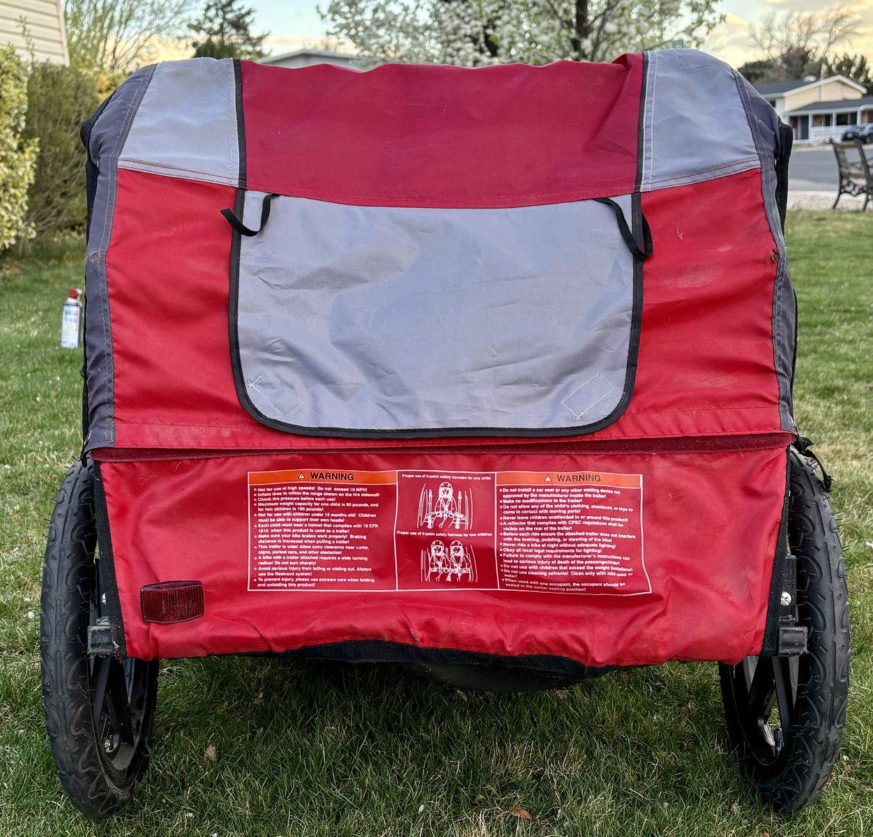 Bike trailer that holds up to two children. Has like new tires and I have added $20 worth of self sealing slime tubes to it so that you don’t have to worry about flat tires. Has everything needed to hook up to your bike and ride. Folds down nice and flat to fit in your vehicle. Has a breathable mesh cover and a weather shield for the cooler days. Located in Orem. Prefer cash. Thanks