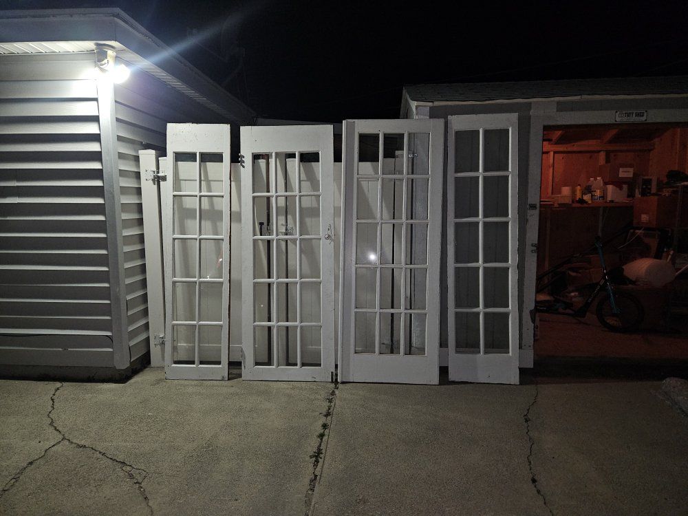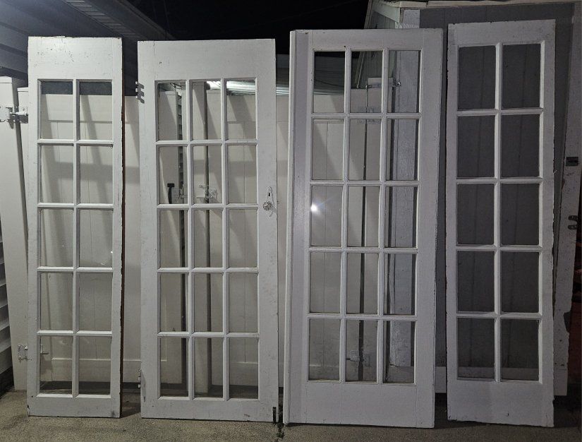 Features & Condition: Authentic 1943 Era: True divided lite construction. Complete Set: Includes the double French doors and the two matching vertical sidelights.