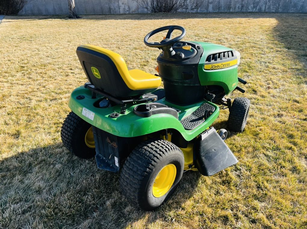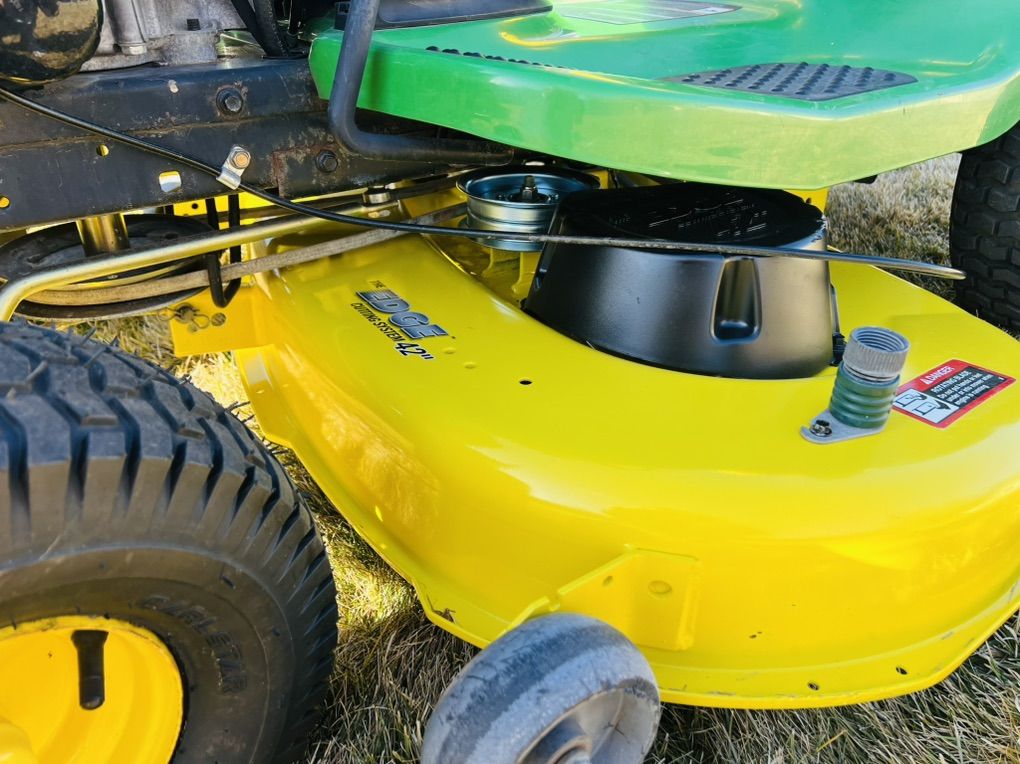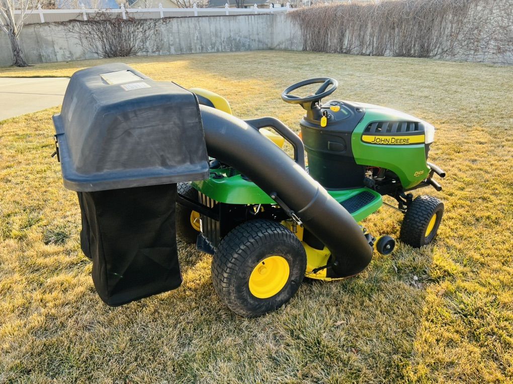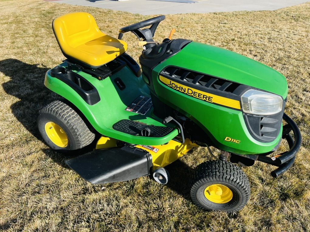 ZelleJohn Deere D110 riding lawn mower with bagger. This machine runs great with no problems. It has been fully serviced from top to bottom including greasing all the zerk fittings, joints, and bearings. The blades are brand new and mowing deck has been perfectly leveled. It has a 19.5HP Briggs & Stratton engine and foot pedal operated hydrostatic transmission. It only has 93 hours of use on it. It comes with a 42” wide mowing deck that’s in fabulous shape along with a bagger/grass catcher. Below is a list of all the parts that have been replaced as a part of the service that was done on it. All parts are genuine John Deere brand parts.