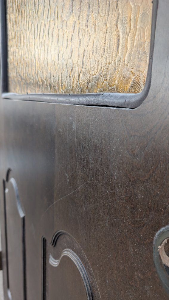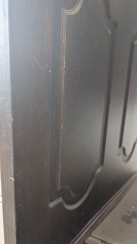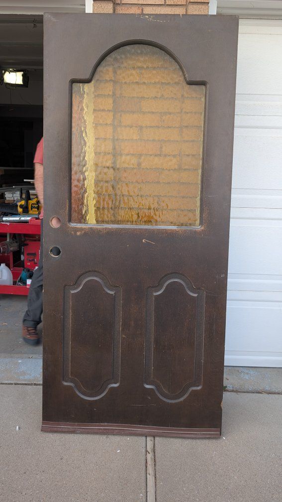 35 13/16" x 79 7/8" (1 3/4" thick) Antique door! Exterior door slab only. Solid wood with yellow glass. Right hand in swing. Some scuffs (pictured). Super solid and HEAVY door!