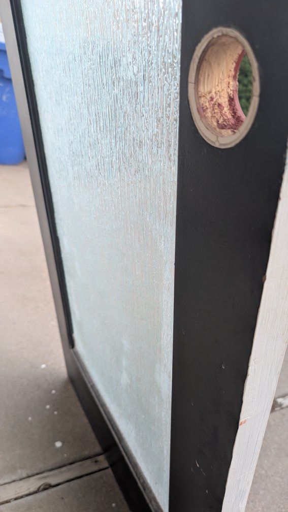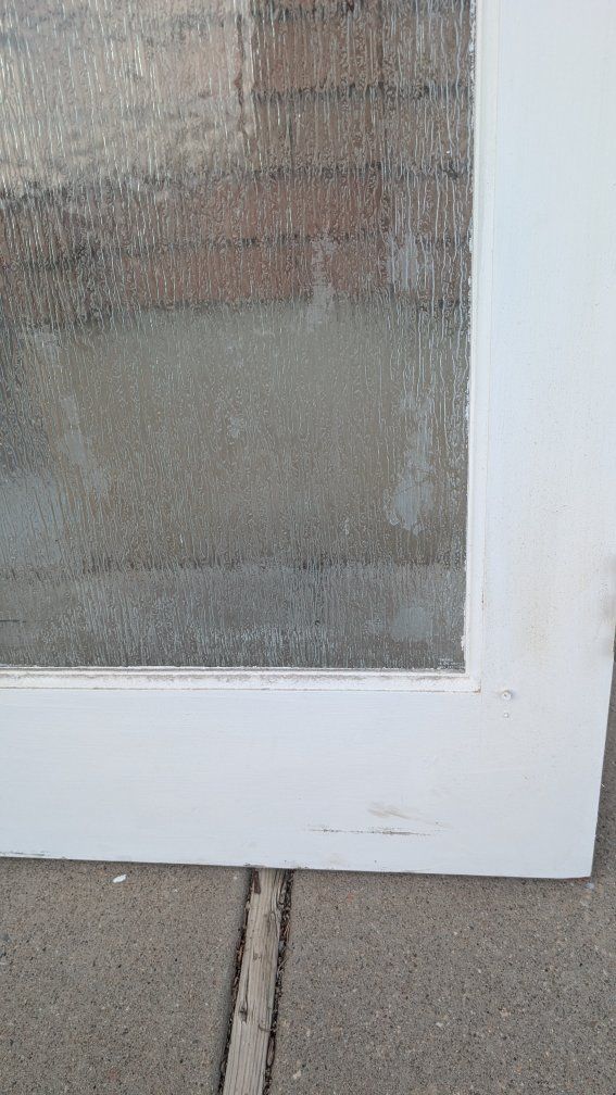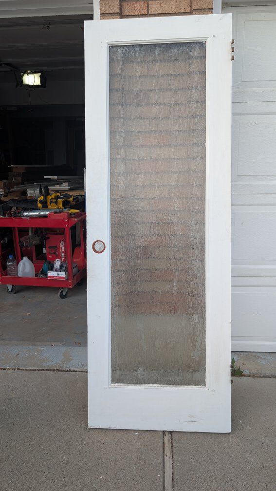27 7/8" x 79 5/16" ( 1 3/8 thick) Antique interior door slab, solid wood, clear waterfall glass. L hand in swing. Pick up in North Ogden.