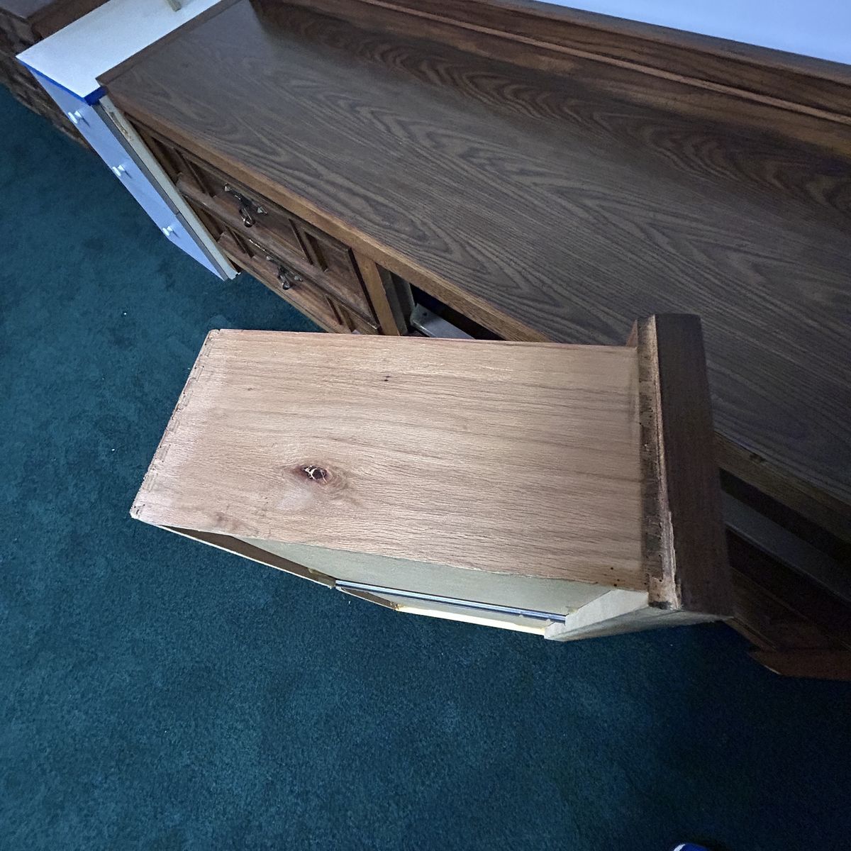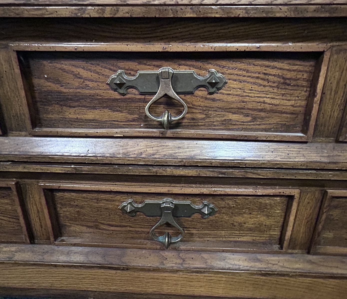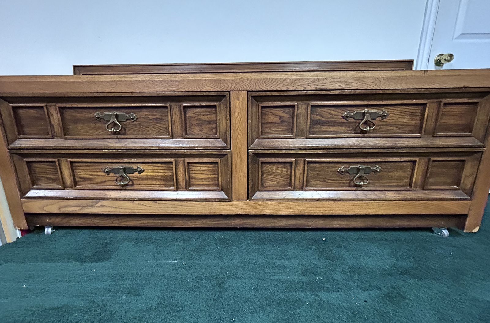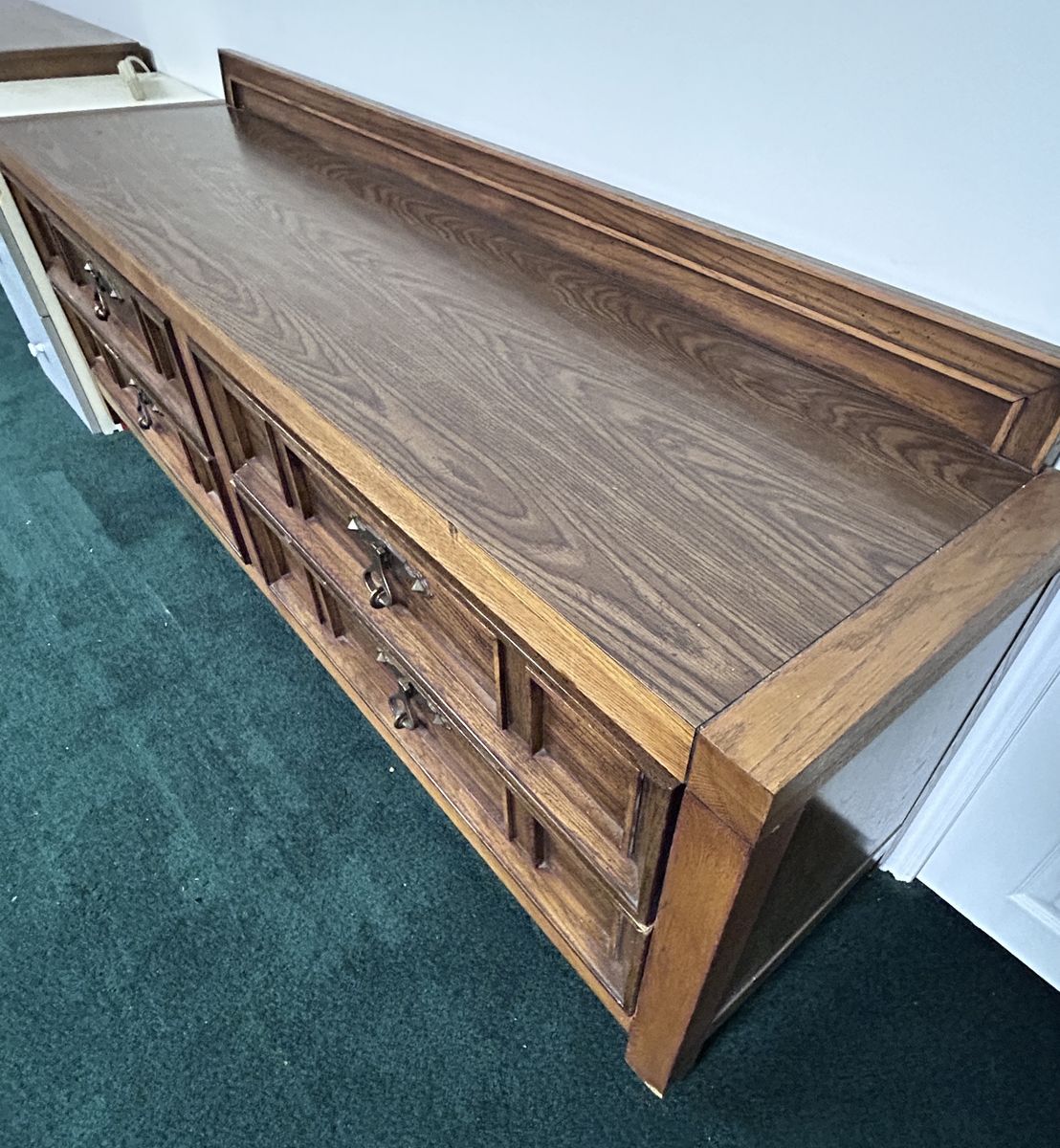 Chunky long mid-Century Modern Solid Wood traditional 4-drawer Dresser. The drawers are large for easier storage of bulky denim pants etc. Drawers are well made with dove-tailed joints. This fine pice of furniture has a nice back-stop to keep all your perfume bottles, jewelry, or serving pieces from tumbling off the back.
