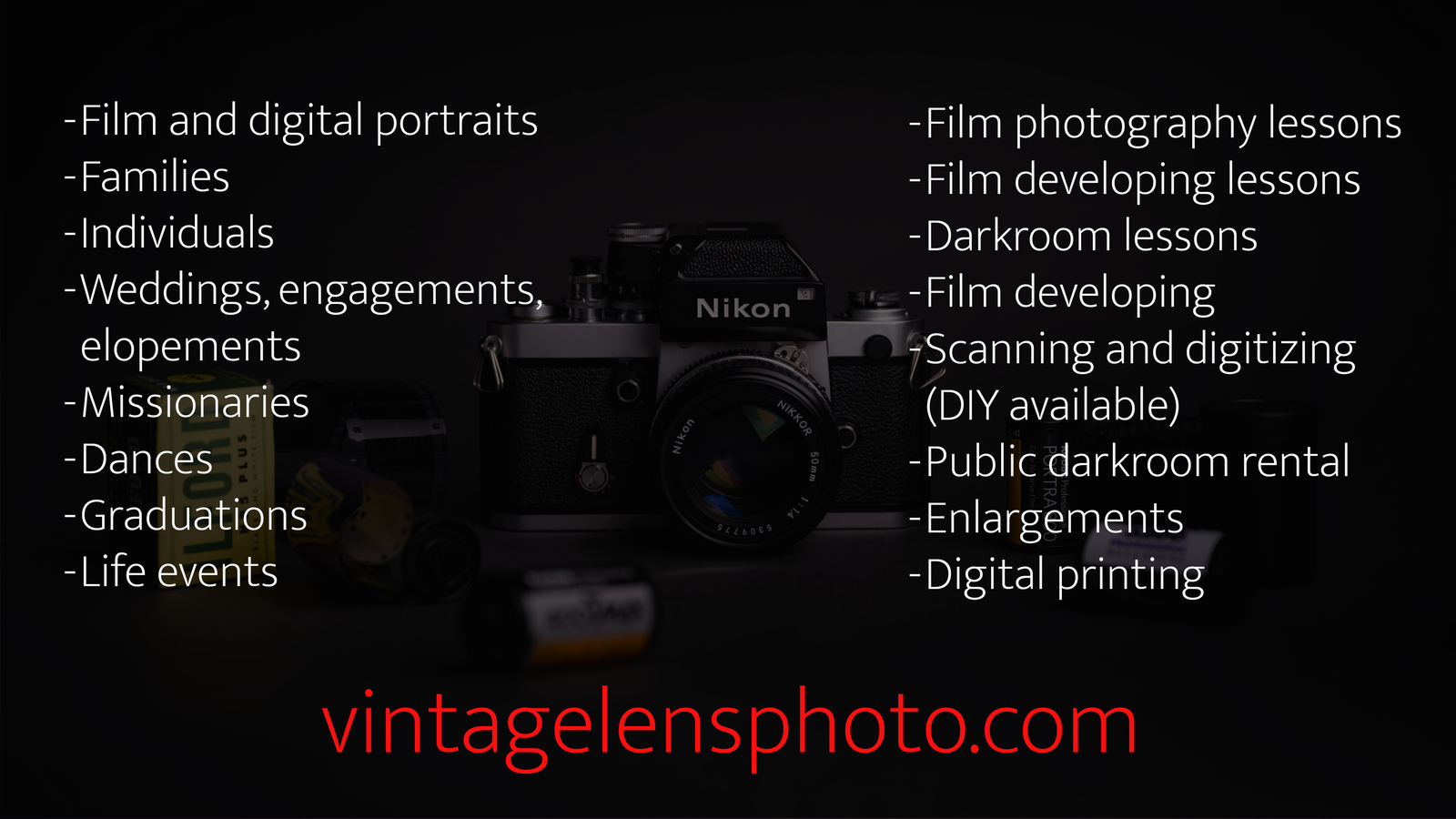 Looking for family or personal photos with a little more character? Something that stands out? Do you want to learn how to shoot and develop your own film? Print in a darkroom? Do you need film developed? The Vintage Lens offers all of these services and more! I have over 10 years doing professional portraits with digital and film cameras and five years as a licensed professional educator in Davis School District. Here's what we offer: