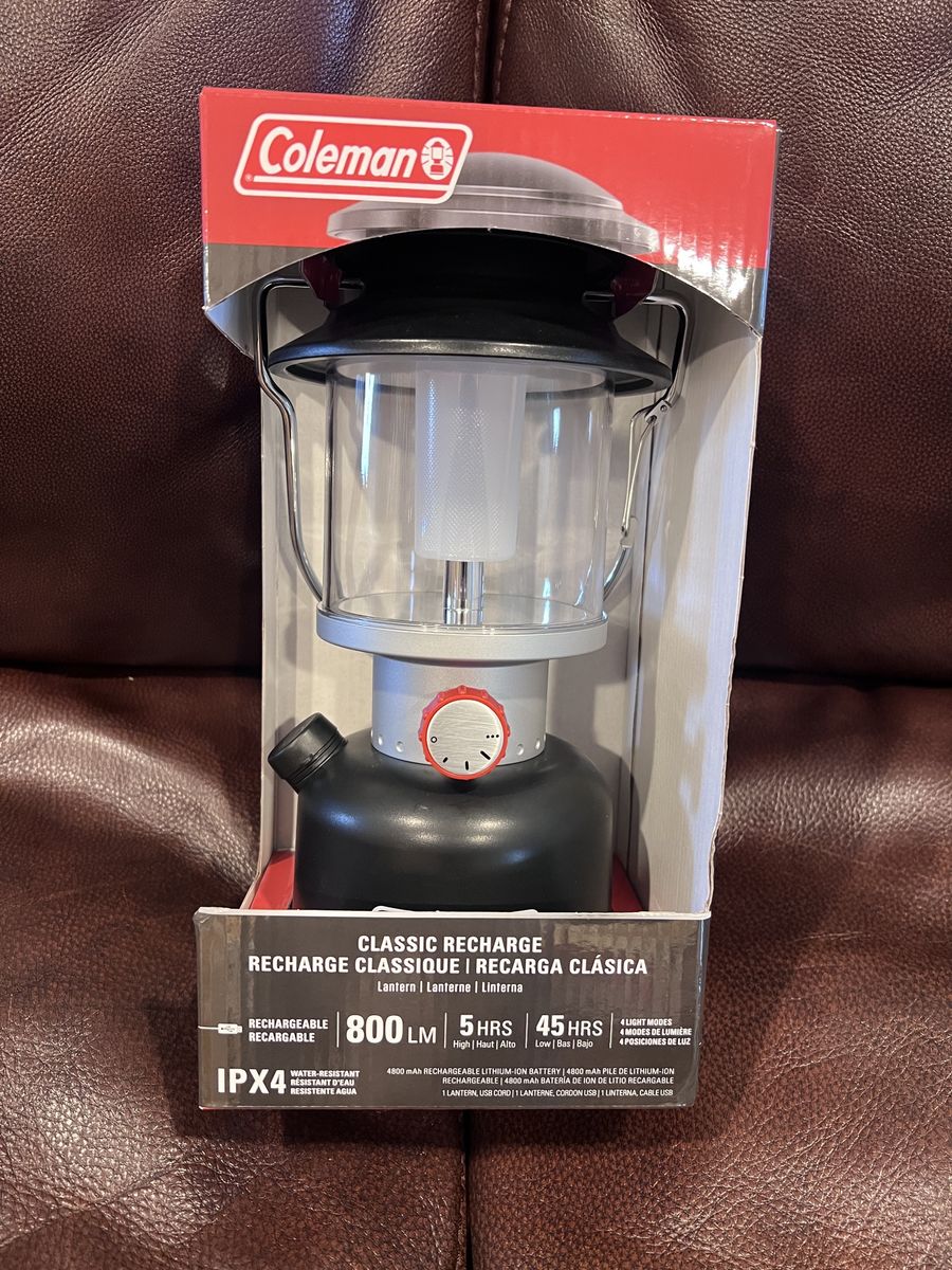 VenmoNew in the box, rechargeable Coleman 800 lumen lantern. Up to 45 hours of usage. These are on sale in box stores for $60+.