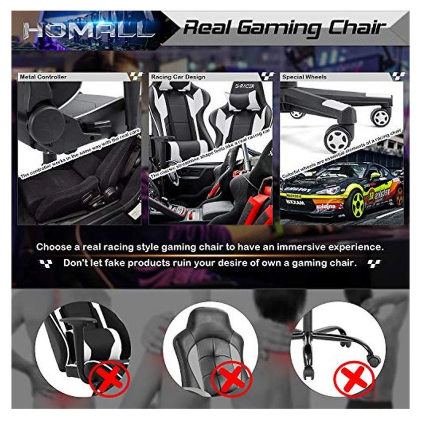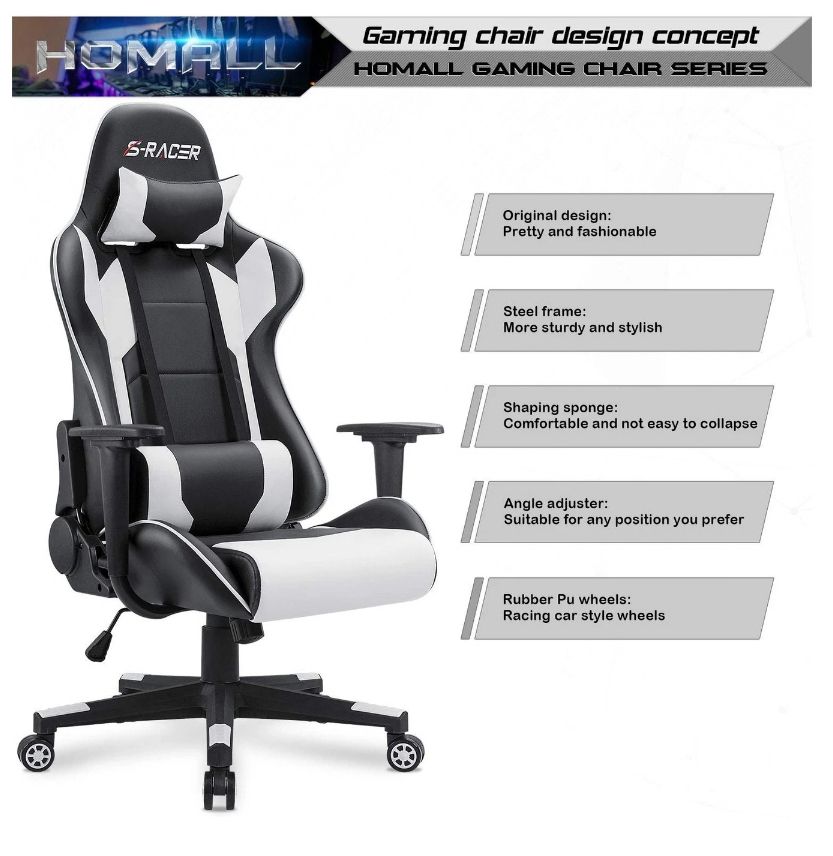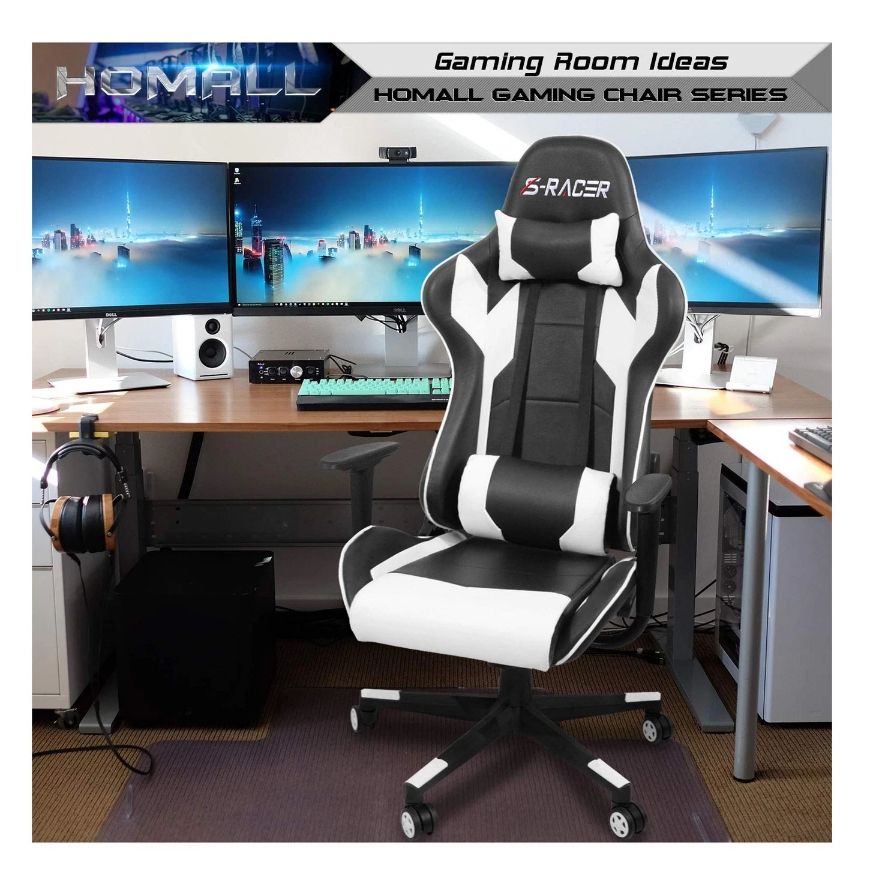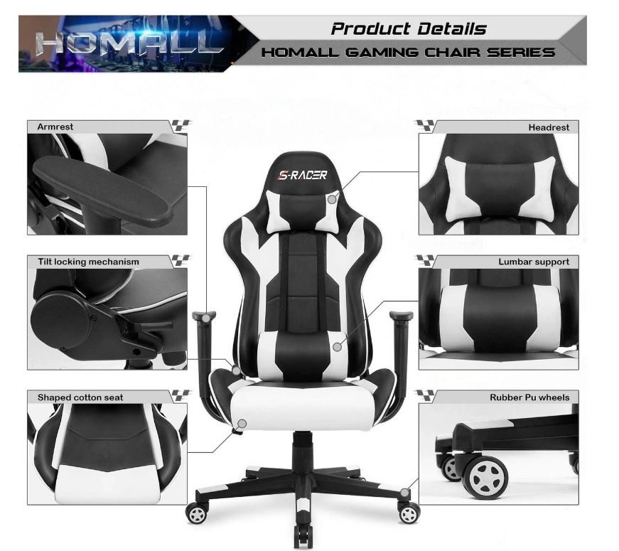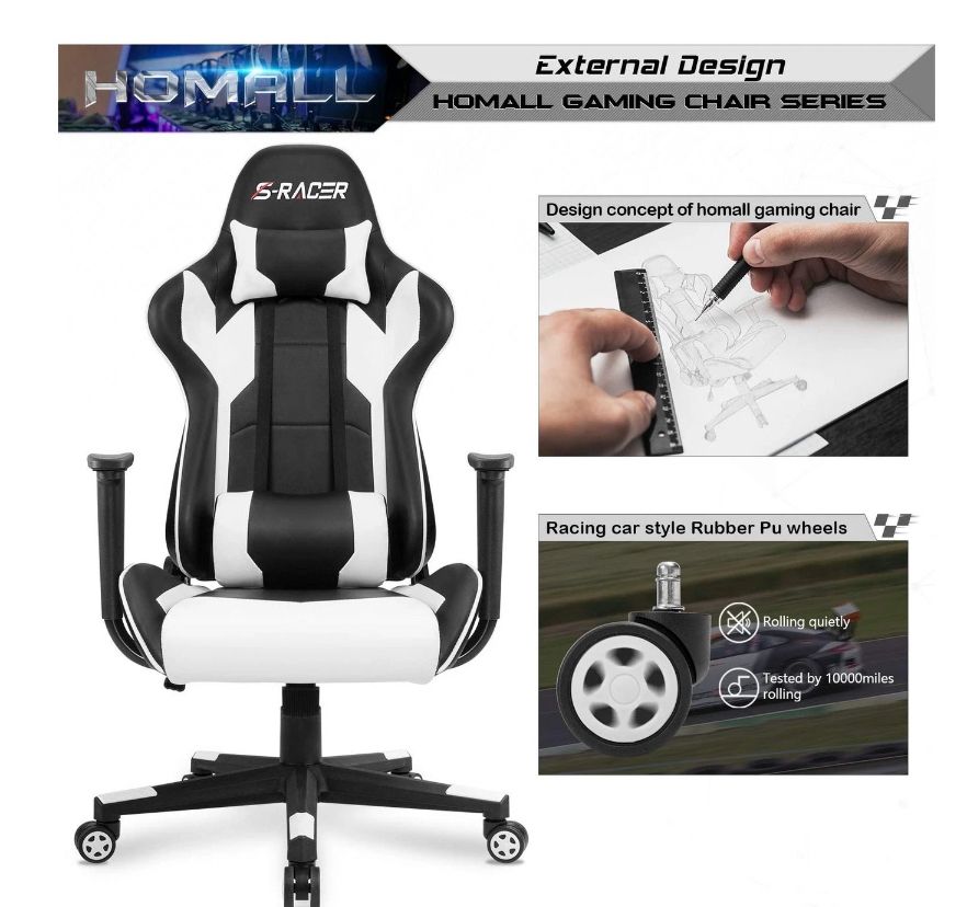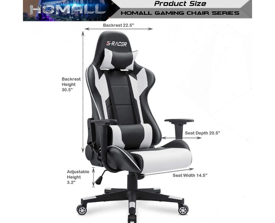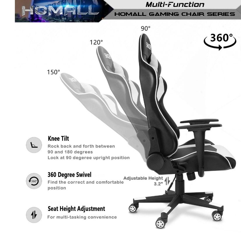 Selected Material: High density shaping foam, more comfortable, elasticity resilience and service life. 1.8mm thick steel frame, more sturdy and stable. Pu Leather, skin friendly and wear resisting. Upgraded Configuration: Class 3 gas lift, sturdy, reliable and supports up to 300lbs. Rubber casters, rolling quietly and tested by 1000 miles rolling. Multi Function: 360 degree swivel and multi direction wheels, load capacity: 300-pound maximum weight capacity. Recline function. Between 90 to 180 degree. Rocking function: chair can rock back and forth when you adjust the knob beneath the seat. Dimension: Size of back: 22.5 inch and 30.5 inch. Size of seat: 14.5 inch and 20.5 inch. Seat adjustable height: 17.3 to 21.5 inch. Wide Usage: This gaming chair is suitable for you to play computer games, watch show, do the work and have a rest. It will make your space more modern and elegant.