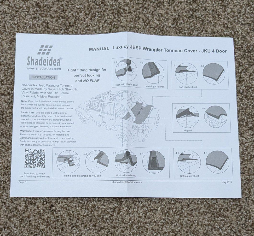 SUPER EASY AND FAST INSTALLATION: The Shadeidea premium tonneau cover installs in minutes utilizing the tub rails built into your 4 Door Wrangler JKU. No tools or additional hardware is required when installation and removed.