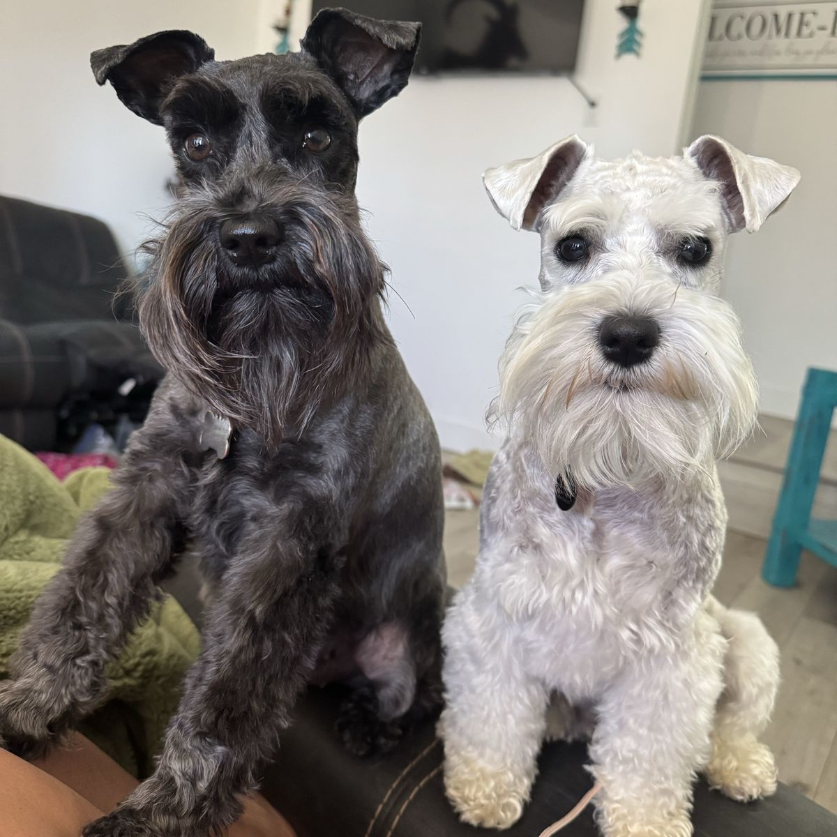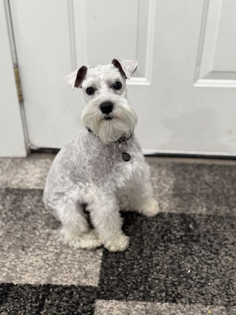 Zelle2 year old WHITE Mini Schnauzer Not papered. Dad is. Mom is not Photos as needed. Mom PURE BLACK Dad is soft gray and black. Family owned both mom and dad so know history.