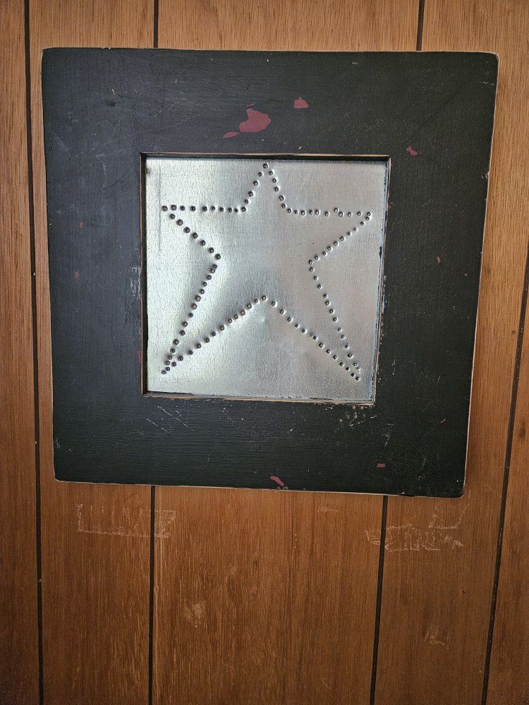 VenmoThis is a hammered metal star with a black wood frame that's been distressed. Measurements tall 13 1/4", wide 13 1/4". No damage, from a smoke and pet free home. I'm moving from a house to an apartment. Please see my other listings. Thank you!