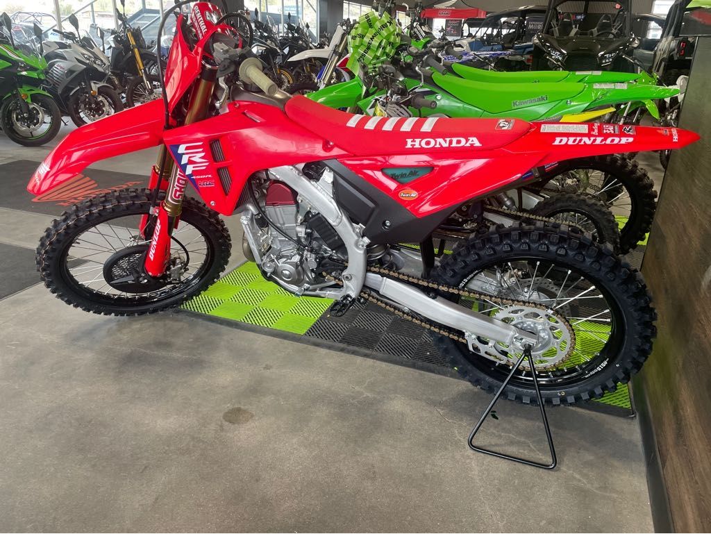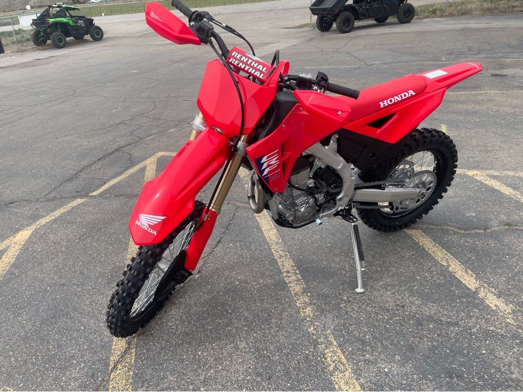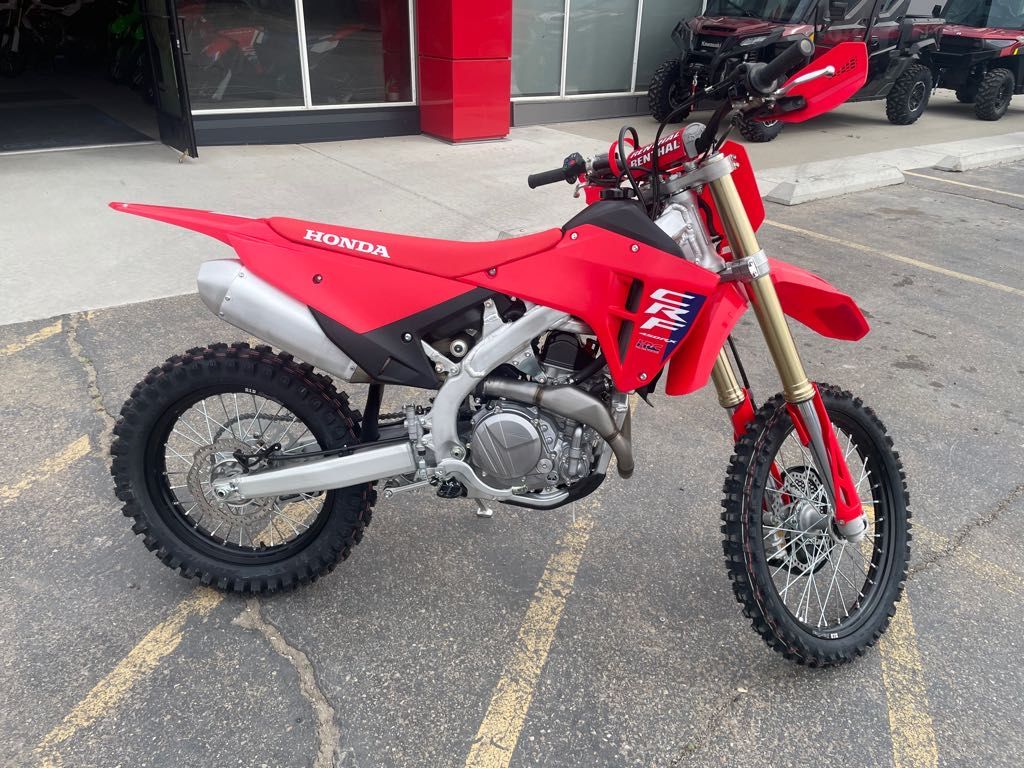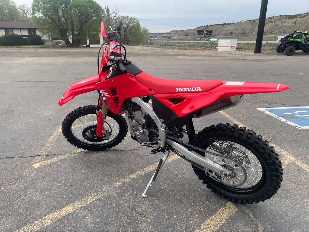Engine Type: Single-Cylinder Displacement: 27.4 cu. in. (449.8 cc) Bore and Stroke: Bore: 3.78 in. (96 mm); Stroke: 2.45 in. (62.1 mm) Cooling: Liquid Compression Ratio: 13.5:1 Fuel System: Gas Front Suspension: Inverted Fork Front Brakes: Disc Front Tire: Dunlop® Geomax AT81: 90/90-21 Rear Suspension: Twin Sided Swing Arm Rear Brakes: Disc Rear Tire: Dunlop® Geomax AT81: 120/90-18 Fuel Capacity: 1.7 gal. (6.4 L) Wheelbase: 58.2 in. (1478.3 mm) Ground Clearance: 13.1 in. (332.7 mm) Seat Height: 37.7 in. (957.6 mm) Trail: 4.6 in. (116 mm) Rake: 27.5 Transmission: Manual
