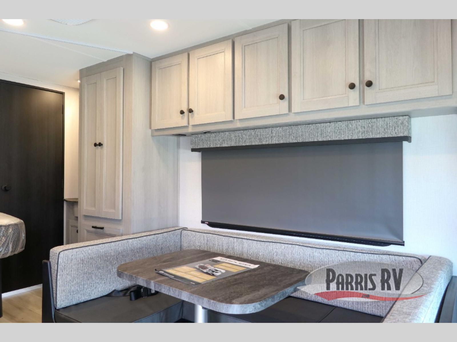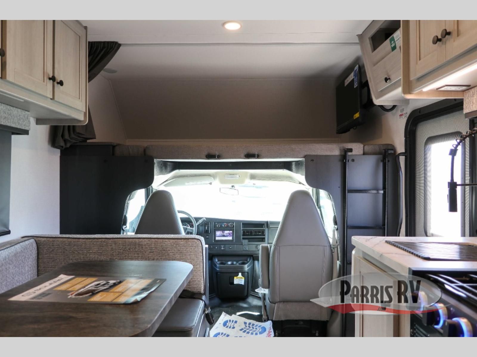 Start traveling in true luxury with this motorhome! The corner queen bed offers a comfortable night's rest, and is conveniently next to the rear corner bathroom which has a 24" x 32" shower and a vanity sink just outside it next to a wardrobe. Keep your bellies full with home cooked meals prepared with the three burner cooktop, the 10.7 cu. ft. refrigerator, and use the flip-up countertop for more counter space. You can eat your meals at the U-shaped dinette and transform it into an extra sleeping space too. The 60" x 80" bunk over cab also offers a comfortable sleeping space with a 12V TV for entertainment! This model is also available with a Ford E350 chassis; see model 22N for more details.