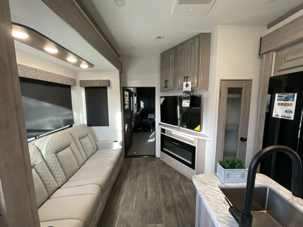 Make it a week of fun with this Voltage V-Series toy hauler featuring a 14' garage with sleeping for seven or eight thanks to the Bed Lift System over dual sofas and a dinette which convert to more sleeping in the garage area, a loft, and private front bedroom with queen bed. The main combined kitchen and living area features theater seating within a slide for added floor space and there is perfect viewing of the entertainment center and fireplace adjacent. You will enjoy full kitchen and bath amenities to keep you fueled and clean, and the half bath in the garage will make it easy for everyone. A 21' awning offers additional living space outside, and the second entry door within the garage space leads into that half bath for added convenience. This unit also offers ample storage with a full pass-through compartment, plus inside cabinets, dual closets, and under bed storage as well.
