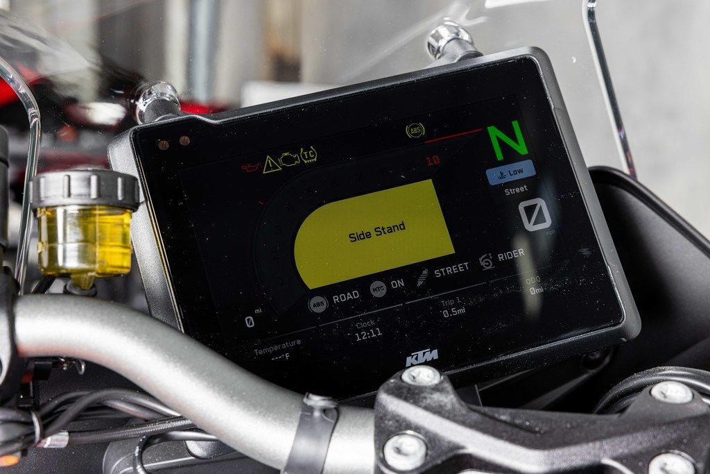 An all-new full color 7" TFT dashboard lifted from the KTM 1290 SUPER ADVENTURE S takes the KTM 1290 SUPER DUKE GT's dash into a different realm. Featuring a slew of features, from Turn-by-turn Plus navigation to a dedicated PERFORMANCE MODE, the display layout finds the ultimate balance between information, performance, and style.