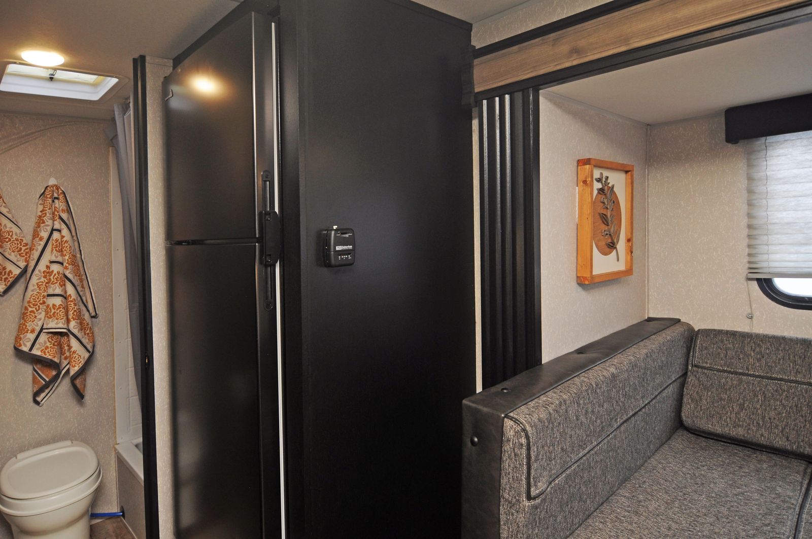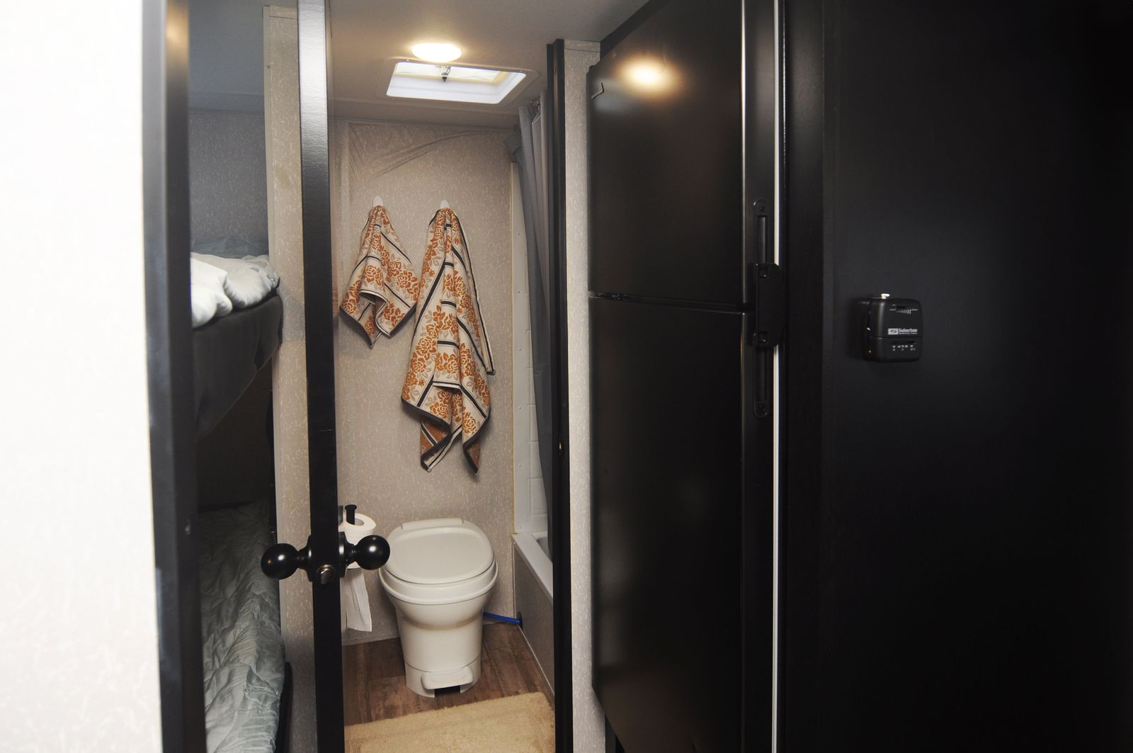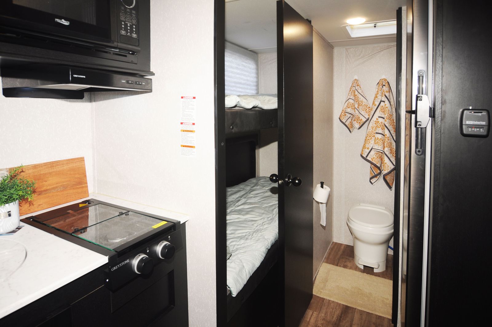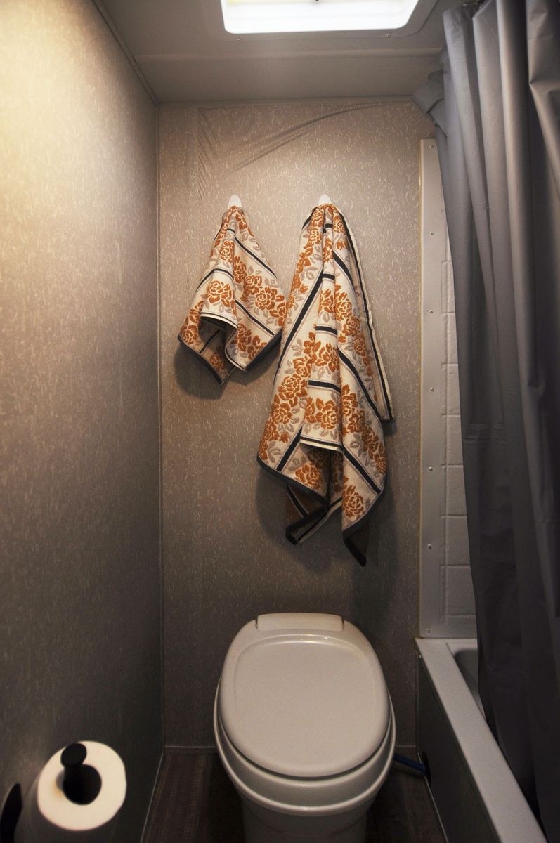 A full bathroom with shower, toilet, and sink so no late-night campground runs are needed.