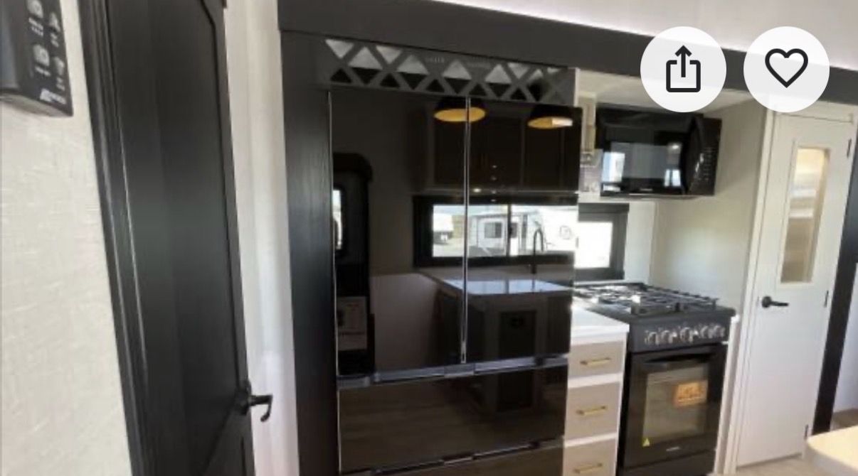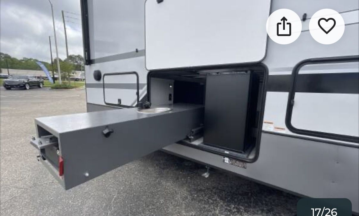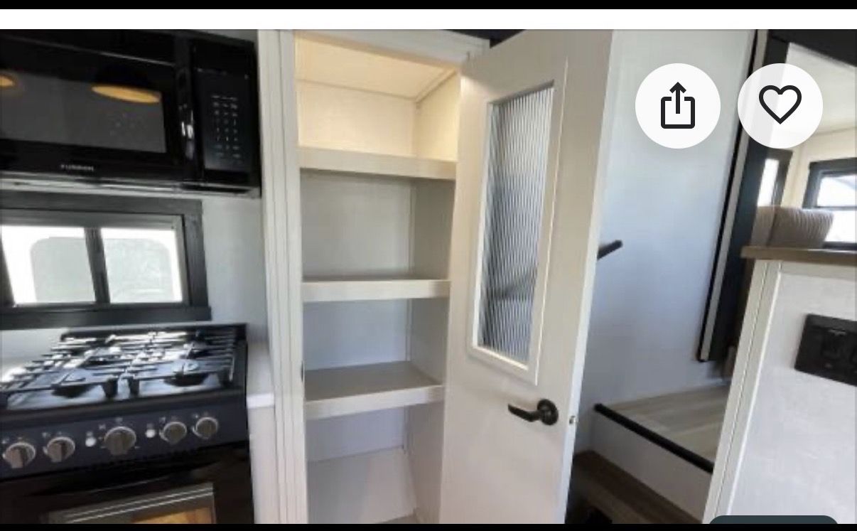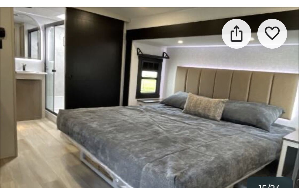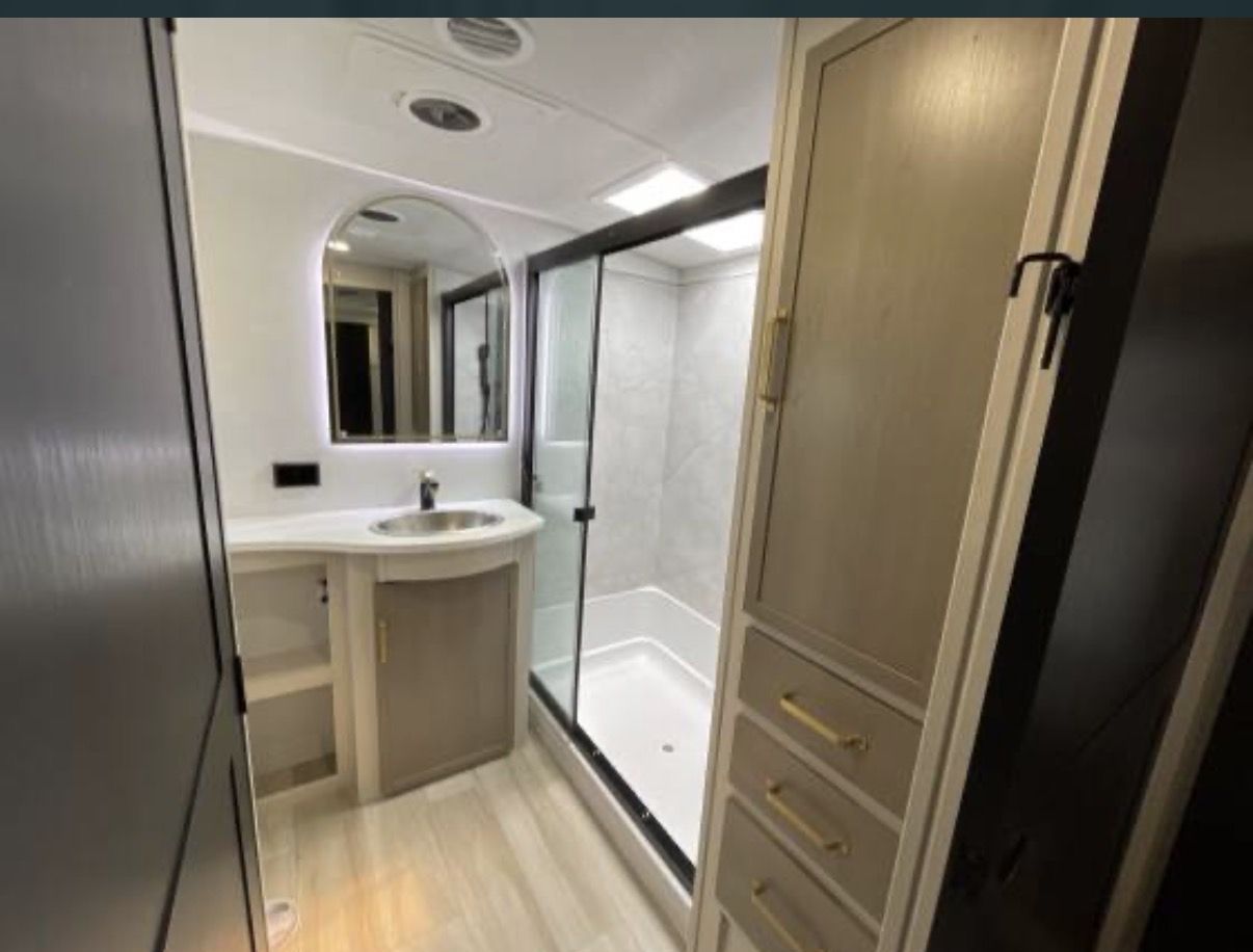 Travel or camping in total comfort!! It is 43 ft long x 8’ wide, it has 4 slides. It has 2 nd 1/2 bath right inside the door. You step in and to the left is bedroom with king bed at the back is a full-size shower. It has prep for washer/dryer. From the door you entry the kitchen with bar stools, full size fridge and oven big enough to cook a turkey. Large pantry and cabinets to complete the kitchen. You continue to front living room with 2 reclining chairs plus 2 couch that make into beds. The tv is above the fireplace and can drop behind so you can see thru the front window. It has self leveling, it have solar, all in the same area for plumbing stuff. Outside also has a slide out cabinet with grill , fridge and sink. In another area an outside tv, also lots of outside below storage with pull out large drawers. It is like new and beautiful inside and out. It is set up for full time living or enjoy the beautiful outdoors in comfort. It is a 4 season rv with heaters in the belly storage and tank areas. Books out at $70,000
